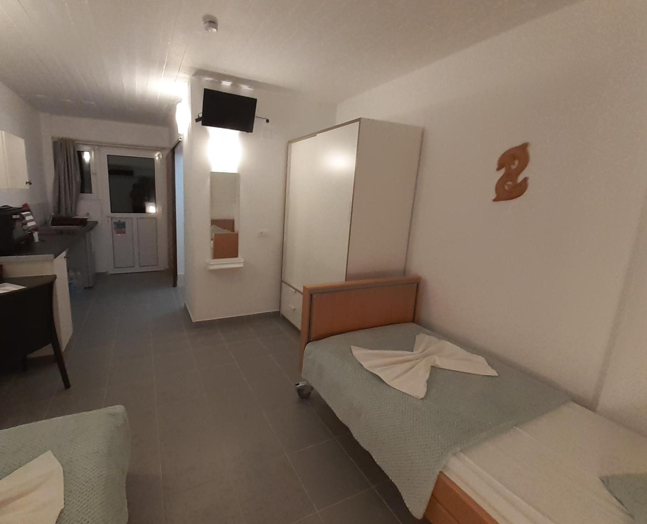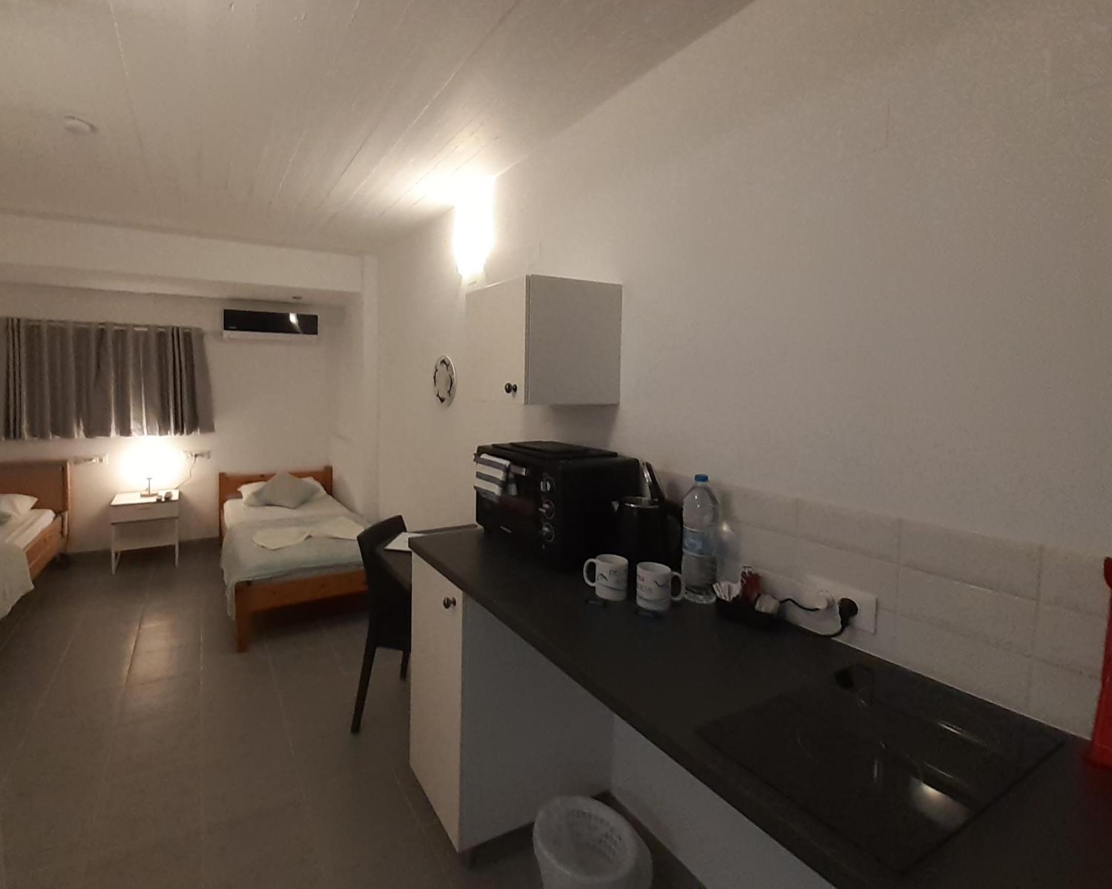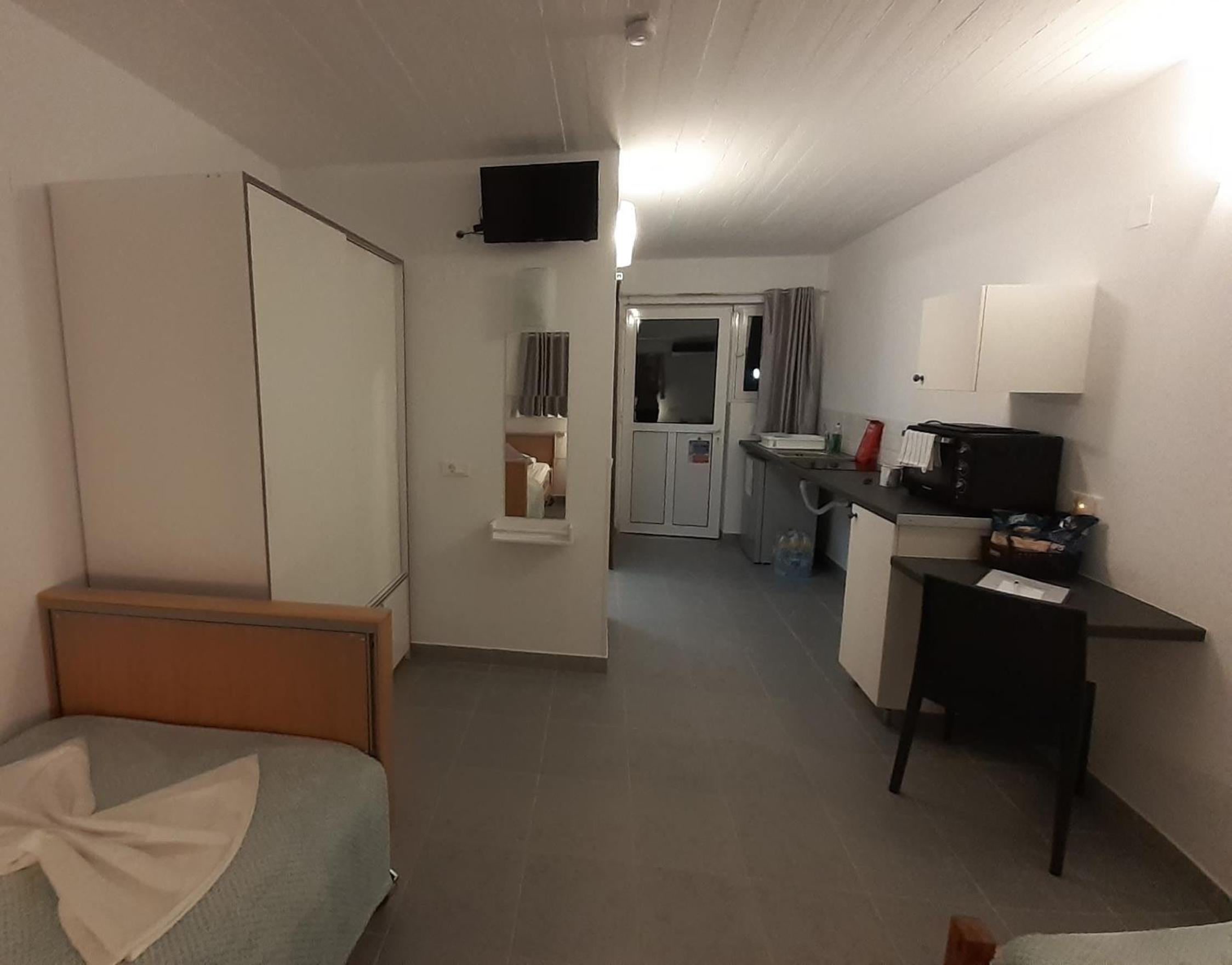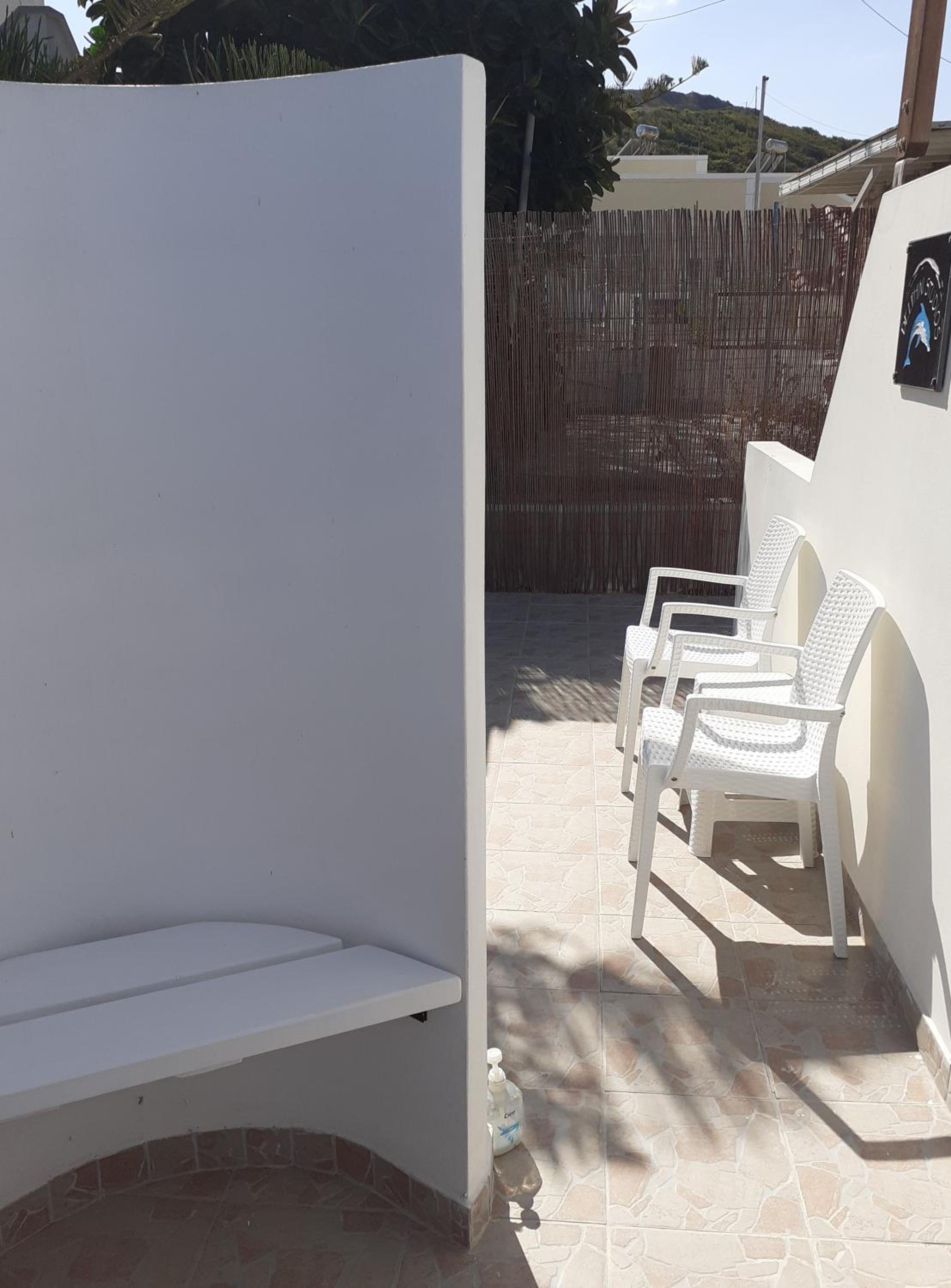 The studios are large, well designed and beautifully finished. The accessible shower room is superb with a powerful shower and plenty of hot water. There is good, free wifi, a free safe and a good sized fridge which was well stocked when we arrived. There is a large patio area at the front of each studio with good quality sun loungers and a small table and chairs. Unfortunately there is no view from the patios (apart from the boundary fence) but that is not uncommon for ground floor accommodation. Cat and Andy are great hosts, friendly and extremely helpful. They provided transfers to and from the airport for a very reasonable price, which was very helpful and convenient. The ladies who tidied and cleaned the rooms (Sammy and Jean) were always friendly and helpful and kept the studio immaculate. The beach is around 250 yards away and there are half a dozen or more tavernas within that distance, plus a small supermarket right next door to the studios.