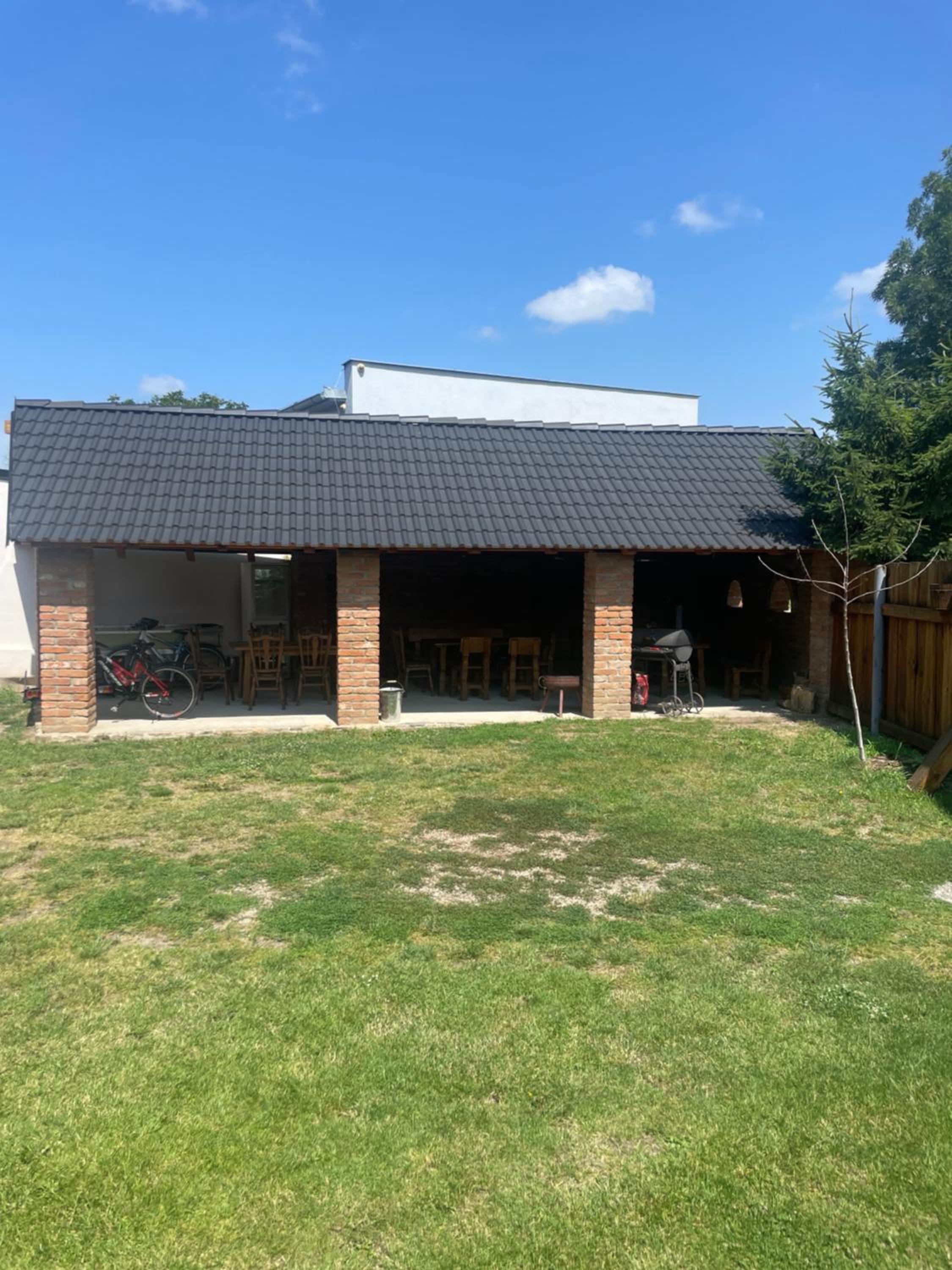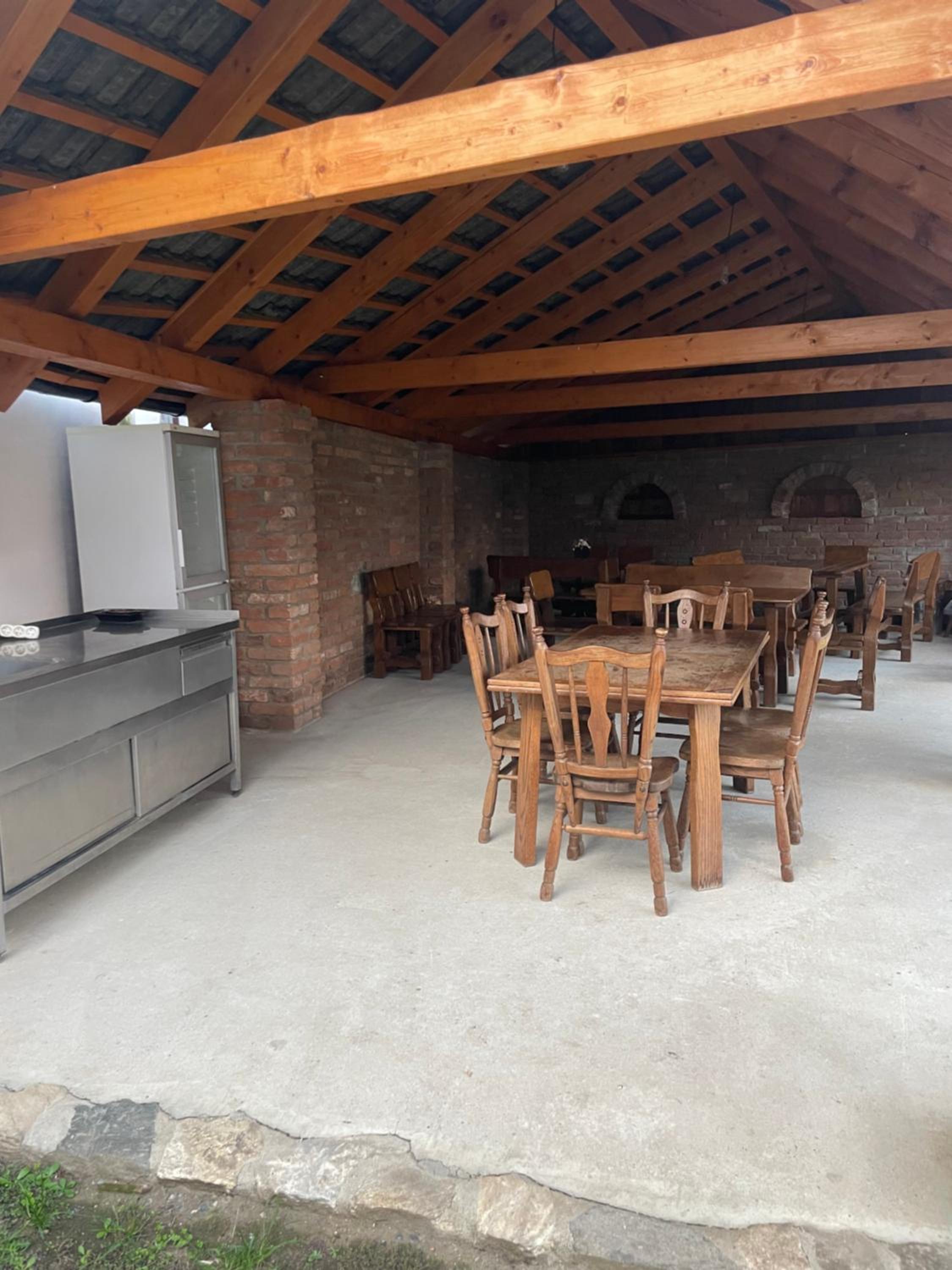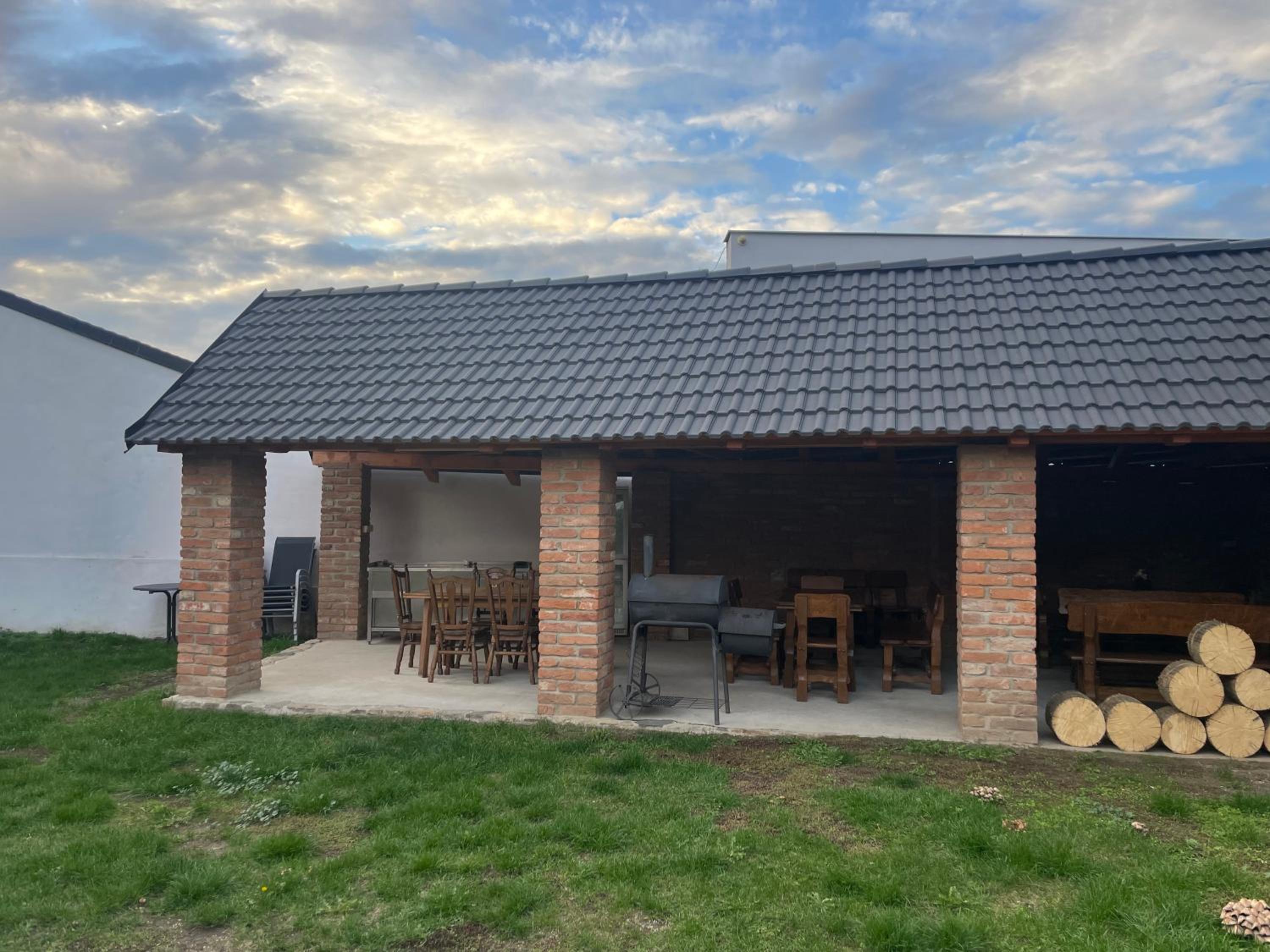 Schöner Außenbereich mit überdachter rustikaler Sitzgruppe. Grill, Arbeitsplatte und Kühlschrank außen vorhanden.