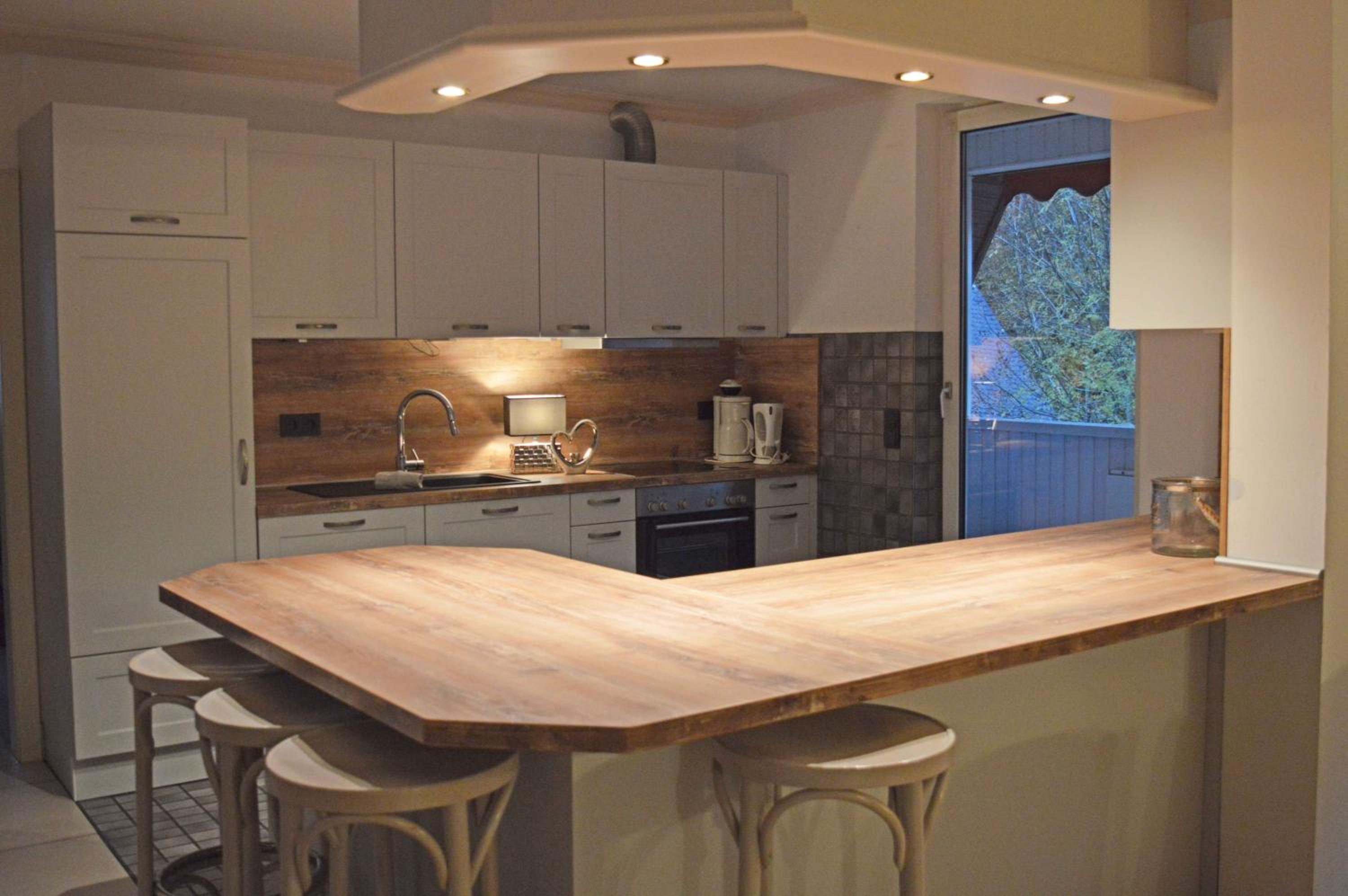 Küche mit spartanischer Ausstattung, kein Geschirrspüler, wenig Geschirr, keine Weingläser, keine Untersetzer für heiße Töpfe, keine Beleuchtung über Arbeitsplatte.