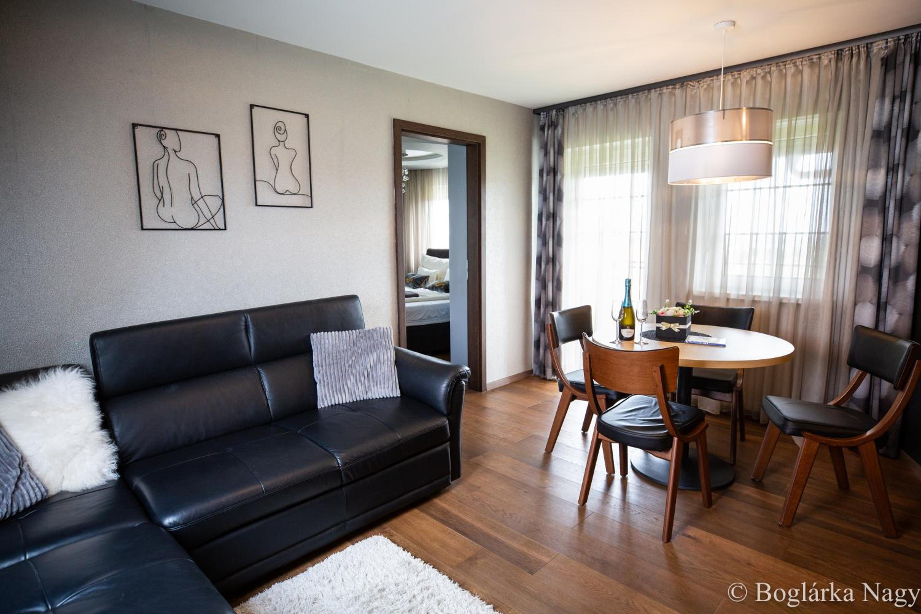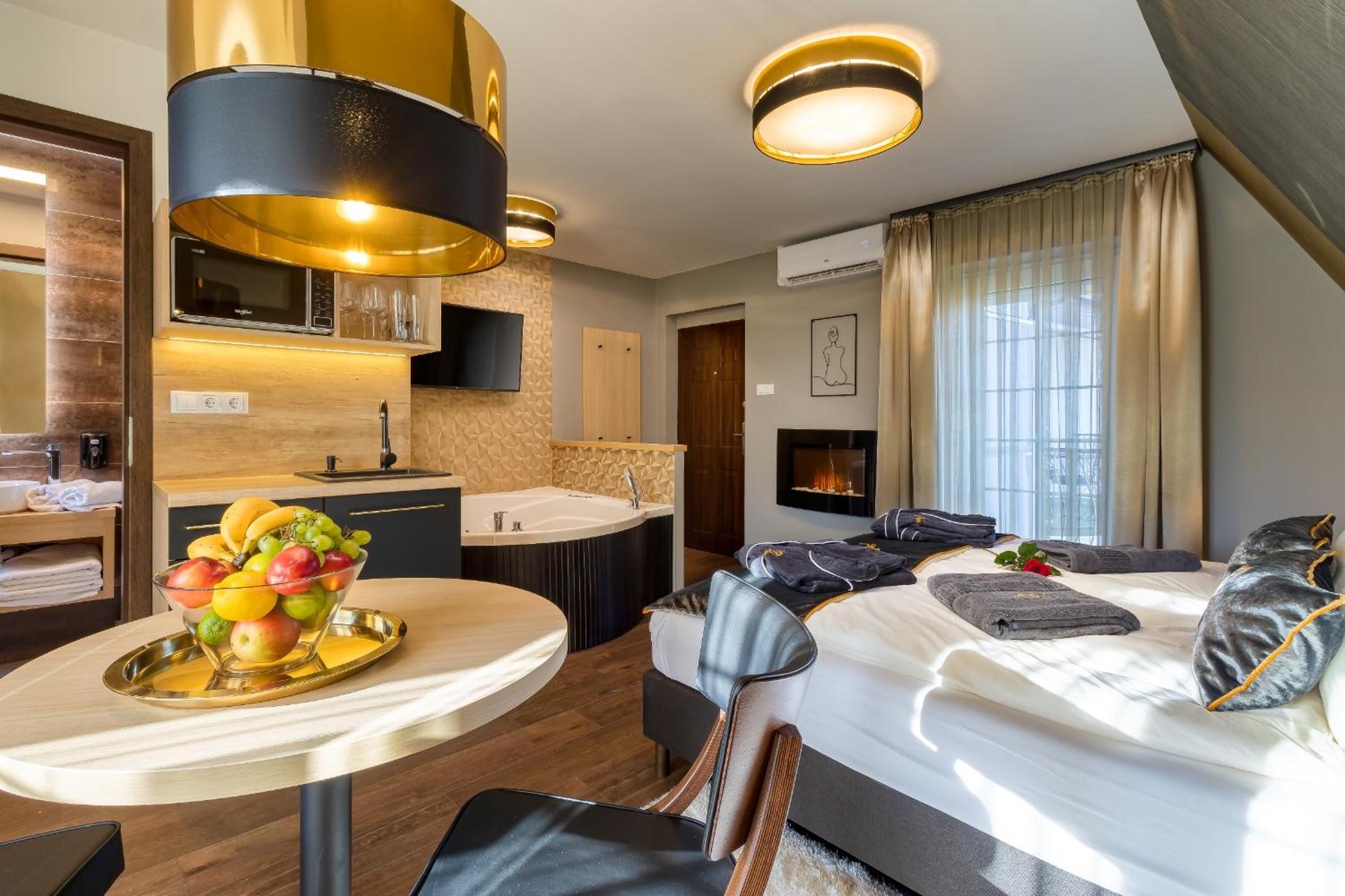Čisto i uredno! Domaćin nam je sve objasnio i pokazao te smo dobili bocu pjenušca i čokoladu. Na korištenje jacuzzi i sauna u sklopu objekta te hidromasažna kada u sobi. Doručak je uključen u cijenu a uključuje švedski stol u obližnjem hotelu. Cjelokupni objekt je prekrasan i lijepo uređen i također ima besplatan parking.