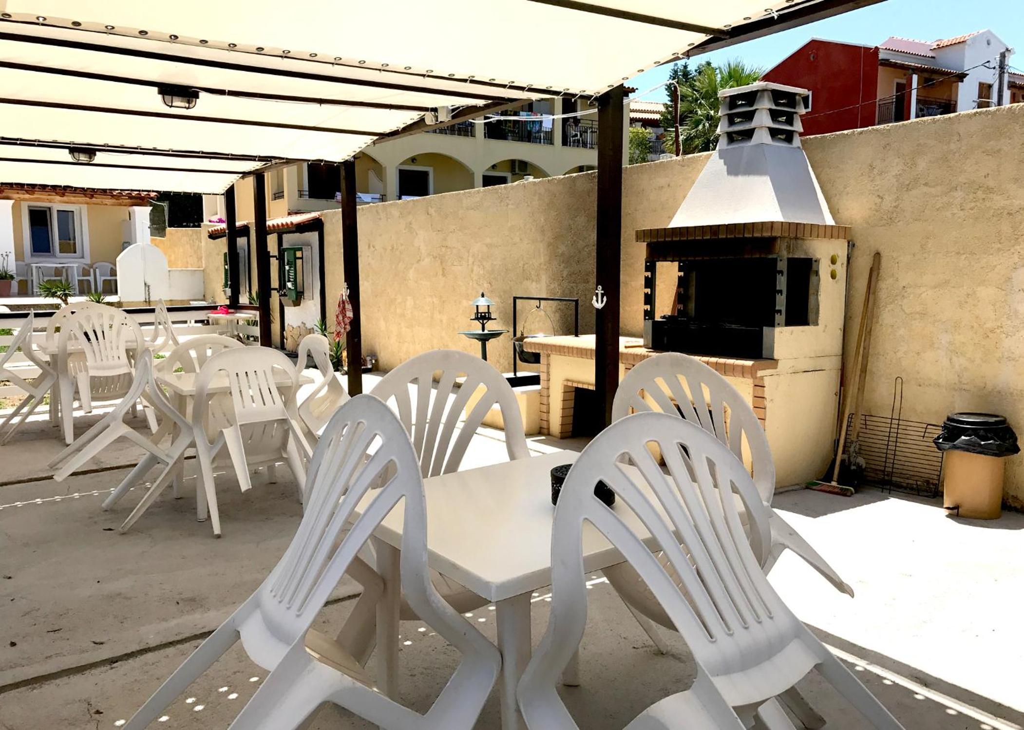 Catamaran apartments are situated at the back of Acharavi town, on an elevation, but not too steep. It is less than 10 minutes walk down to the main street full of restaurants/ cafes/ supermarkets and many other shops, a real Greek town.