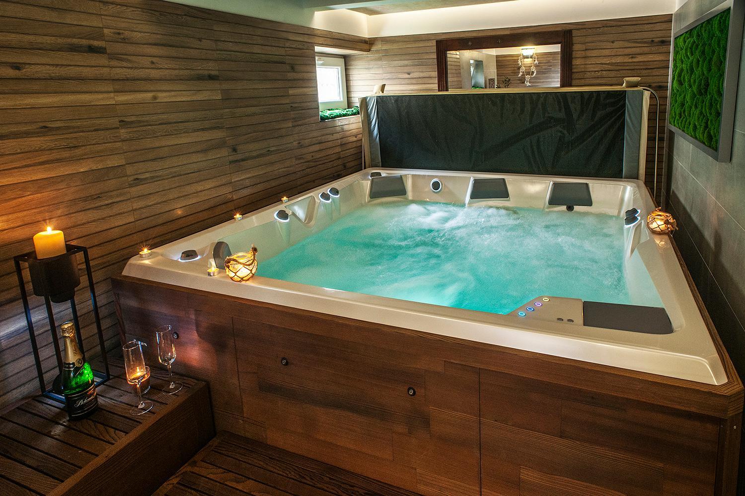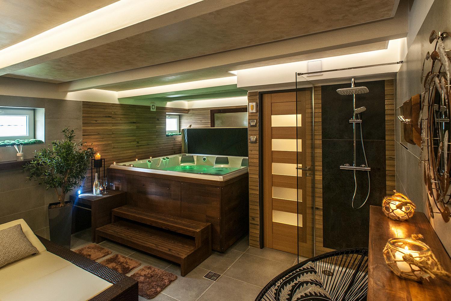Indulge in relaxation at our spa area featuring a hot tub, infrared sauna, sunbed, and rejuvenating massages.