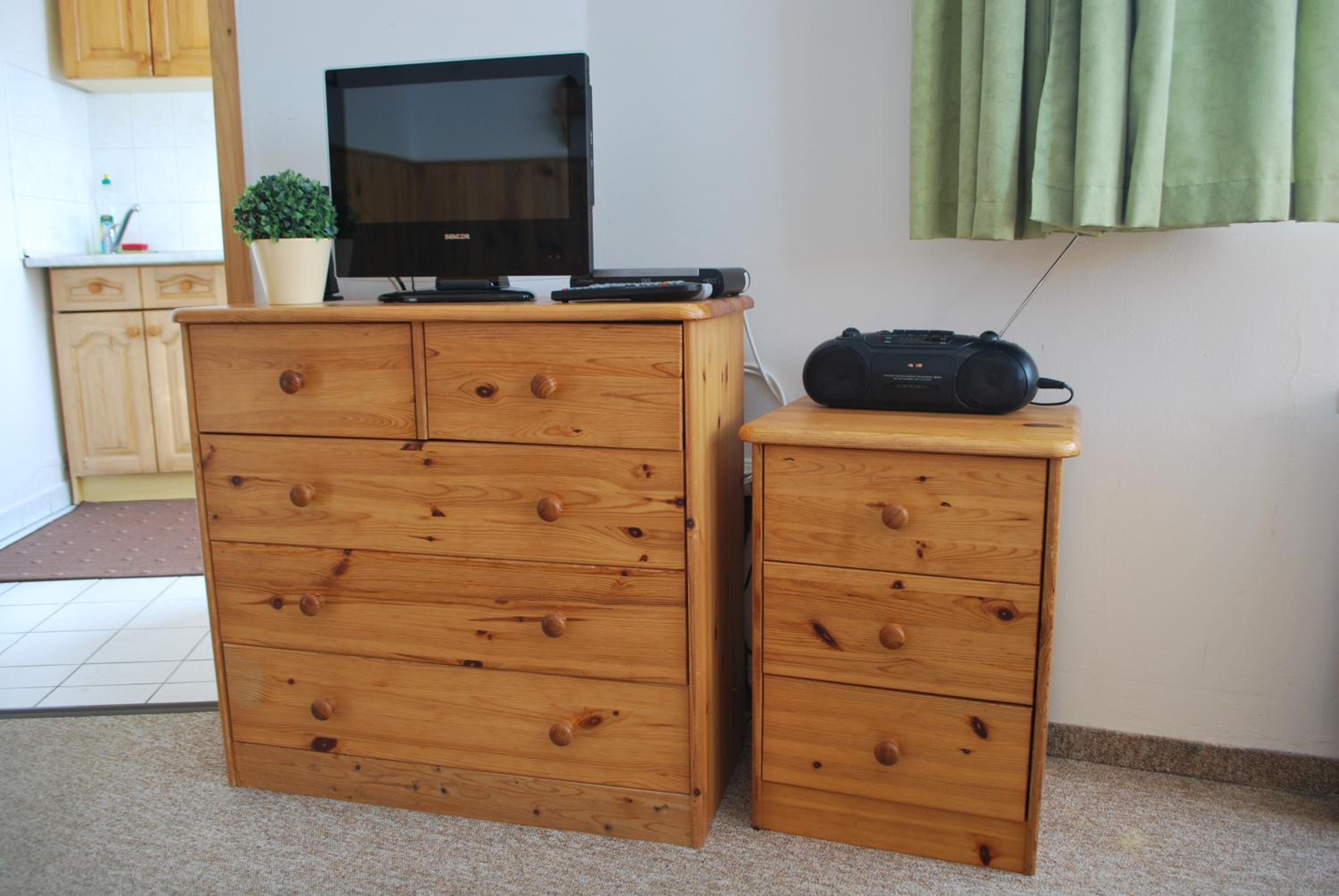Fully Furnished Pine-Wood Apartments: Enjoy the cozy atmosphere with pine-wood furniture and spacious seating areas in every apartment, equipped with satellite TV, radio, and WiFi for your entertainment needs.