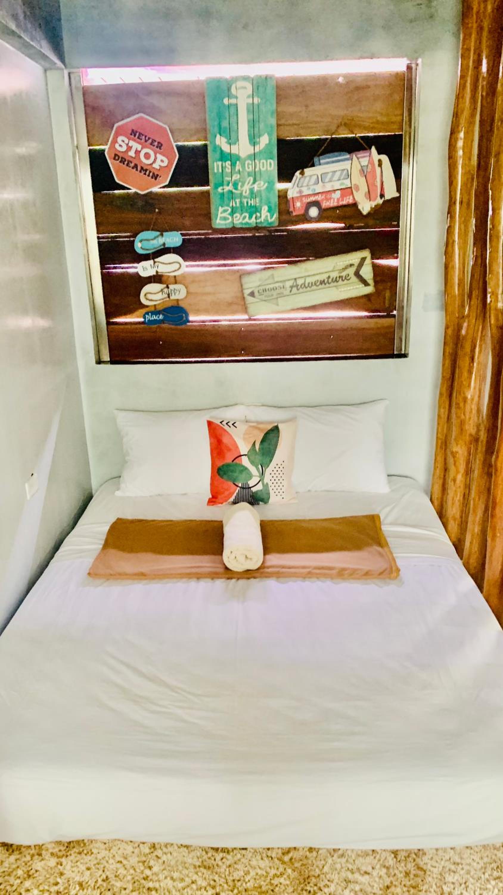 We were there during a typhoon and staff offered no kind of assistance or care, even before the typhoon hit. We felt like a bother to them. The generator was only run when they were there I suppose for their own use and then on one occasion said it would be turned off for an hour but ended up being almost 4 hours. Very inconvenient as we were stuck there with no light water or internet. The explanation was that they were working at another hotel. The owner on the other hand who was in Manila but we communicated via booking.com was considerate enough to move us to her brothers hotel down the road who did have generator working all the time and was very accommodating but a much smaller room with only one bed which is not what we paid for but still very much appreciated at that point.