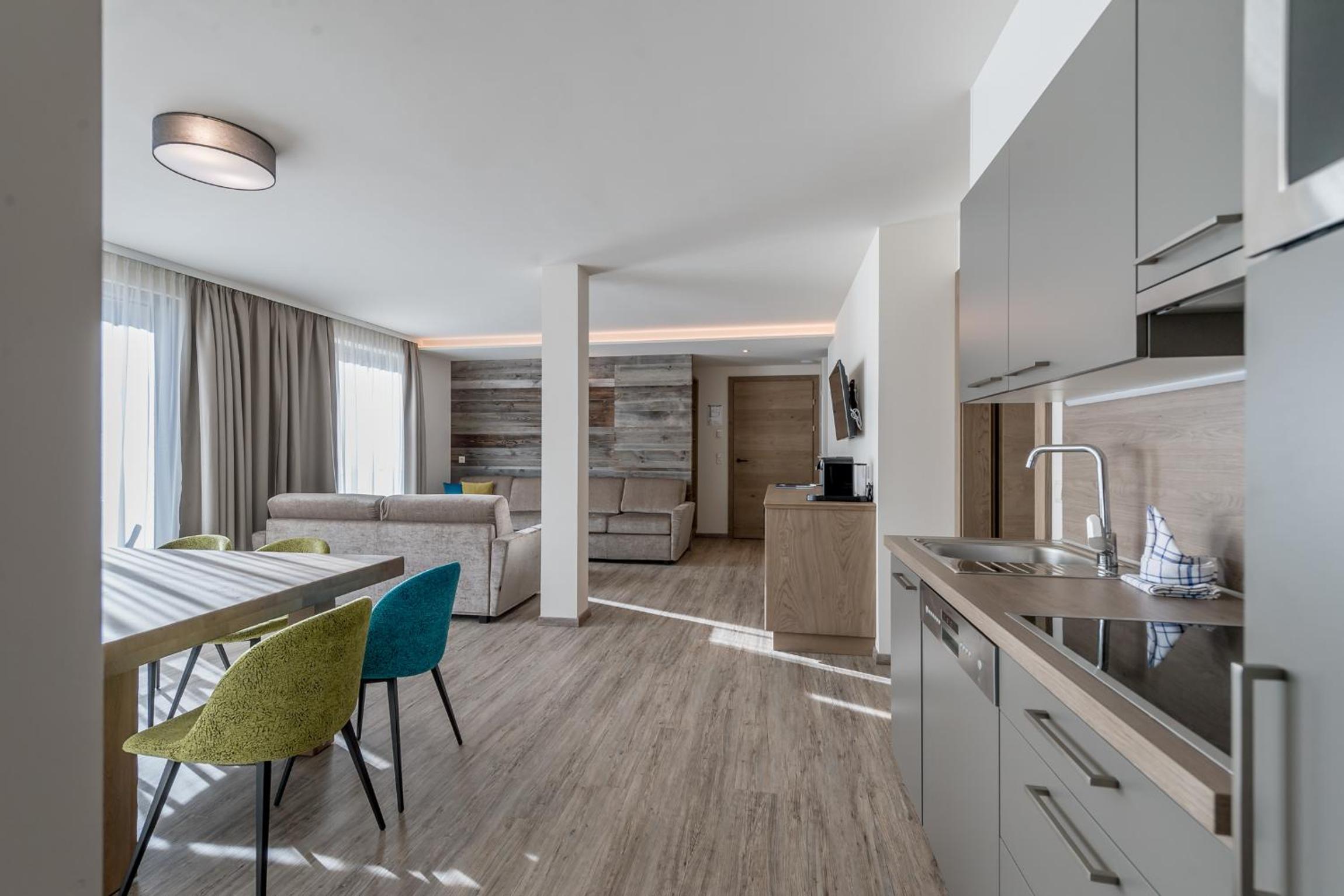 Really good appartment with enough space and everything you could need. The appartment hotel was well organised with an excellent ski-room and other facilities like washing machine available. Enough parking and good location near the cable car. Quieter end of town but can walk in or take regular buses.