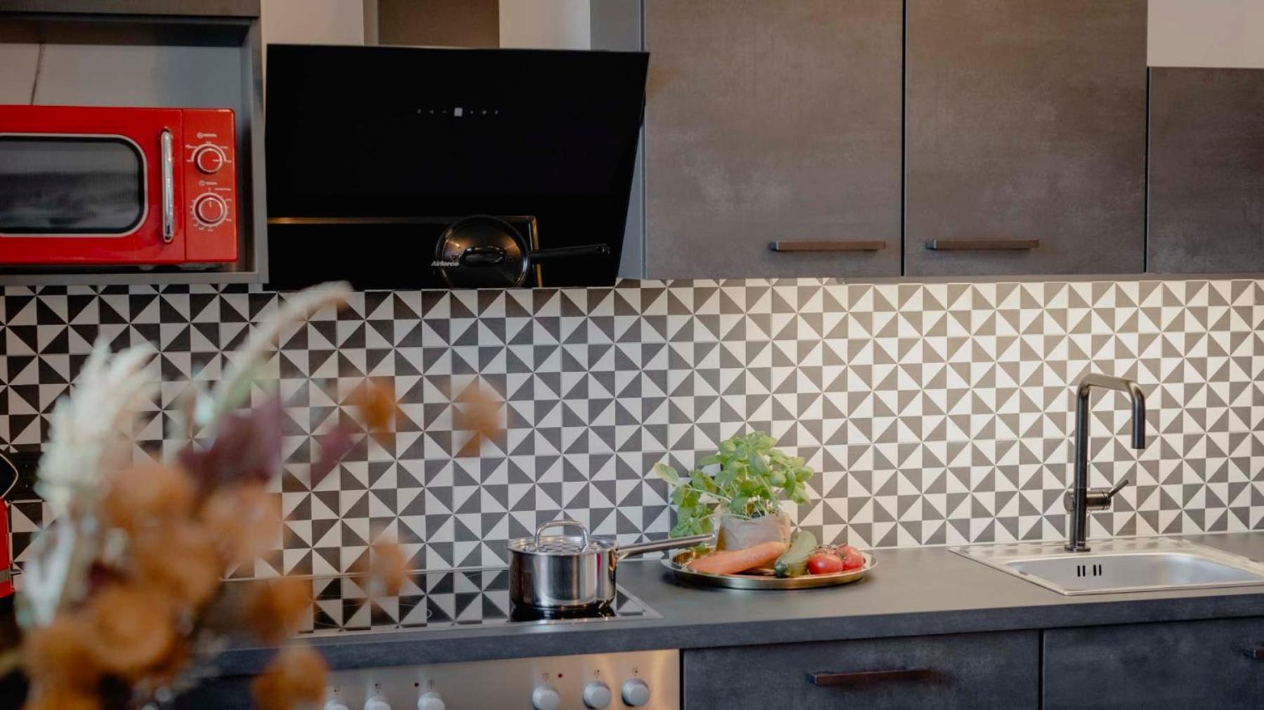 Tolle , stylische Zimmer und sehr gut ausgestatteter Living room ( für alle Gäste ) mit vollständiger Küche !