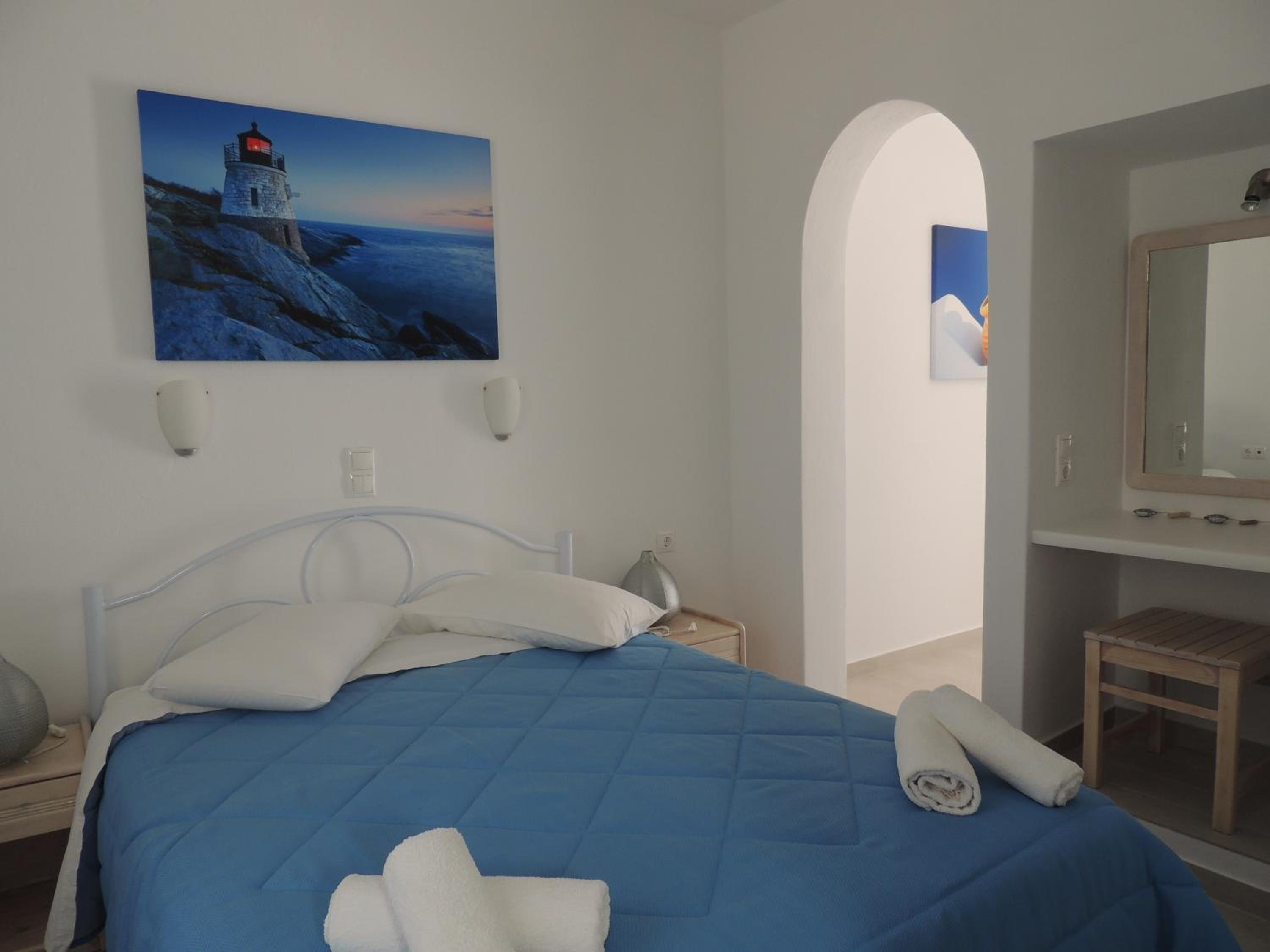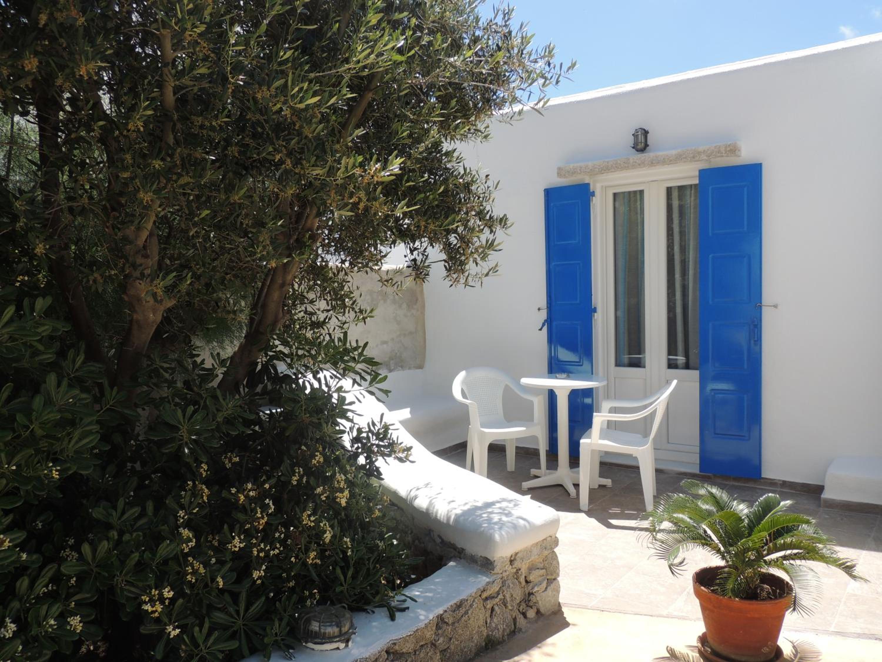 Experience the beauty of Cycladic architecture in our air-conditioned studios and apartments, each offering views of the pool or garden from private balconies or terraces. Immerse yourself in the traditional decor and enjoy modern amenities like satellite TV and a well-equipped kitchen.