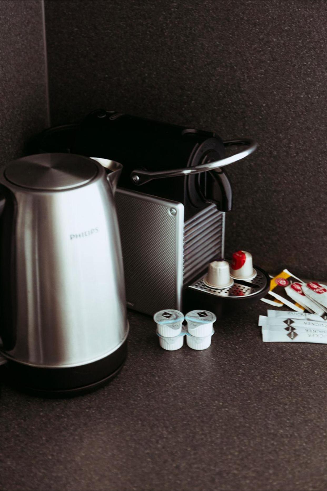 The kitchen is well equipped with a stove, toaster, kettle, Nespresso machine, cookware, plates, glasses, and even shot glasses.