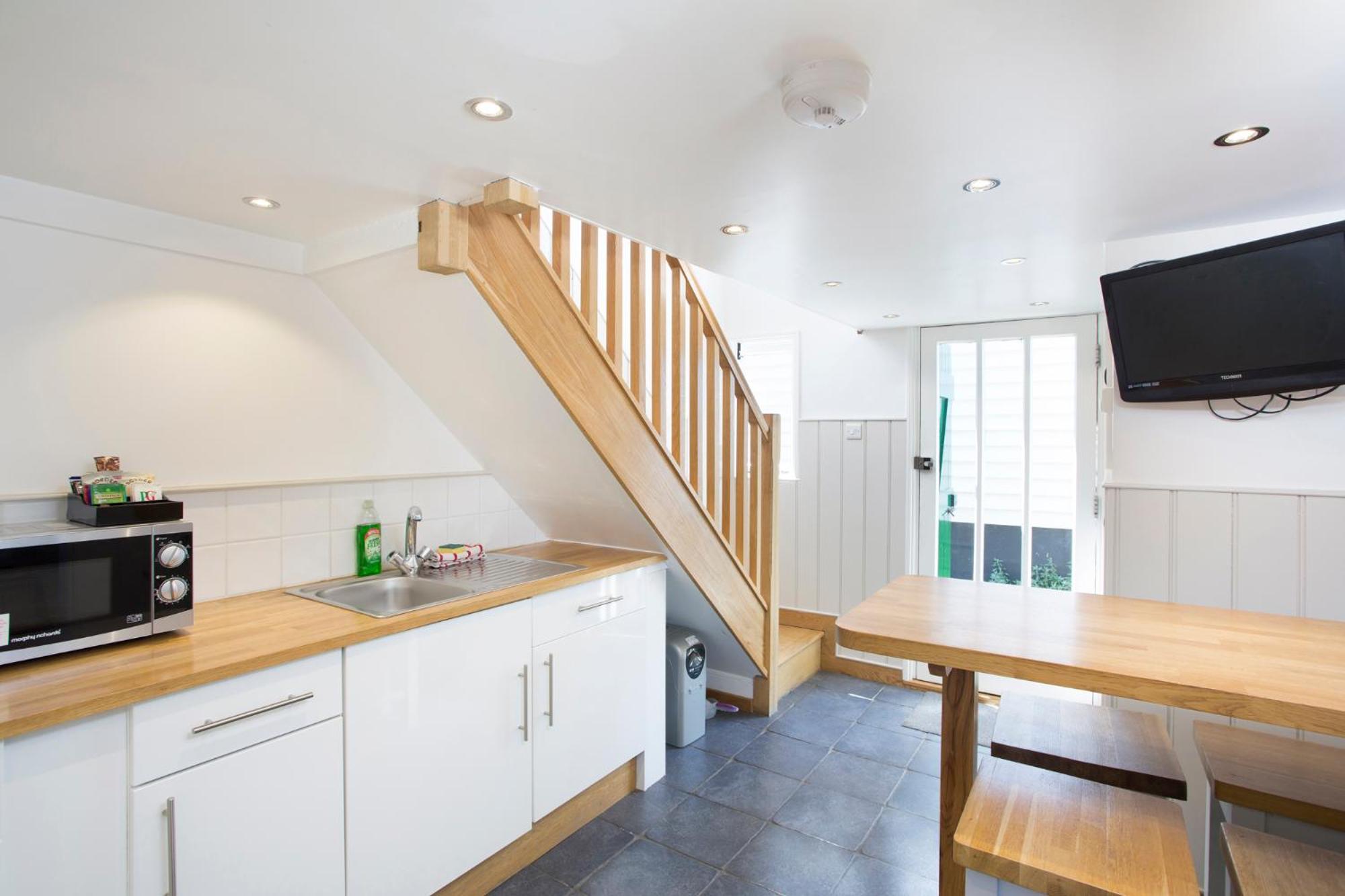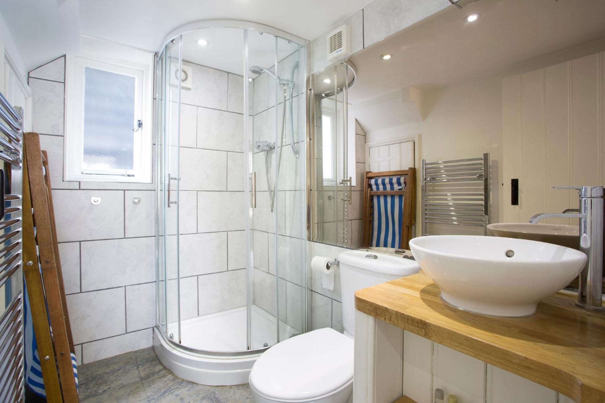 The ladder up to the bedroom is a bit precarious but equally fun. The bathroom is adequate (a bit tired looking) but could do with a surface to put toiletries on. An addition of a sink in the kitchen would be fantastic.