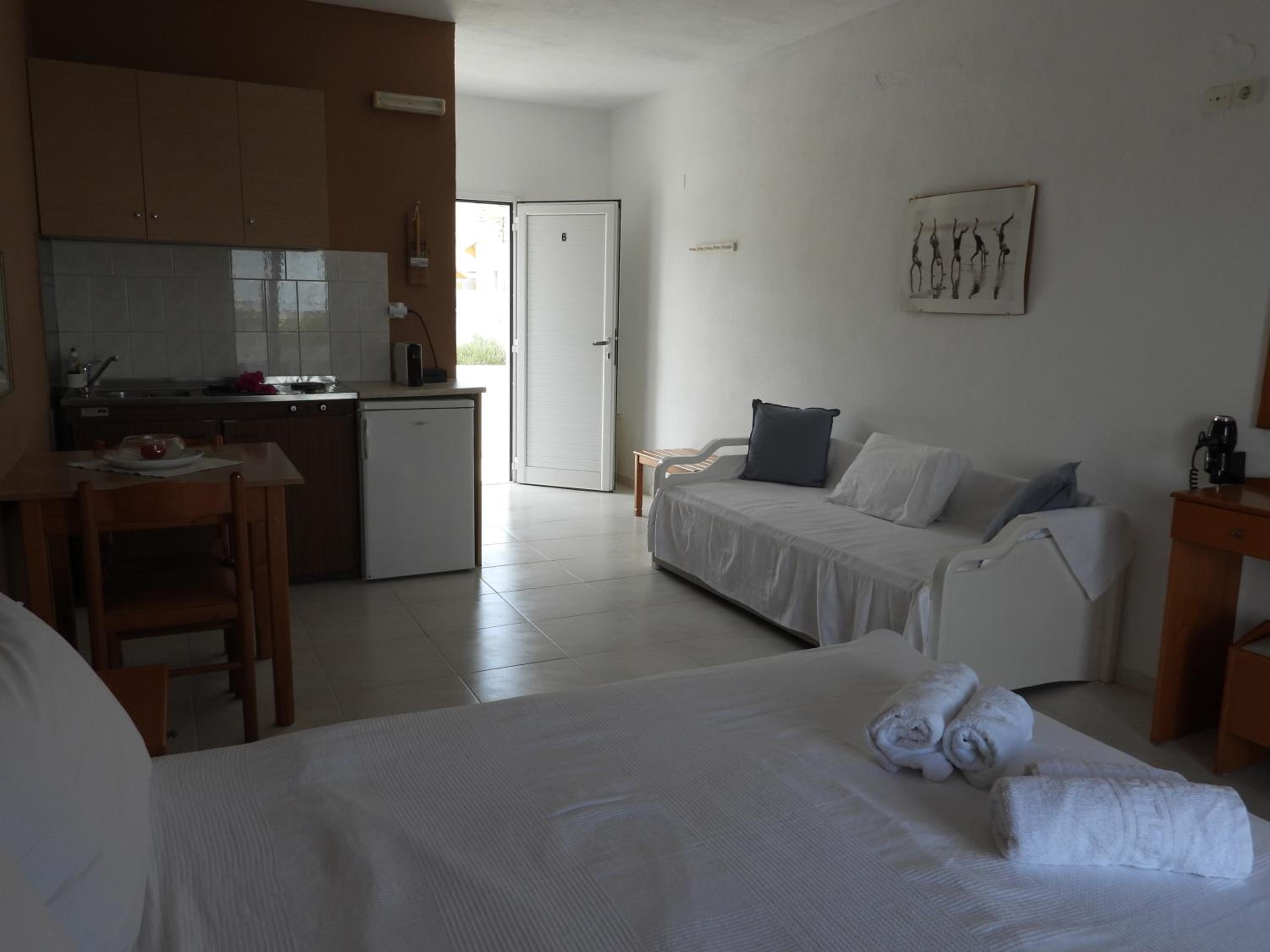 Very convenient is the small market right below the studios, run by the same owner: you can easily find breakfast products, fresh bread every day (except Sundays), cigarettes (upon request they can provide your preferred brand within a few days), and many other useful items such as beach equipment, cold drinks, and snacks to take with you to the beach.