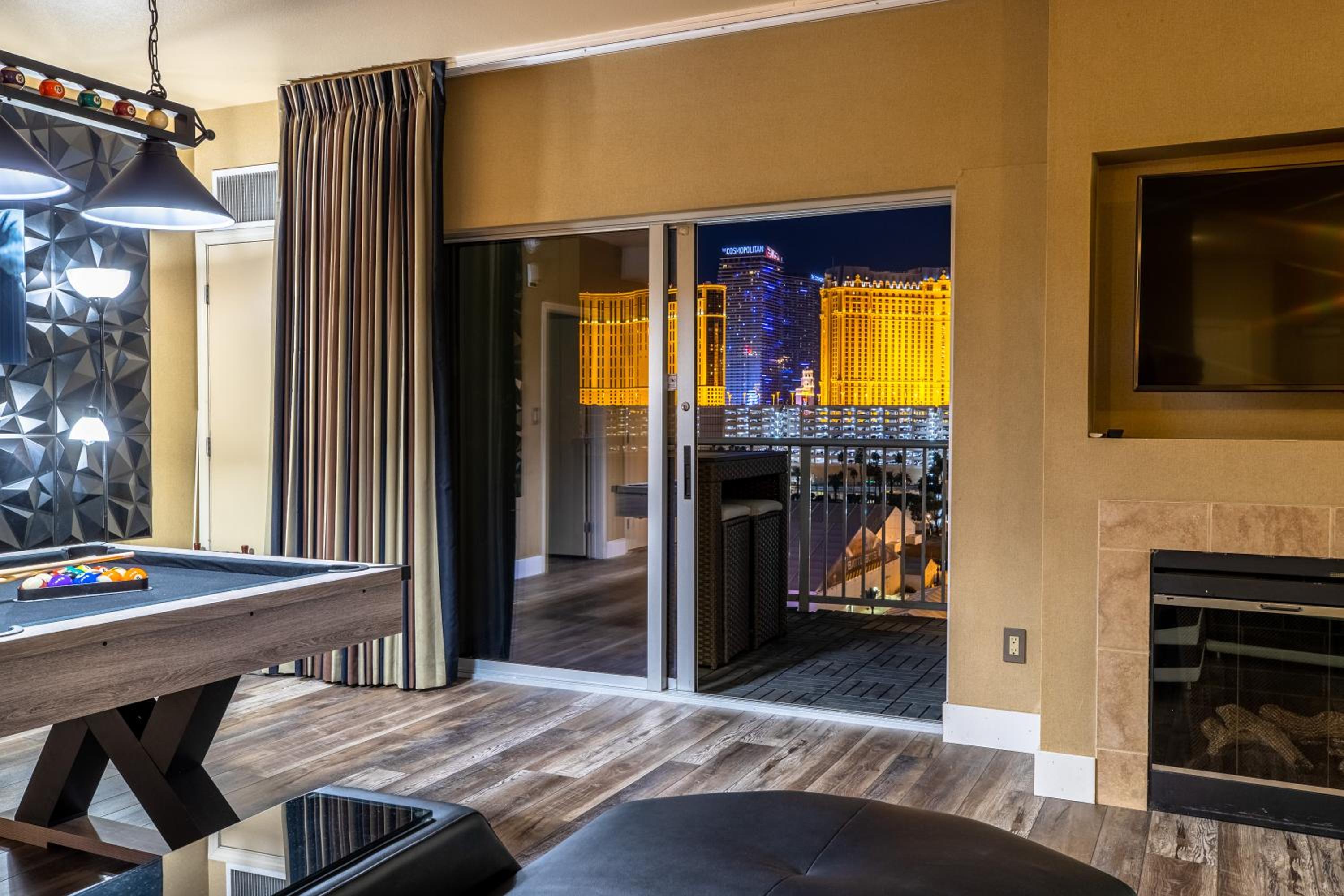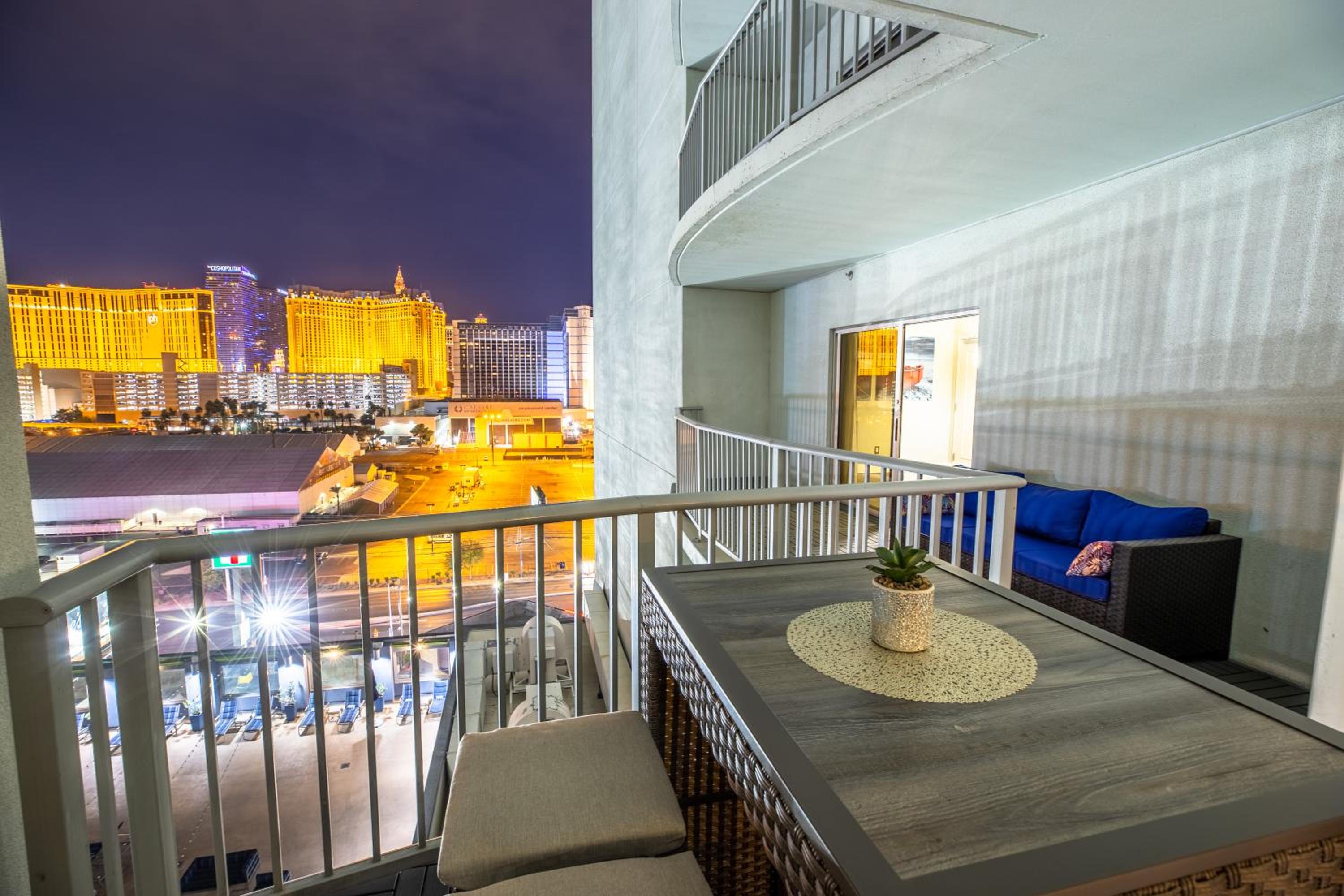 Indulge in the stunning views of the Las Vegas Strip from the comfort of your own private balcony. Enjoy access to a rooftop pool, hot tub, and a fully equipped kitchen for a truly luxurious stay.