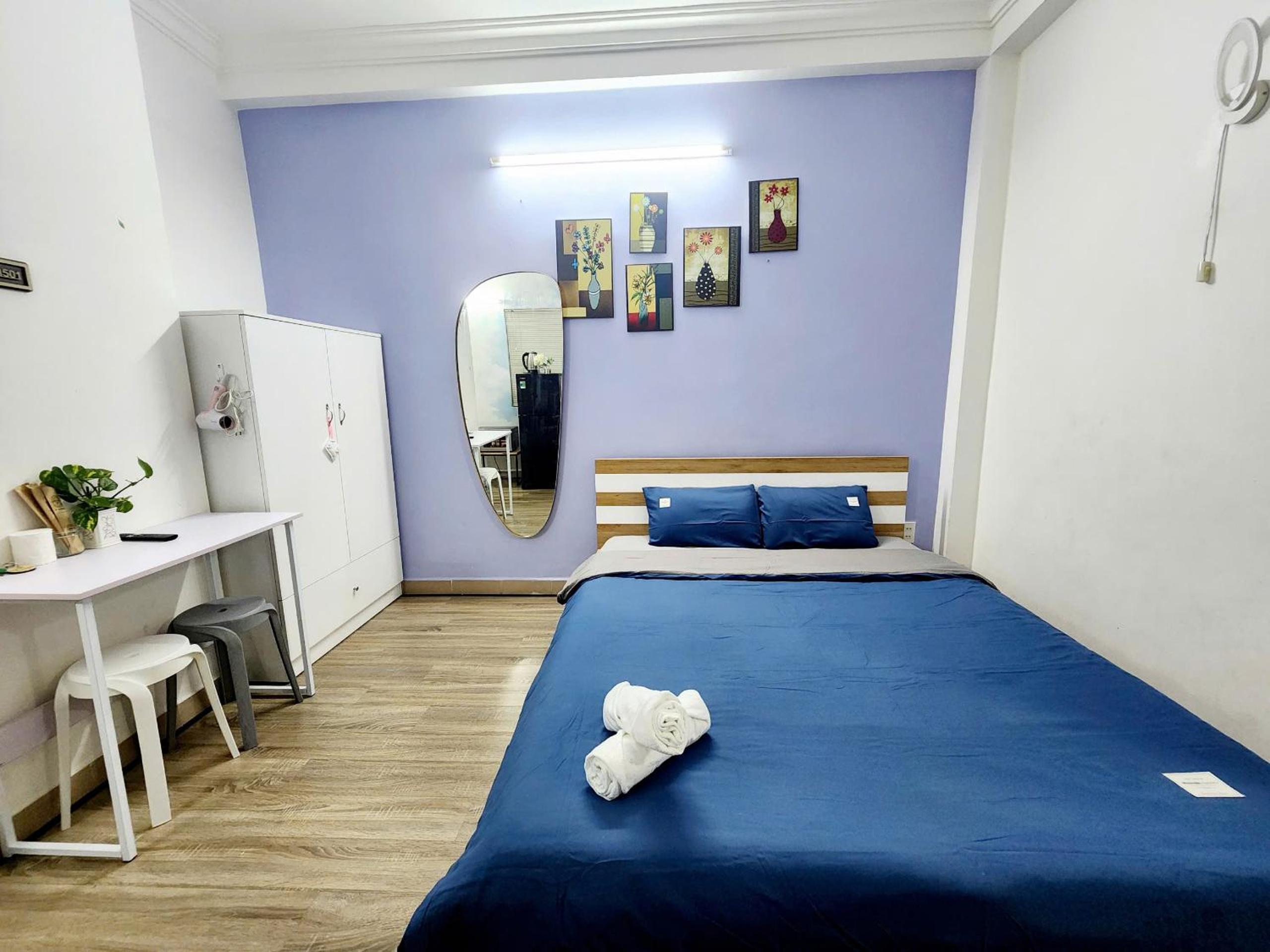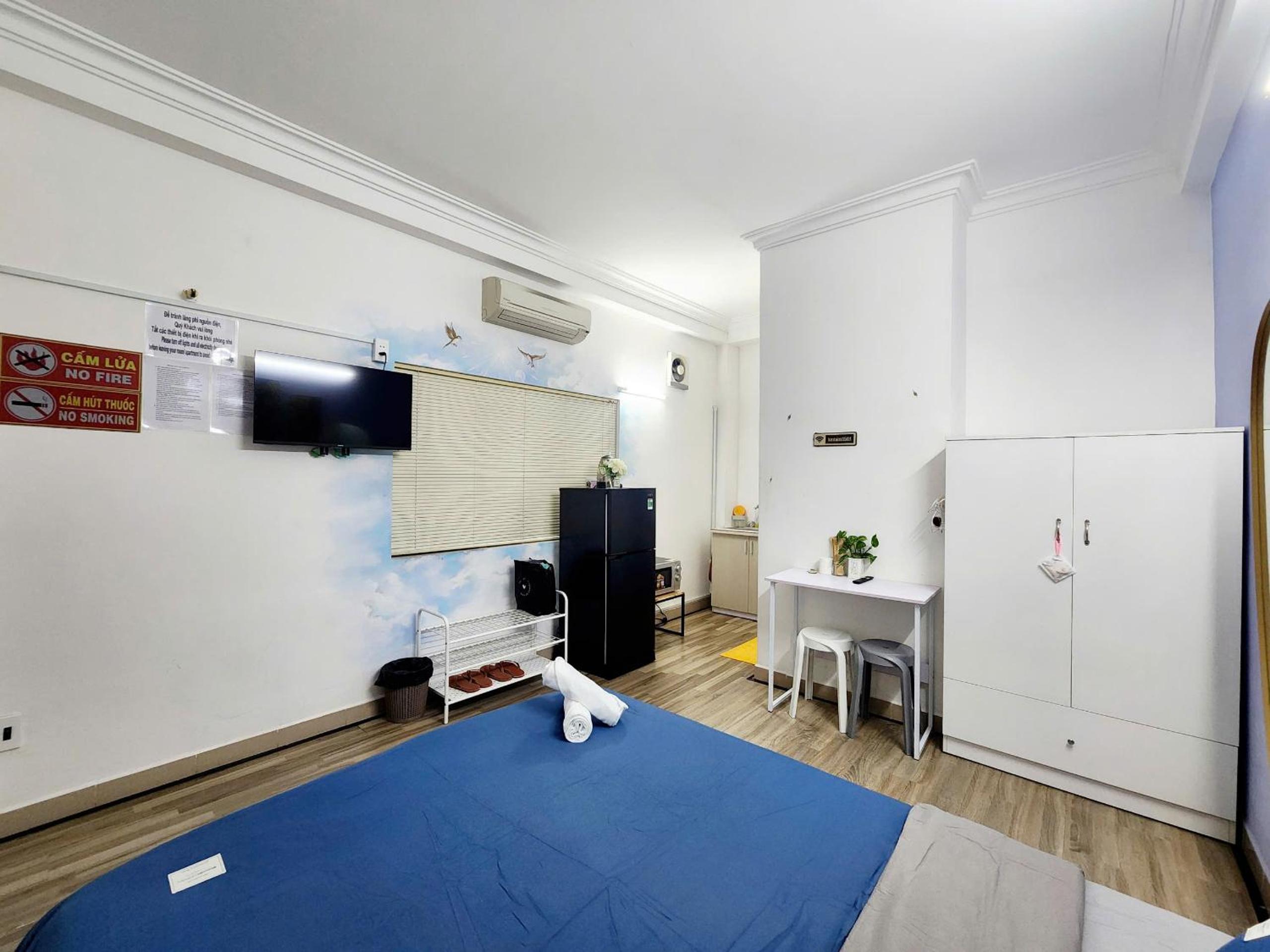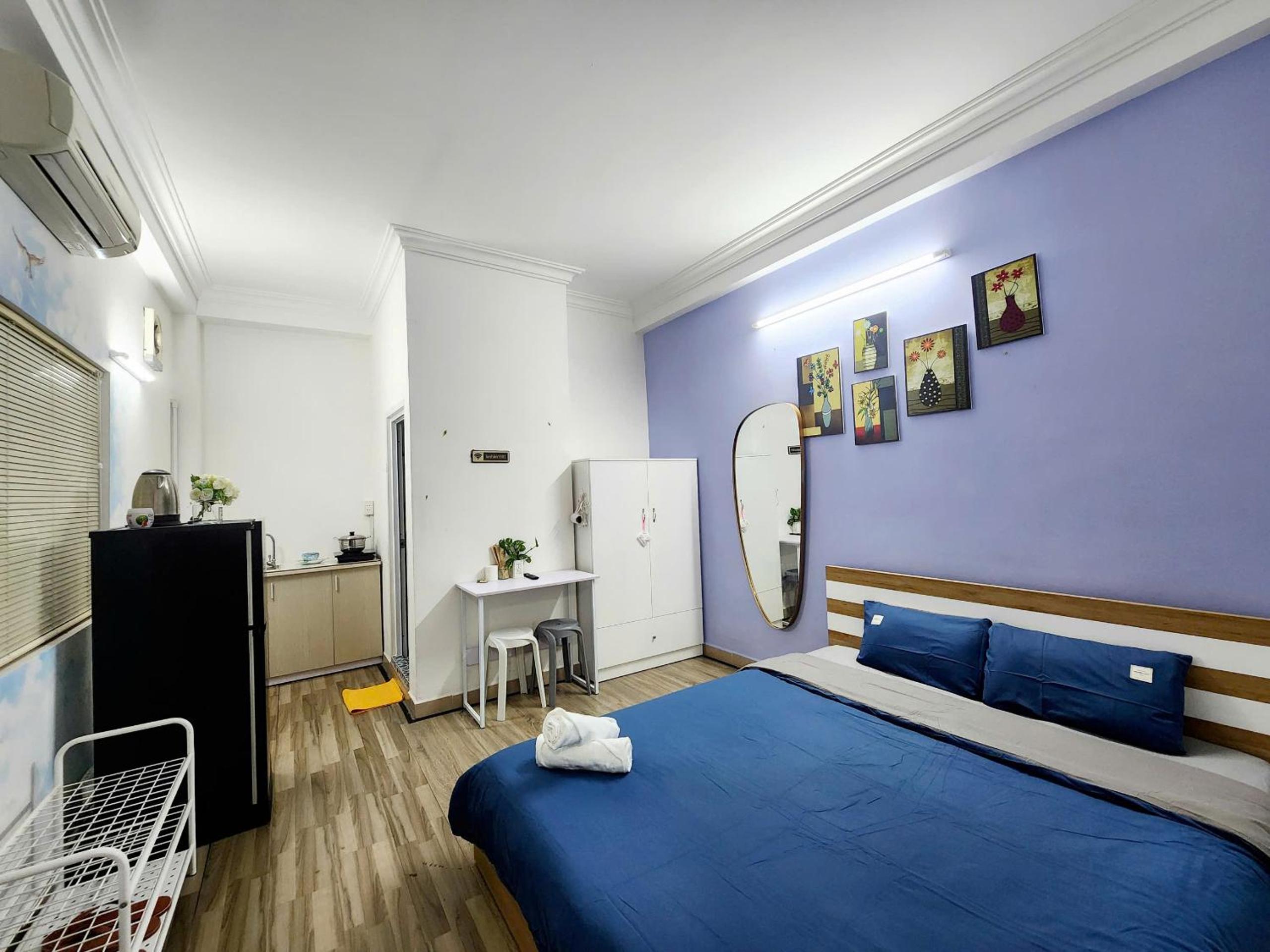 Room is well equipped with kettle, kitchenette, big fridge, wardrobe, desk. Clean, good smell and locate in a quiet alley within walking distance to food and drink of D1