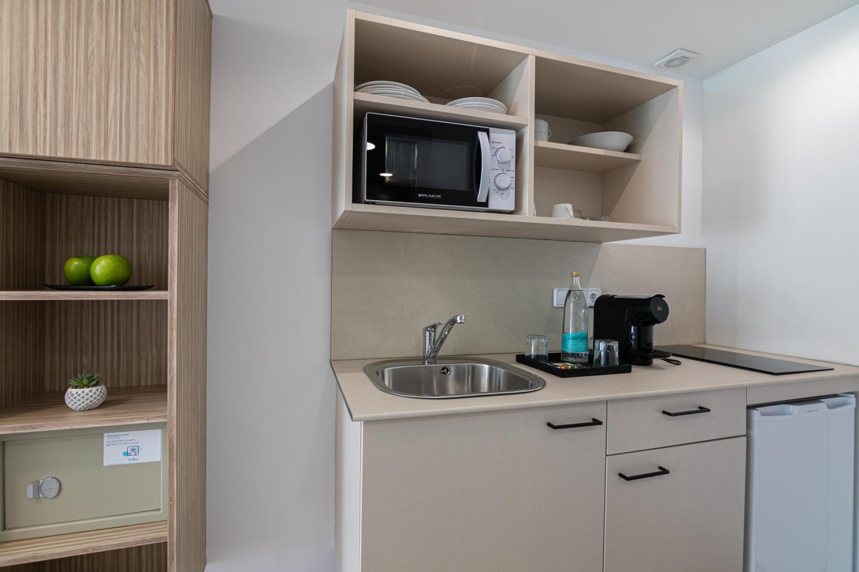 Our modern studios and apartments are designed for your relaxation, featuring private balconies, satellite TV, and fully-equipped kitchenettes. Enjoy year-round comfort with our air conditioning and heating options.
