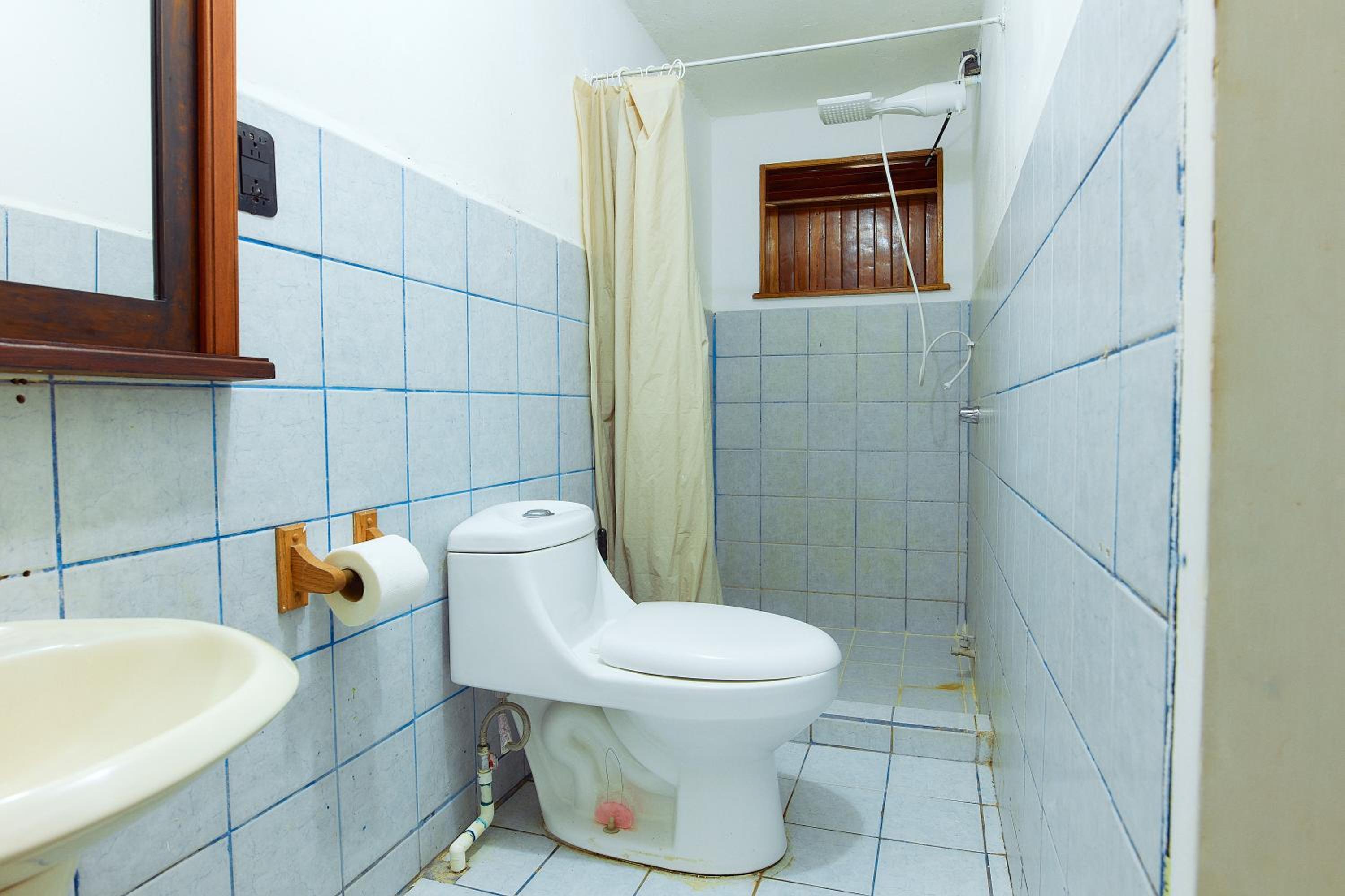 Das Bad war nicht sauber. Es gab ein Regal, das dringend ausgetauscht werden müsste, da war Schimmel.