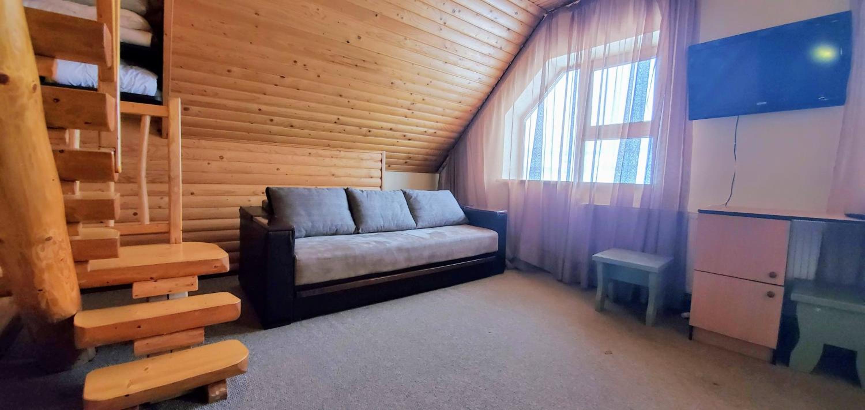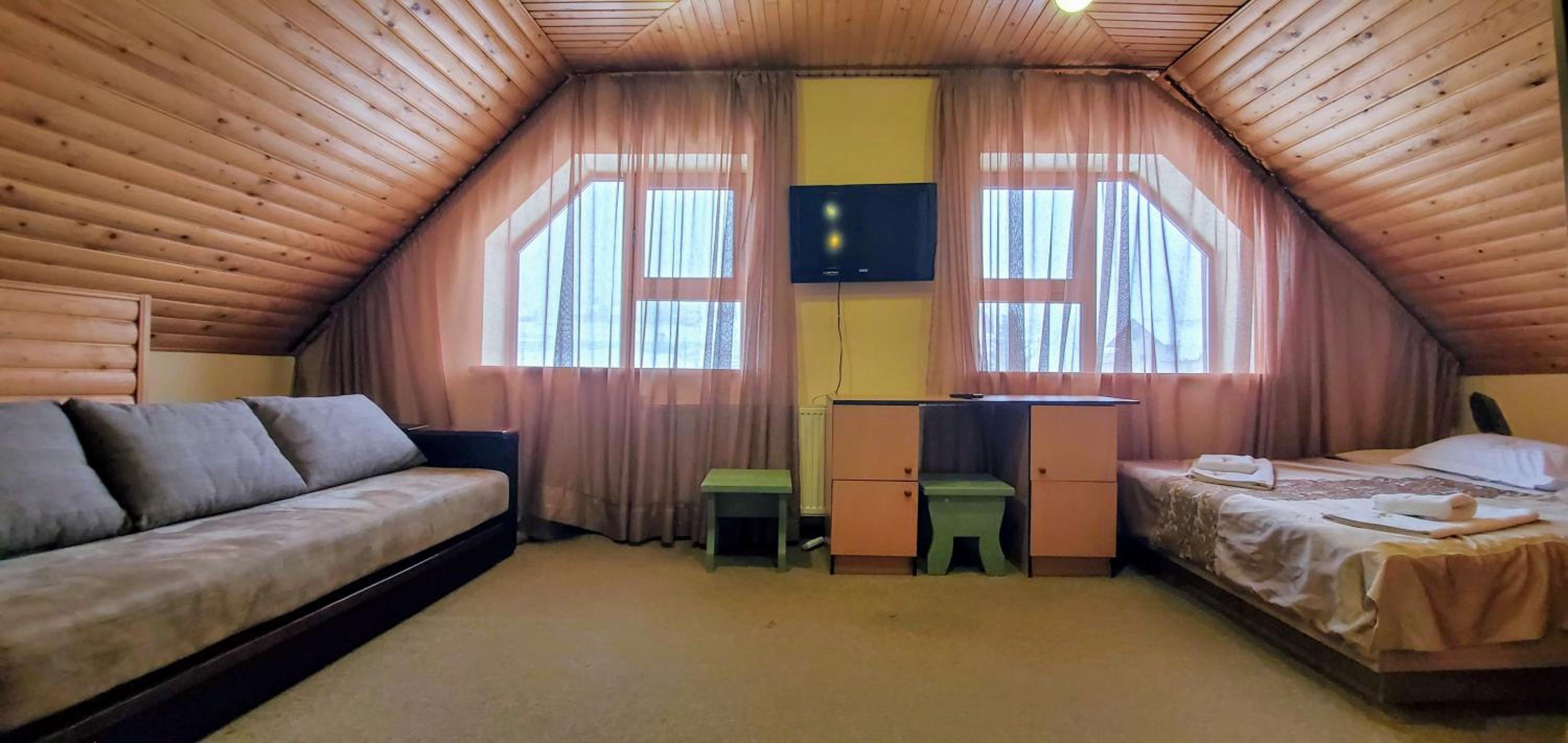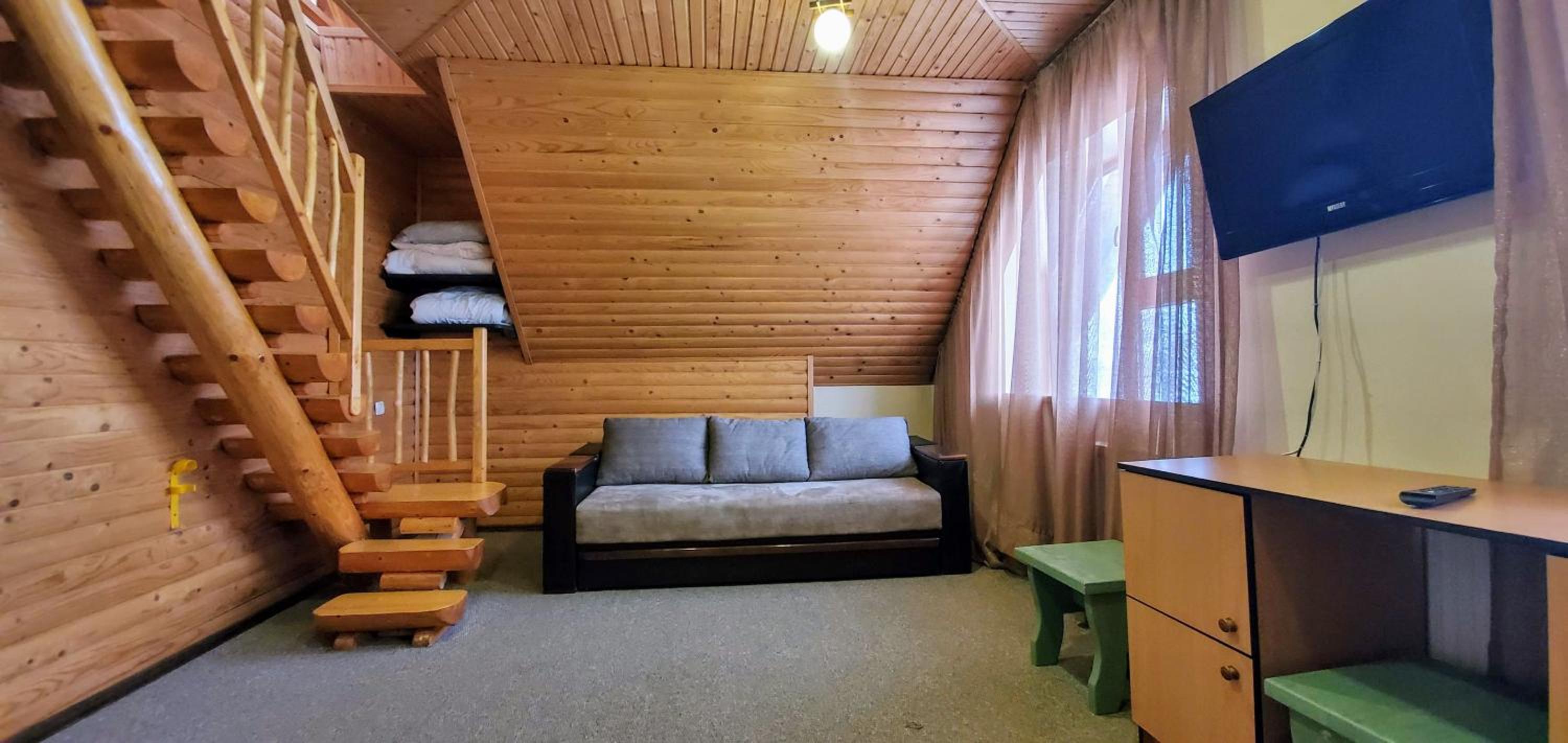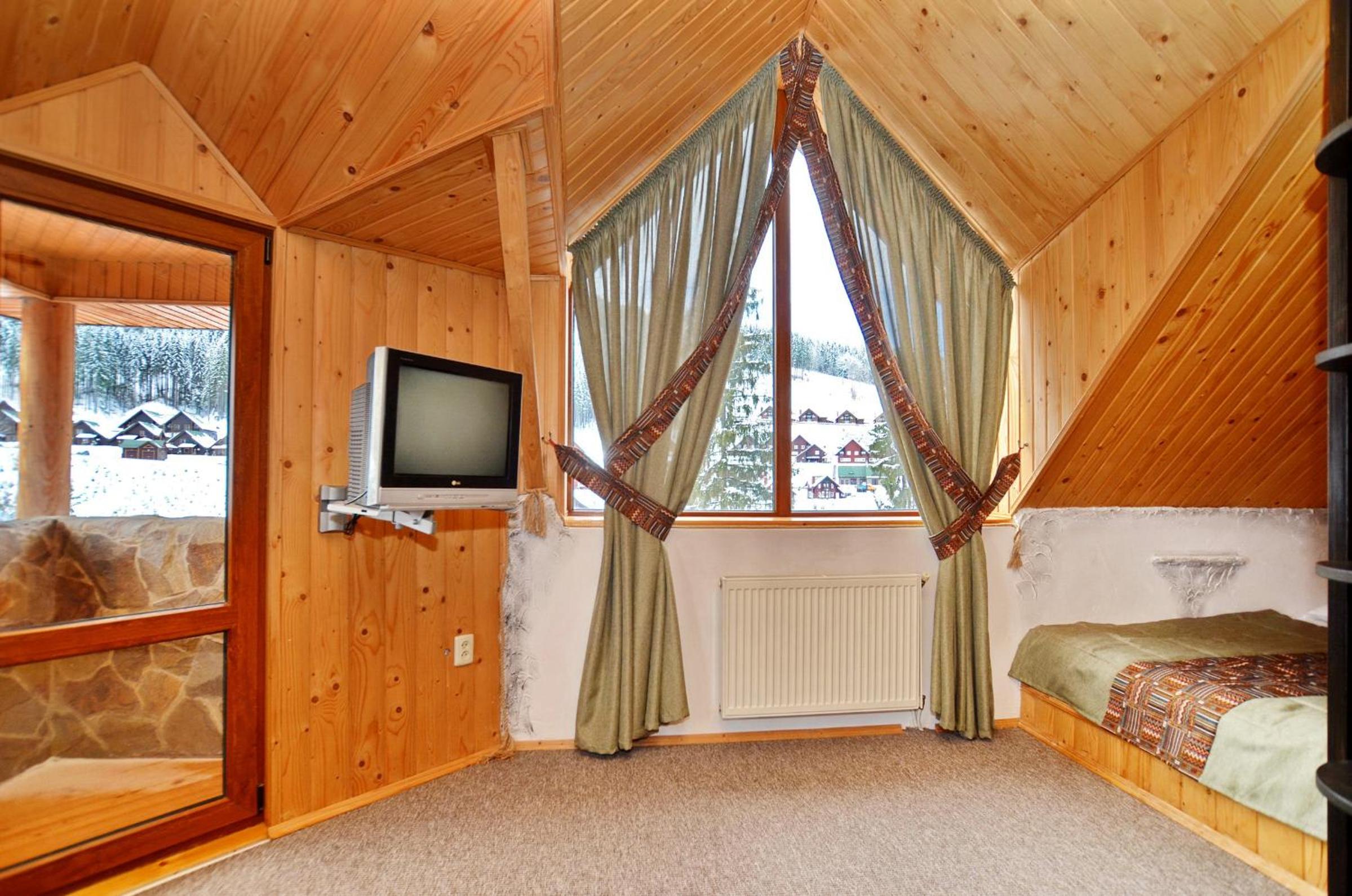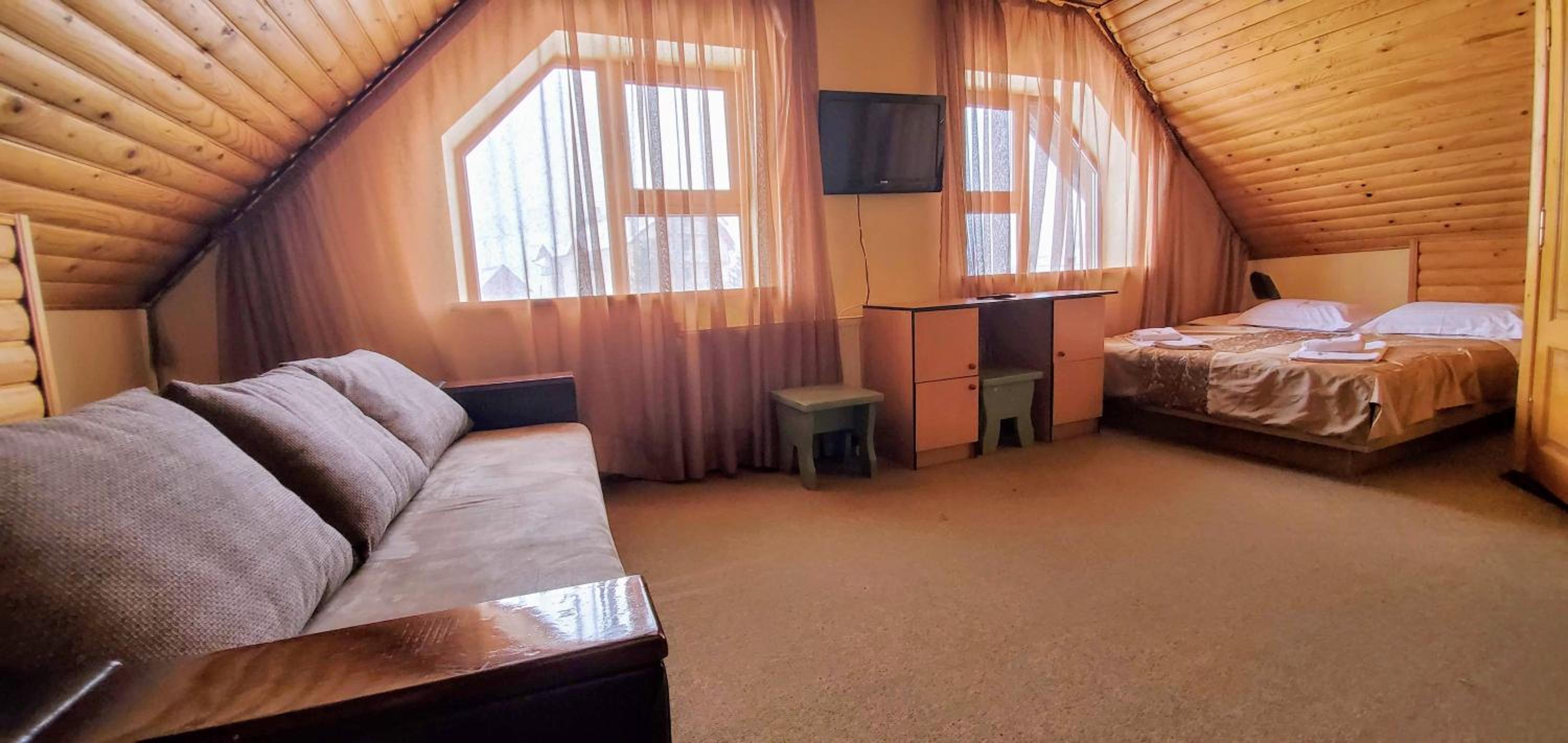 Великий двоповерховий номер для великої родини, є прокат лиж, зранку возять до підйомників. Дуже гарне та смачне дворазове харчування, що включено у вартість. Розташування в самому серці Буковеля. Гостинний персонал, періодичне прибирання в номері. Красивий краєвид з вікон.