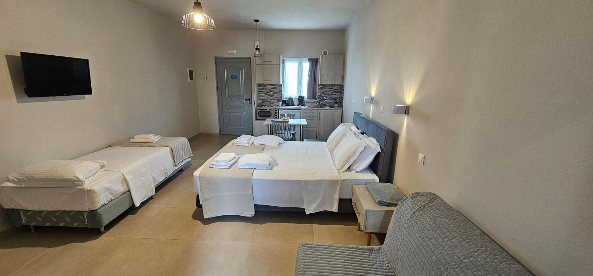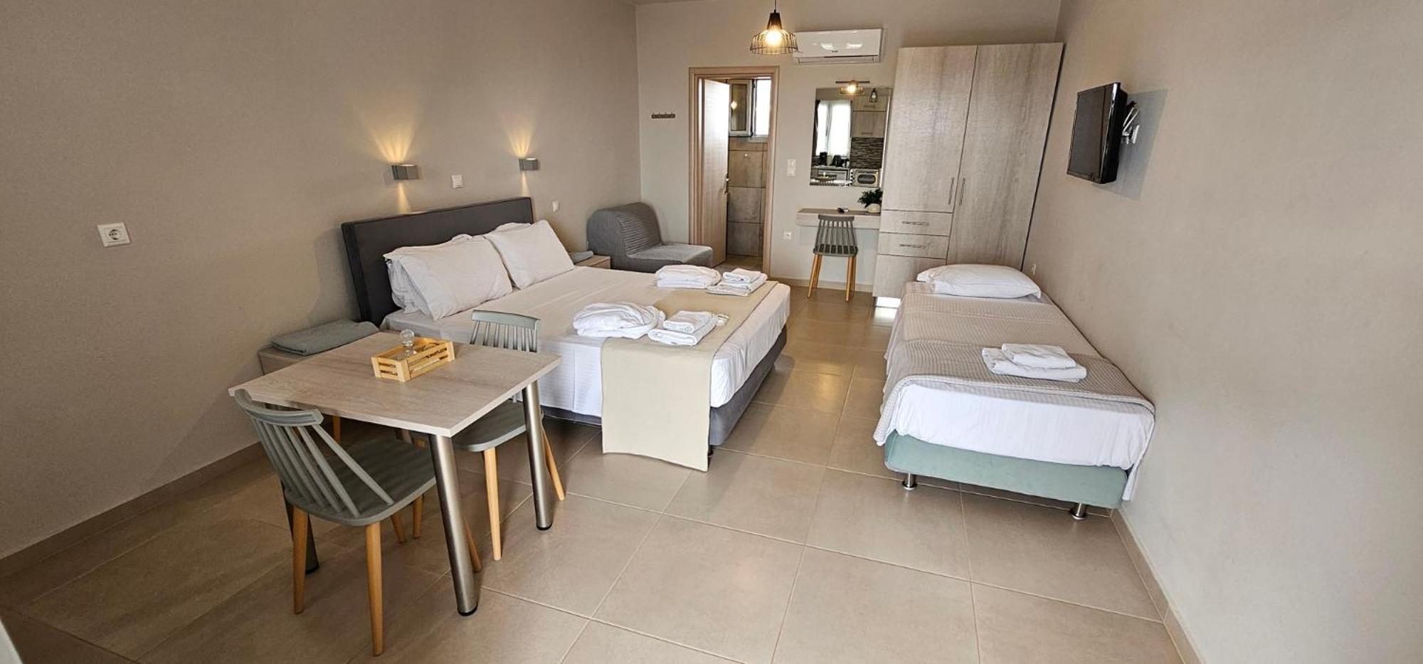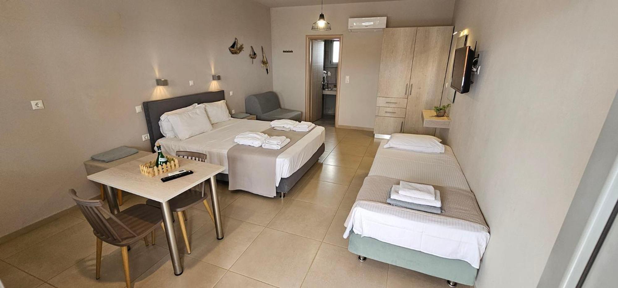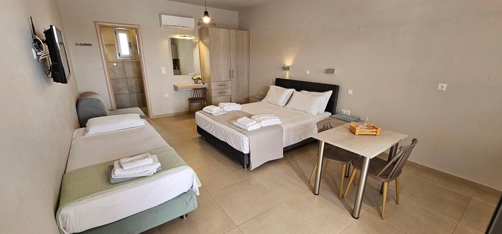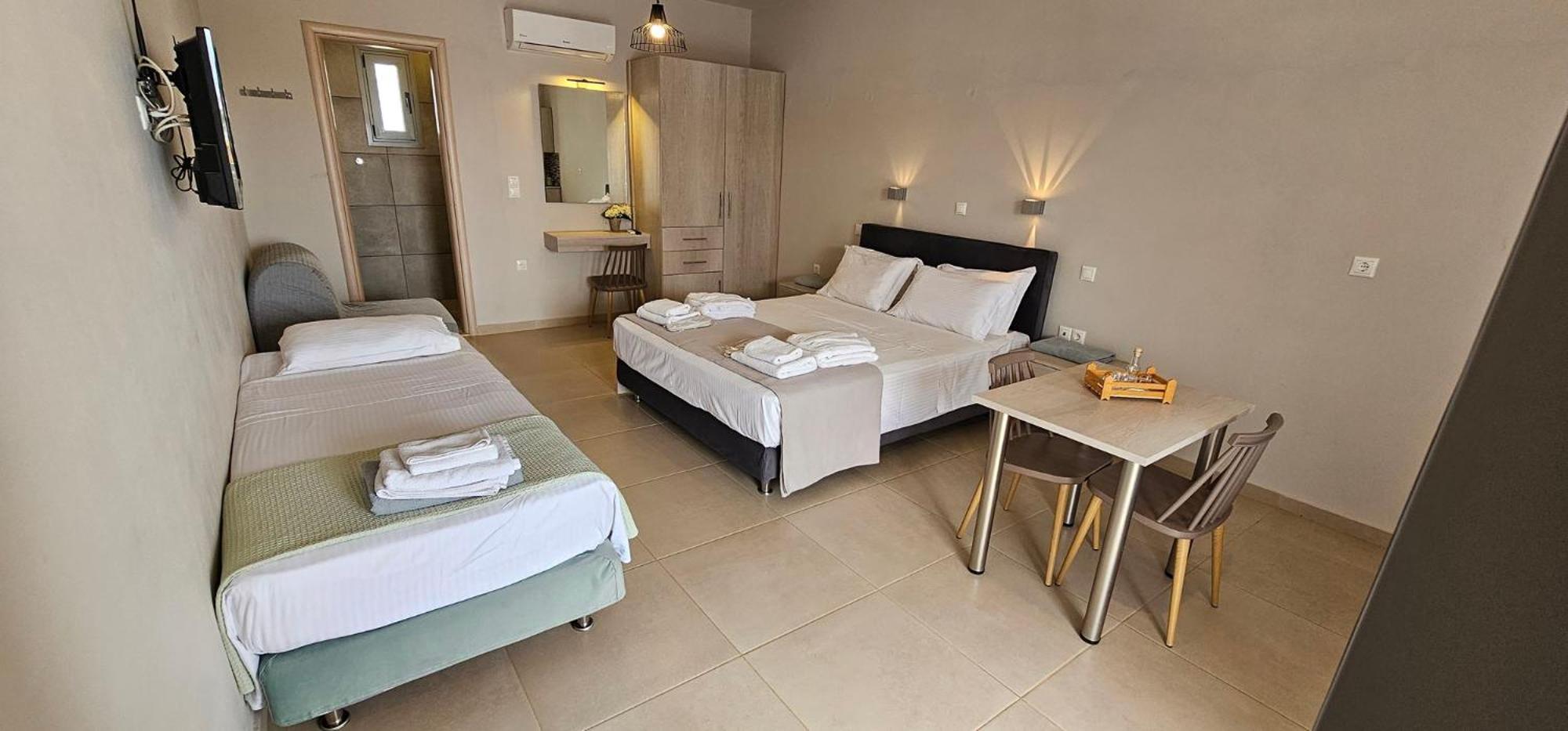 Asterisuites in Makry Gialos offers a perfect blend of luxury and comfort, with spacious family rooms and a private entrance for your convenience. Each air-conditioned unit boasts modern amenities like a coffee machine, flat-screen TV, and a private terrace overlooking the mesmerizing sea.
