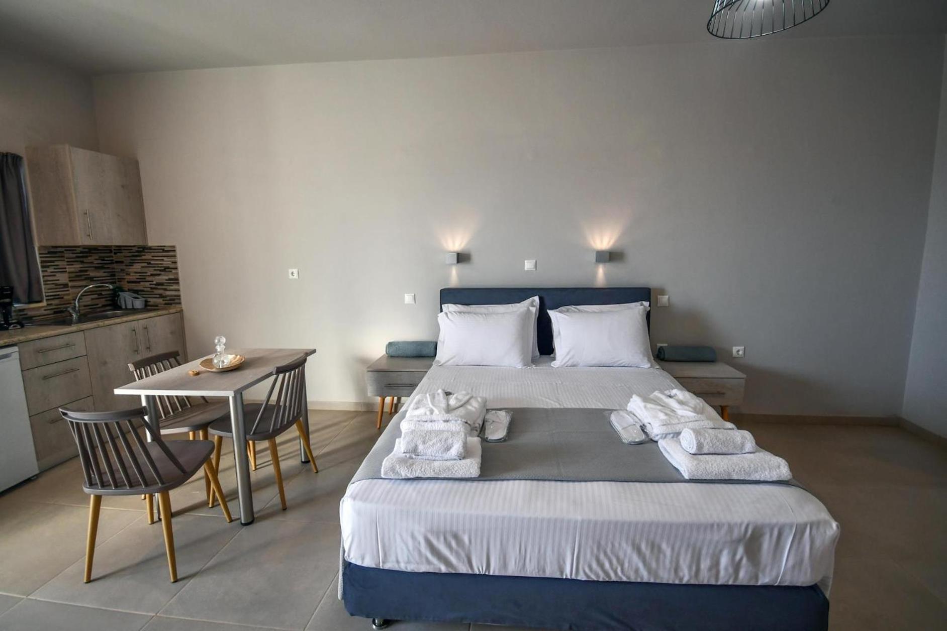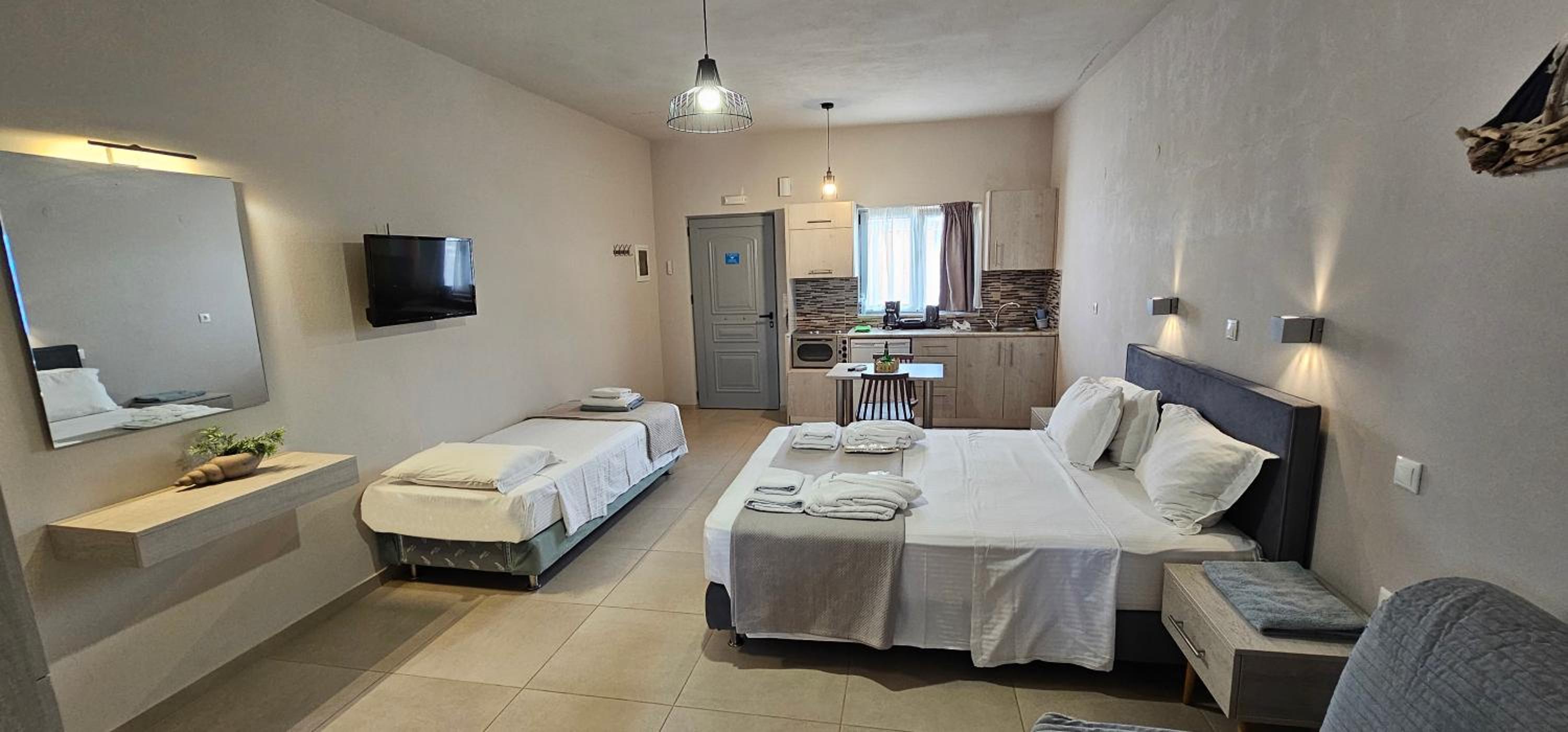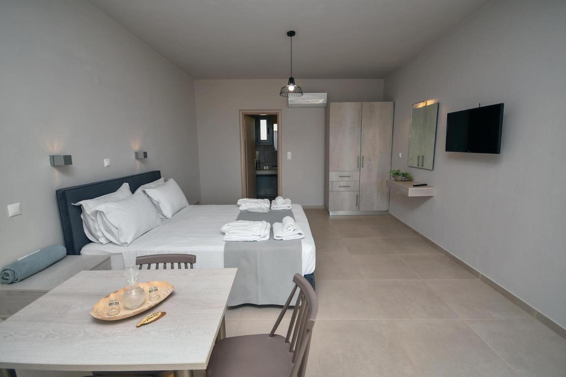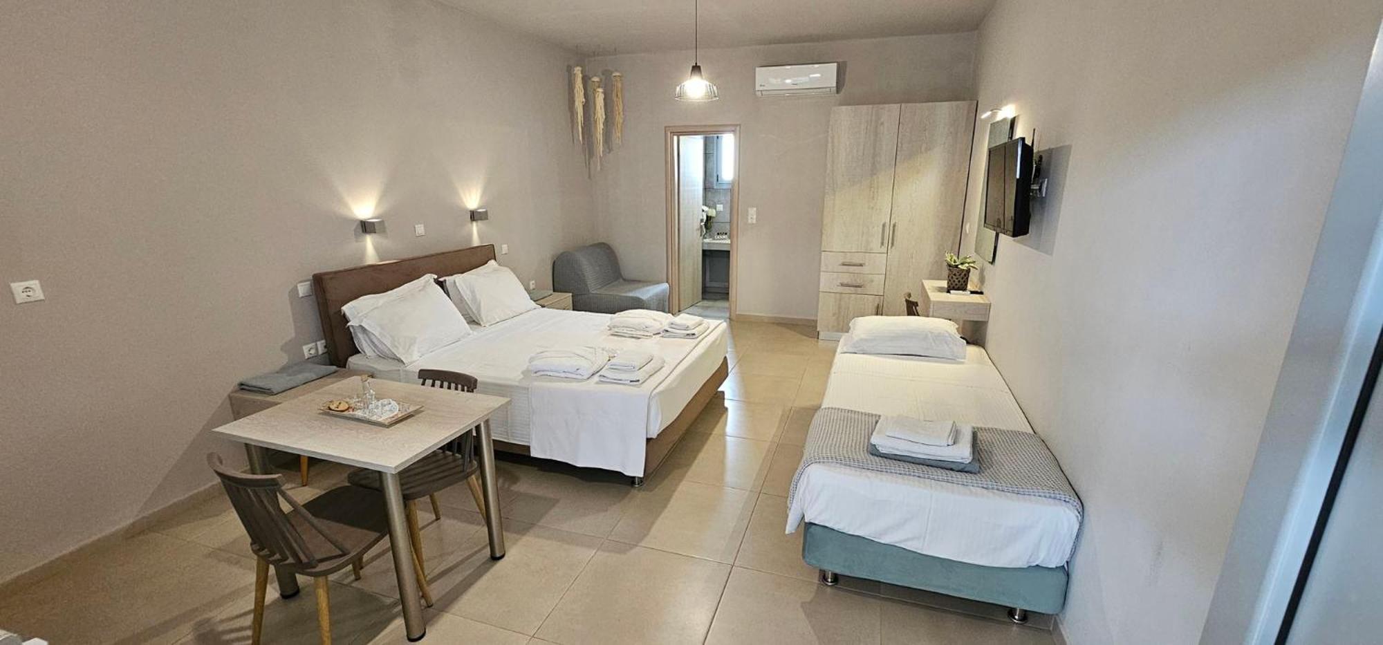 Asterisuites in Makry Gialos offers a perfect blend of luxury and comfort, with spacious family rooms and a private entrance for your convenience. Each air-conditioned unit boasts modern amenities like a coffee machine, flat-screen TV, and a private terrace overlooking the mesmerizing sea.