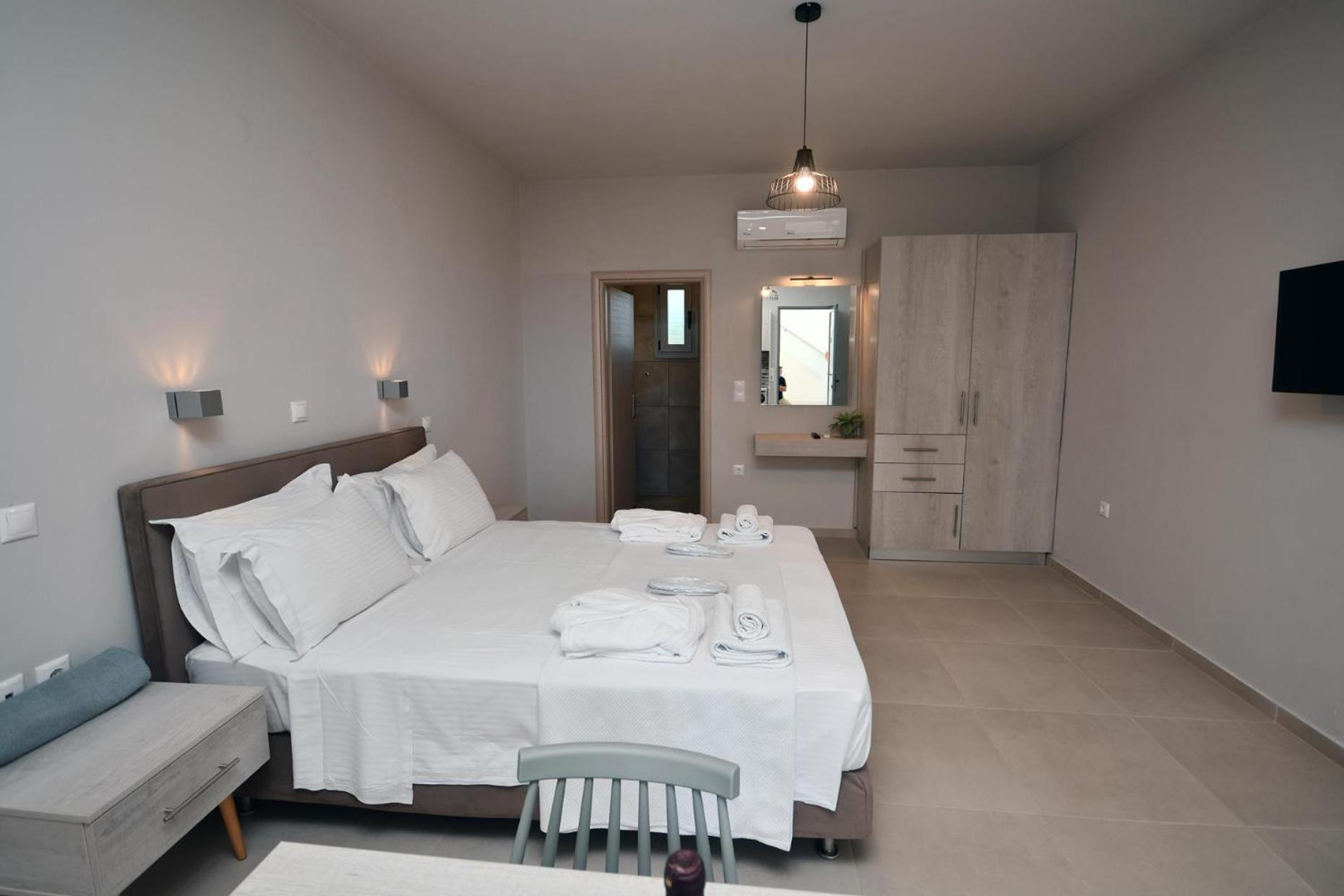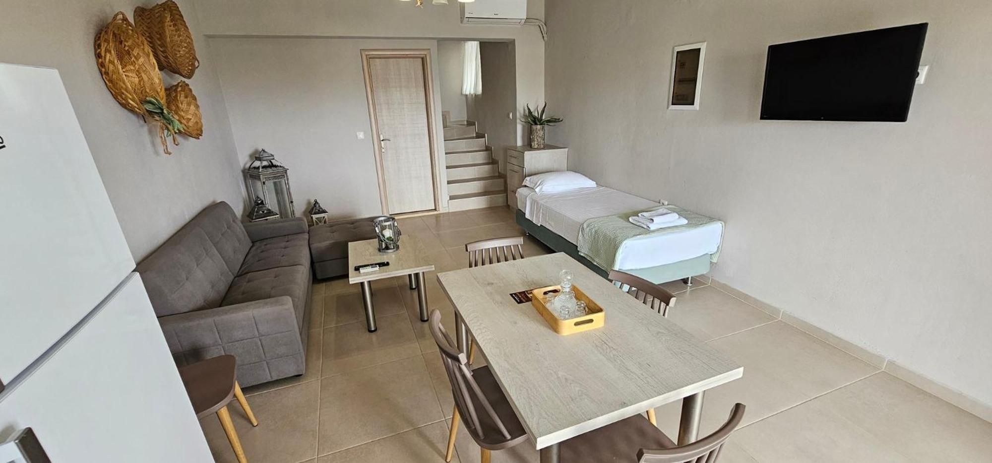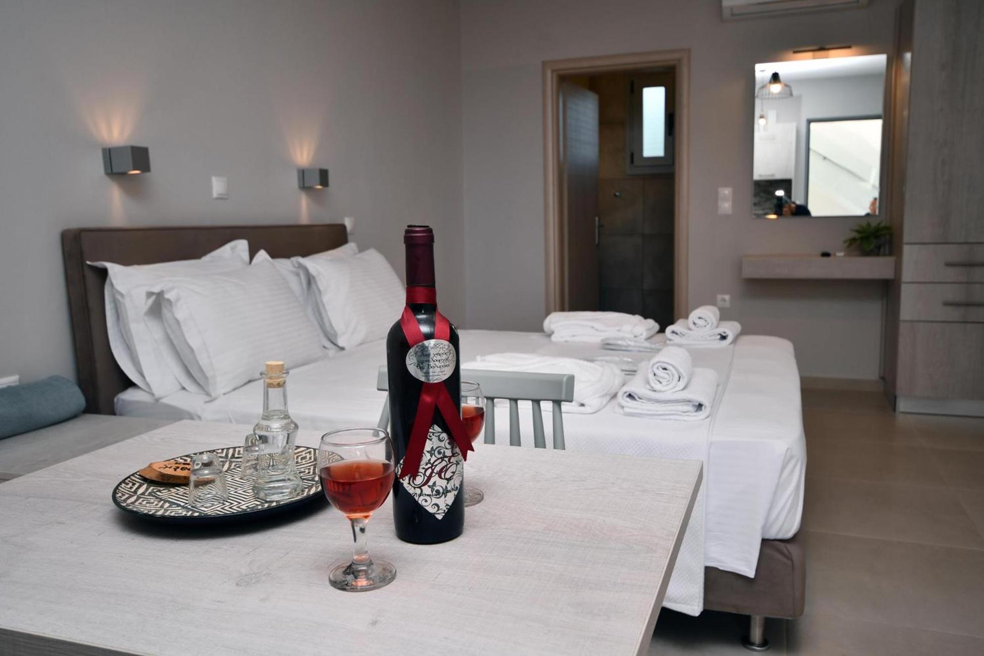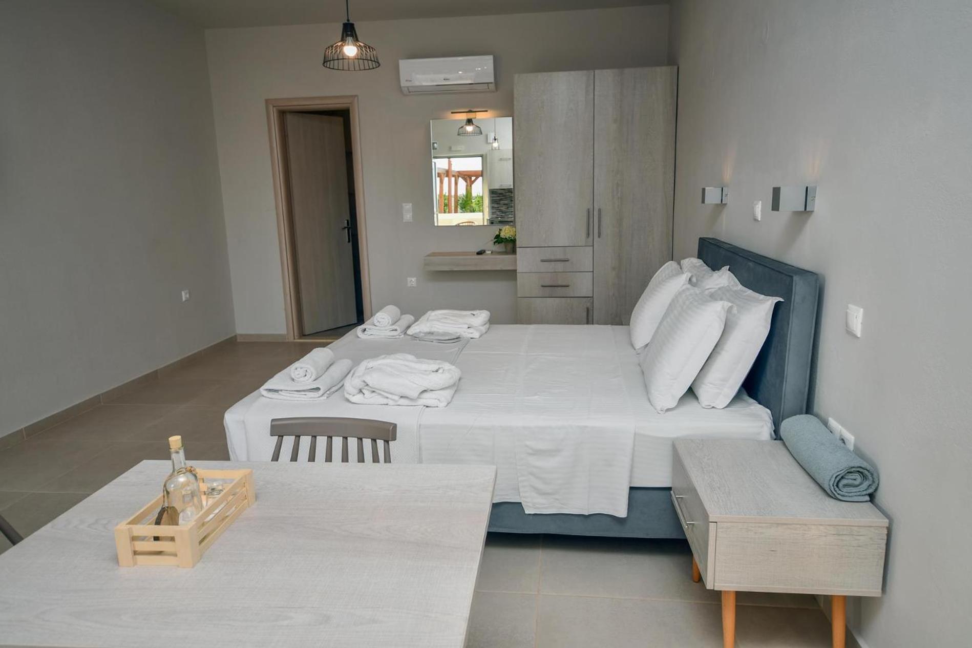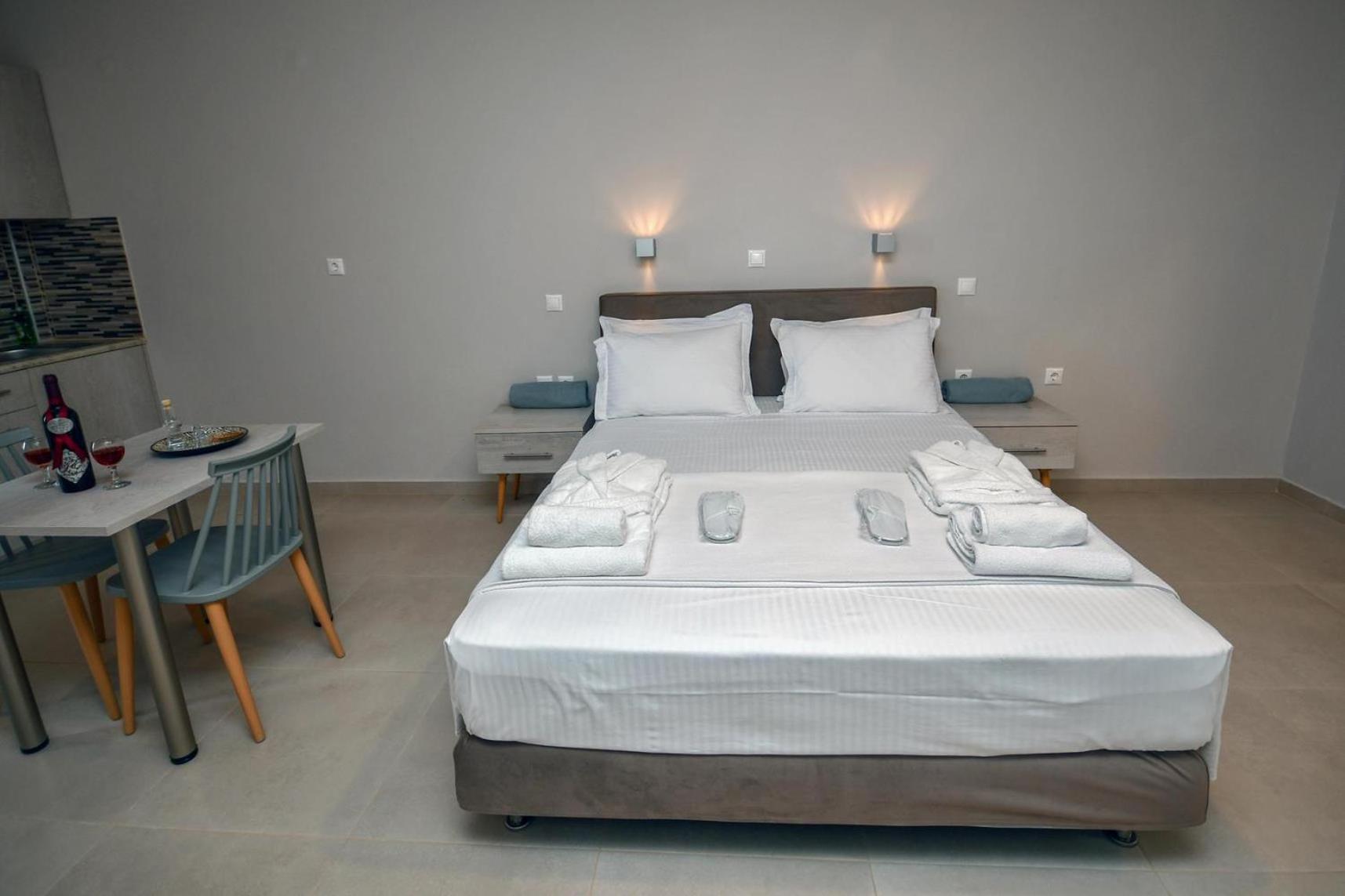Asterisuites in Makry Gialos offers a perfect blend of luxury and comfort, with spacious family rooms and a private entrance for your convenience. Each air-conditioned unit boasts modern amenities like a coffee machine, flat-screen TV, and a private terrace overlooking the mesmerizing sea.