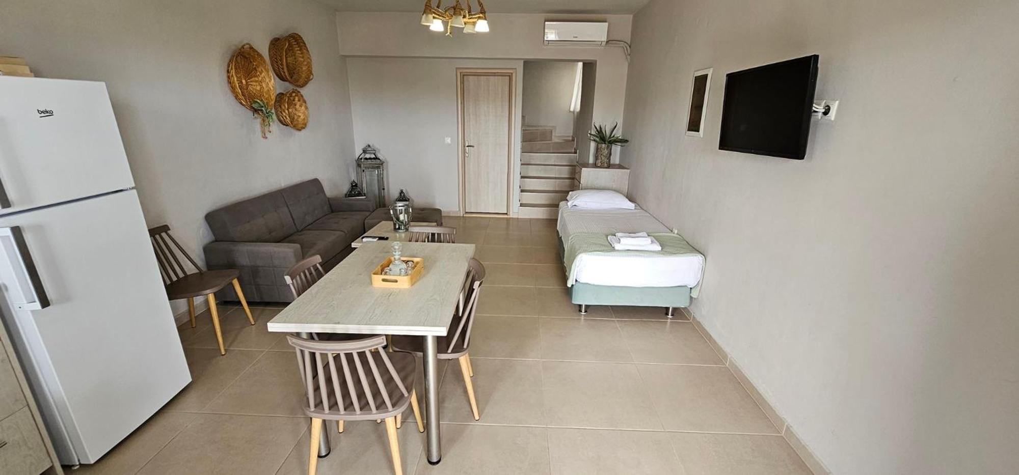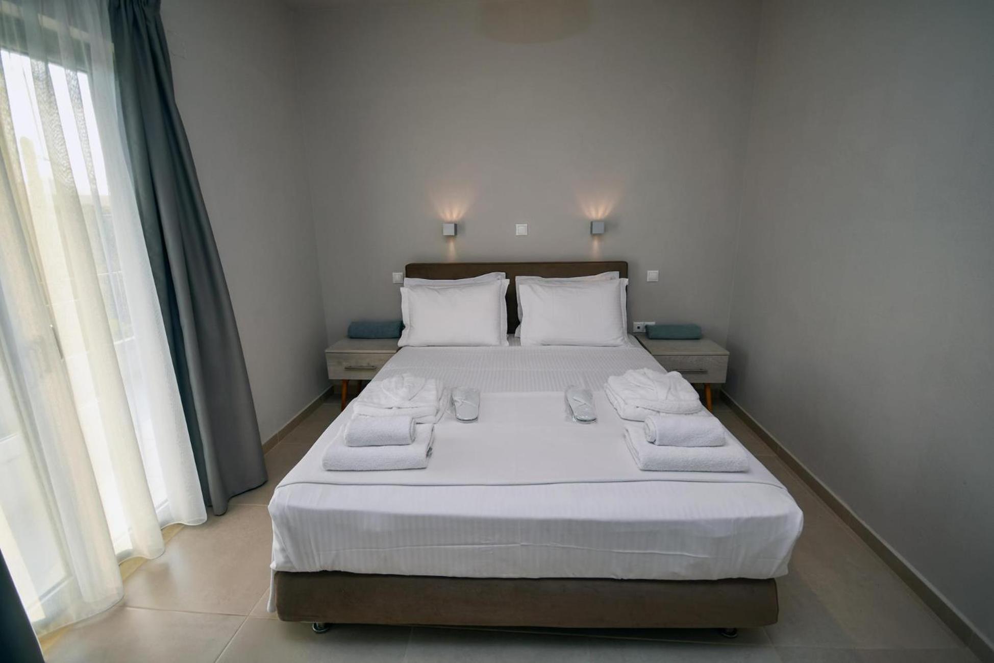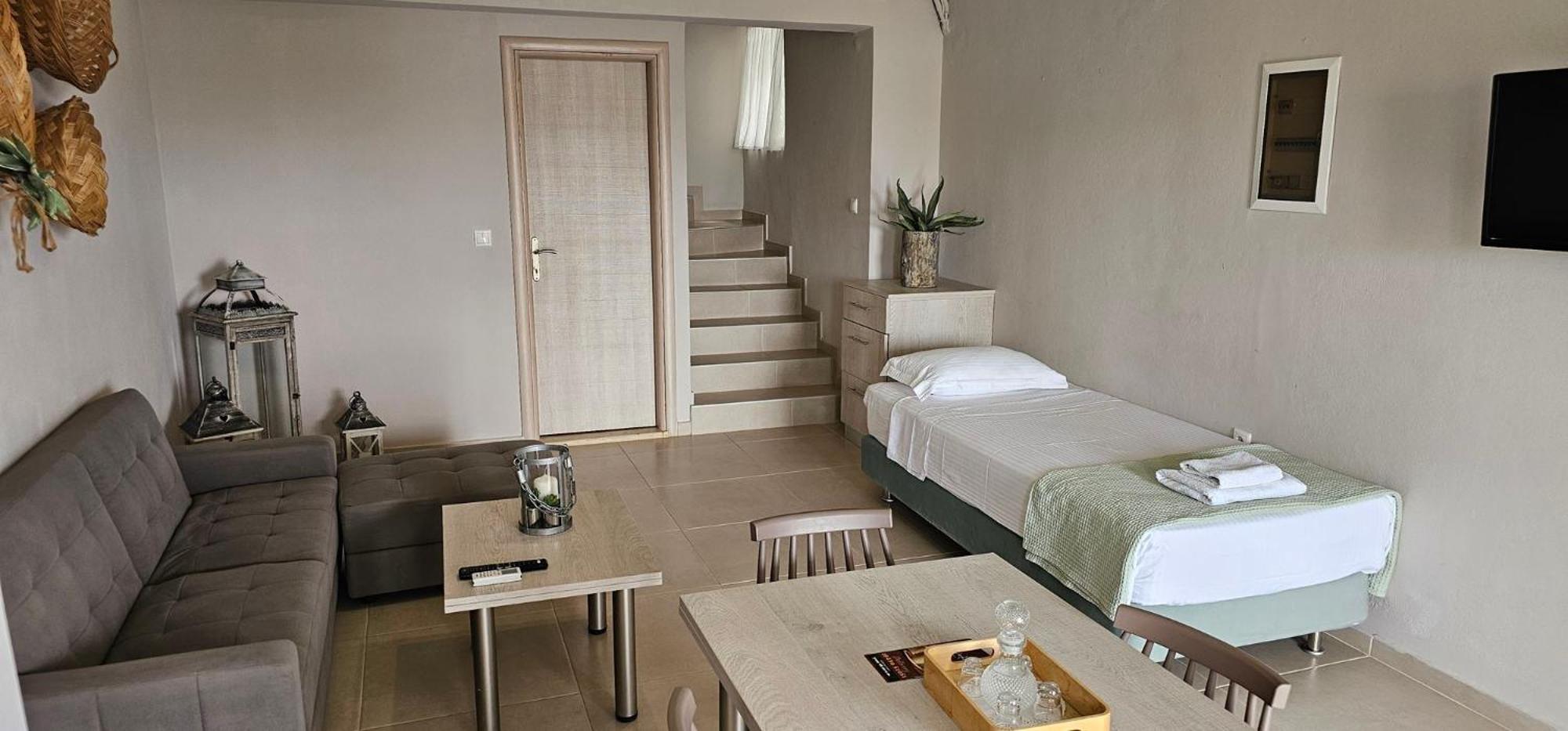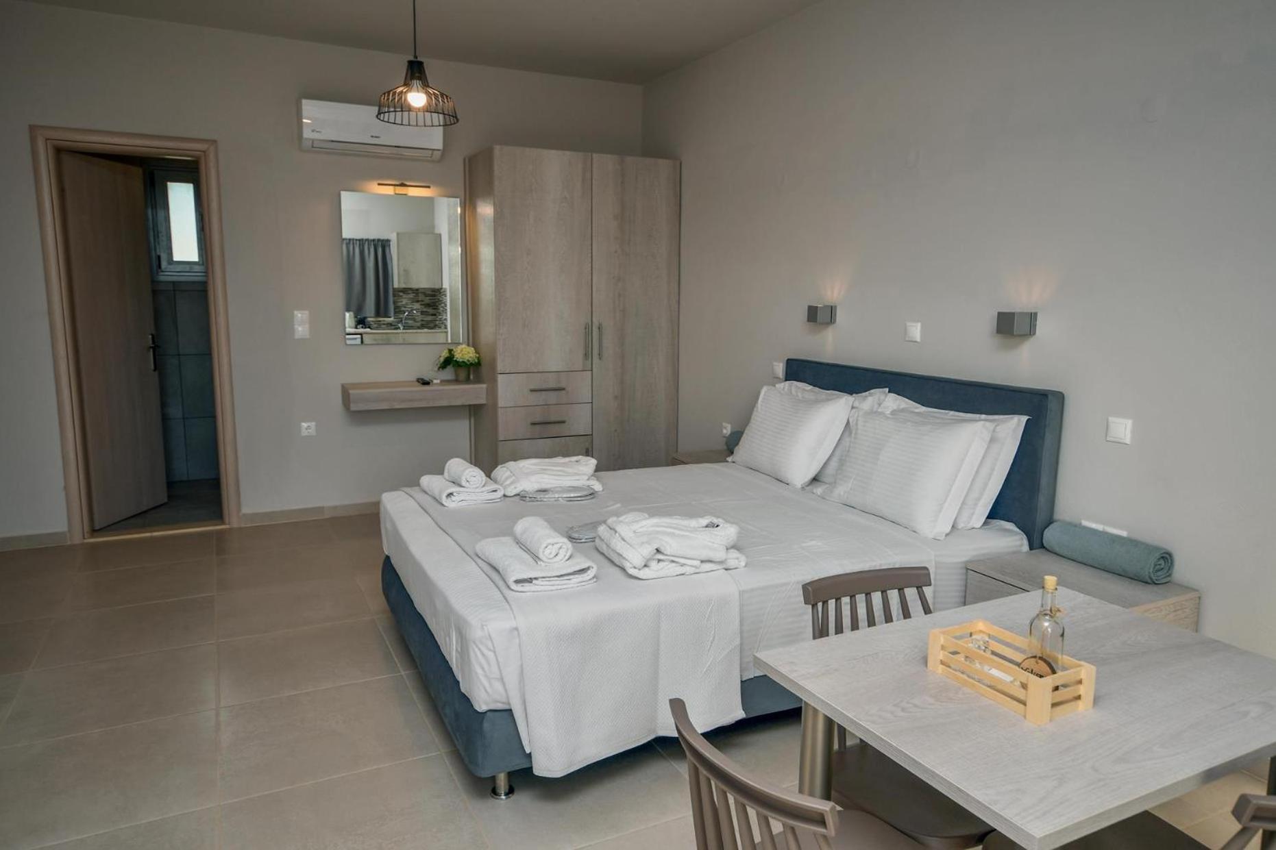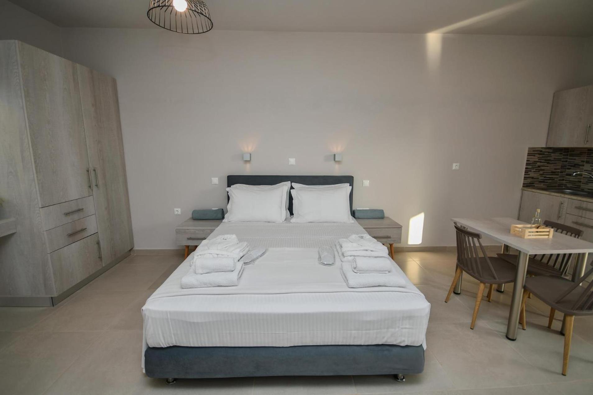 Asterisuites in Makry Gialos offers a perfect blend of luxury and comfort, with spacious family rooms and a private entrance for your convenience. Each air-conditioned unit boasts modern amenities like a coffee machine, flat-screen TV, and a private terrace overlooking the mesmerizing sea.