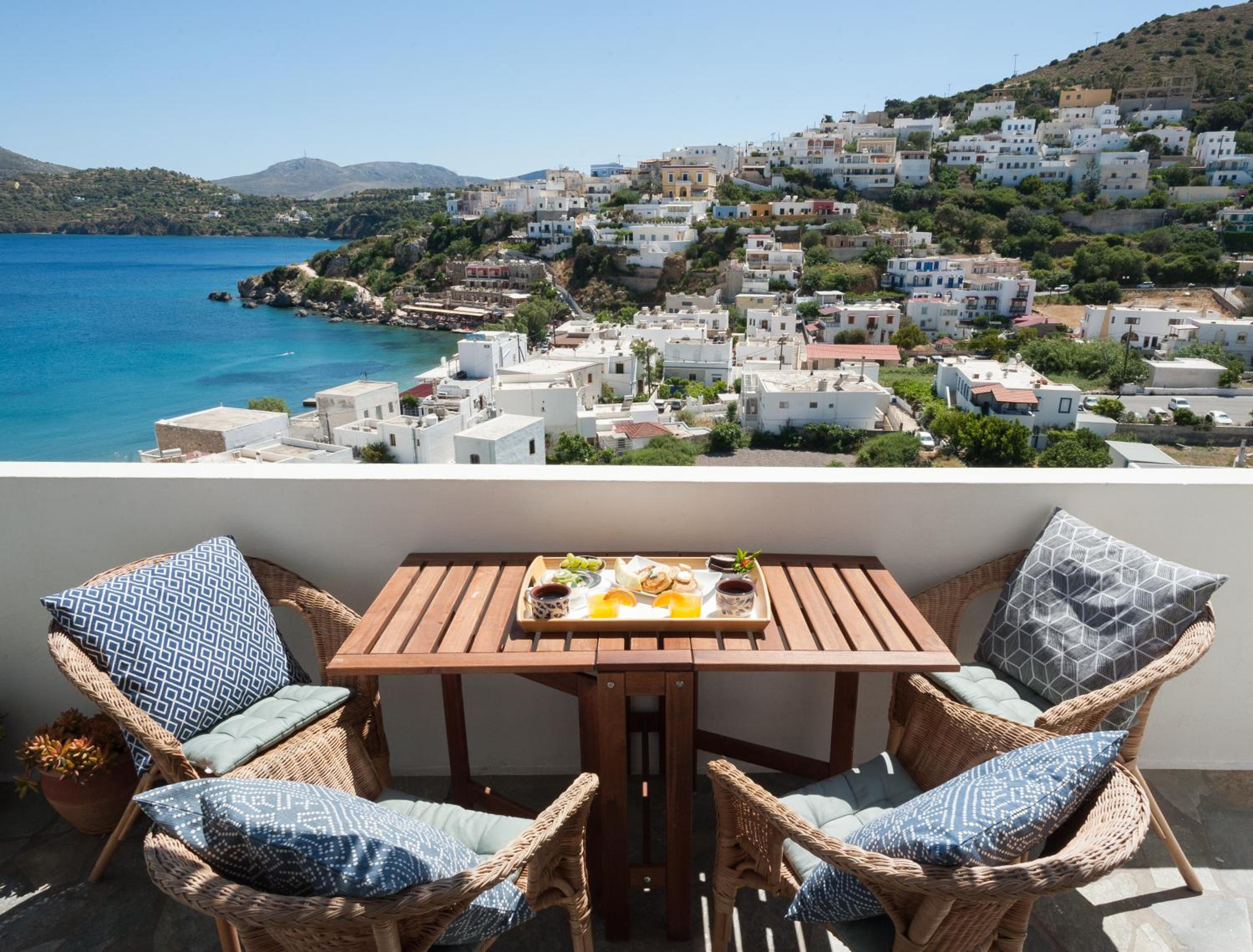 The location was very handy for the village and also for walking to Platanos. The veranda was large with comfy furniture and a fabulous view over the bay. The room was large with a big comfy bed. We had everything we needed.