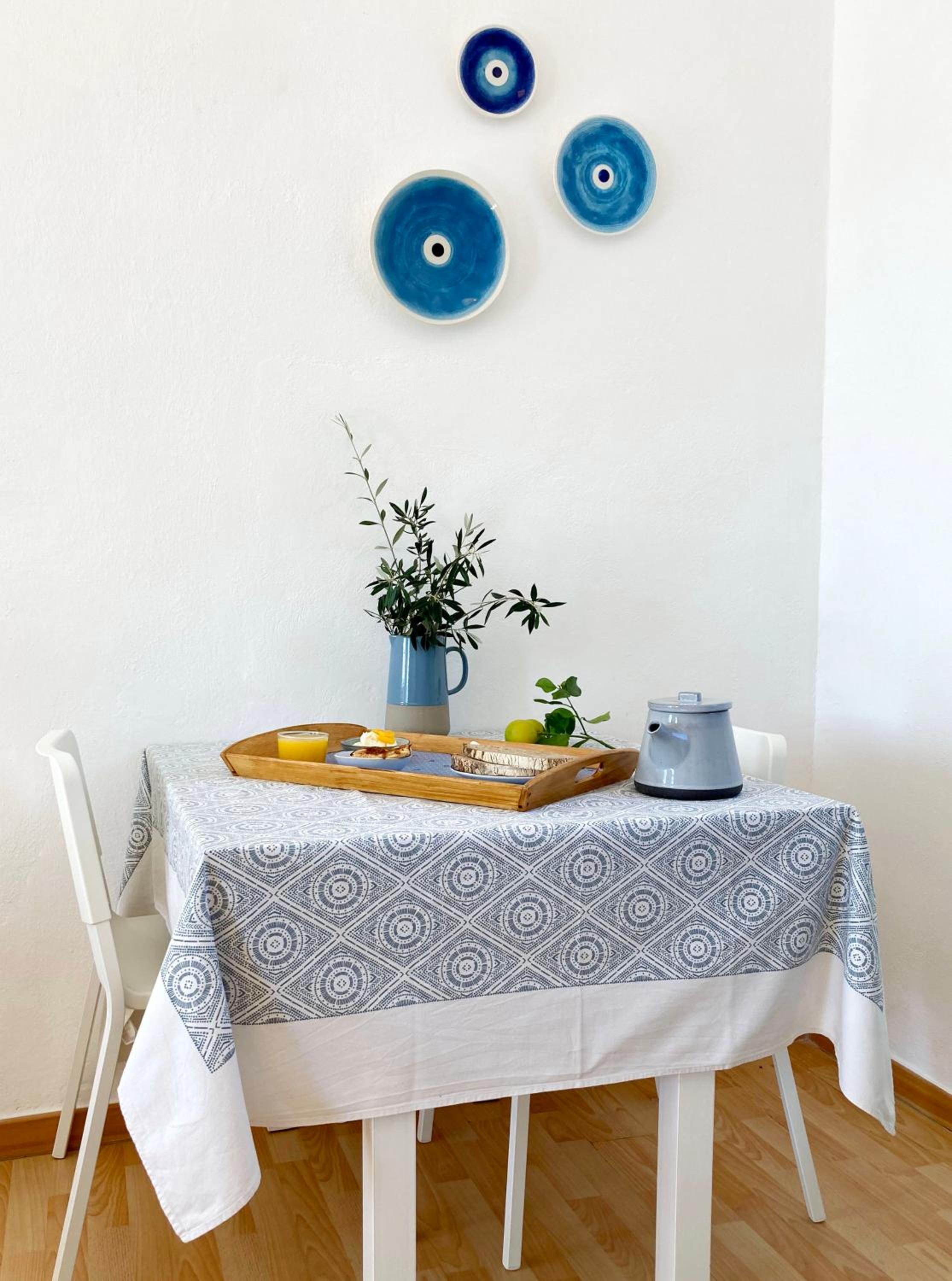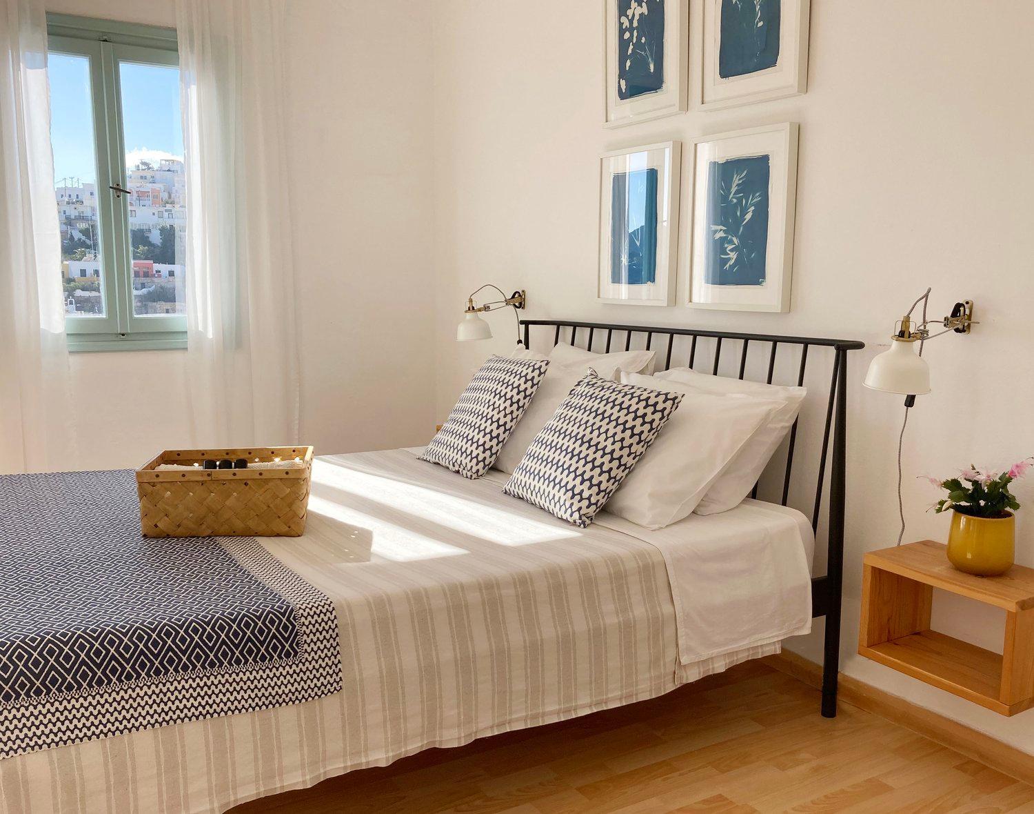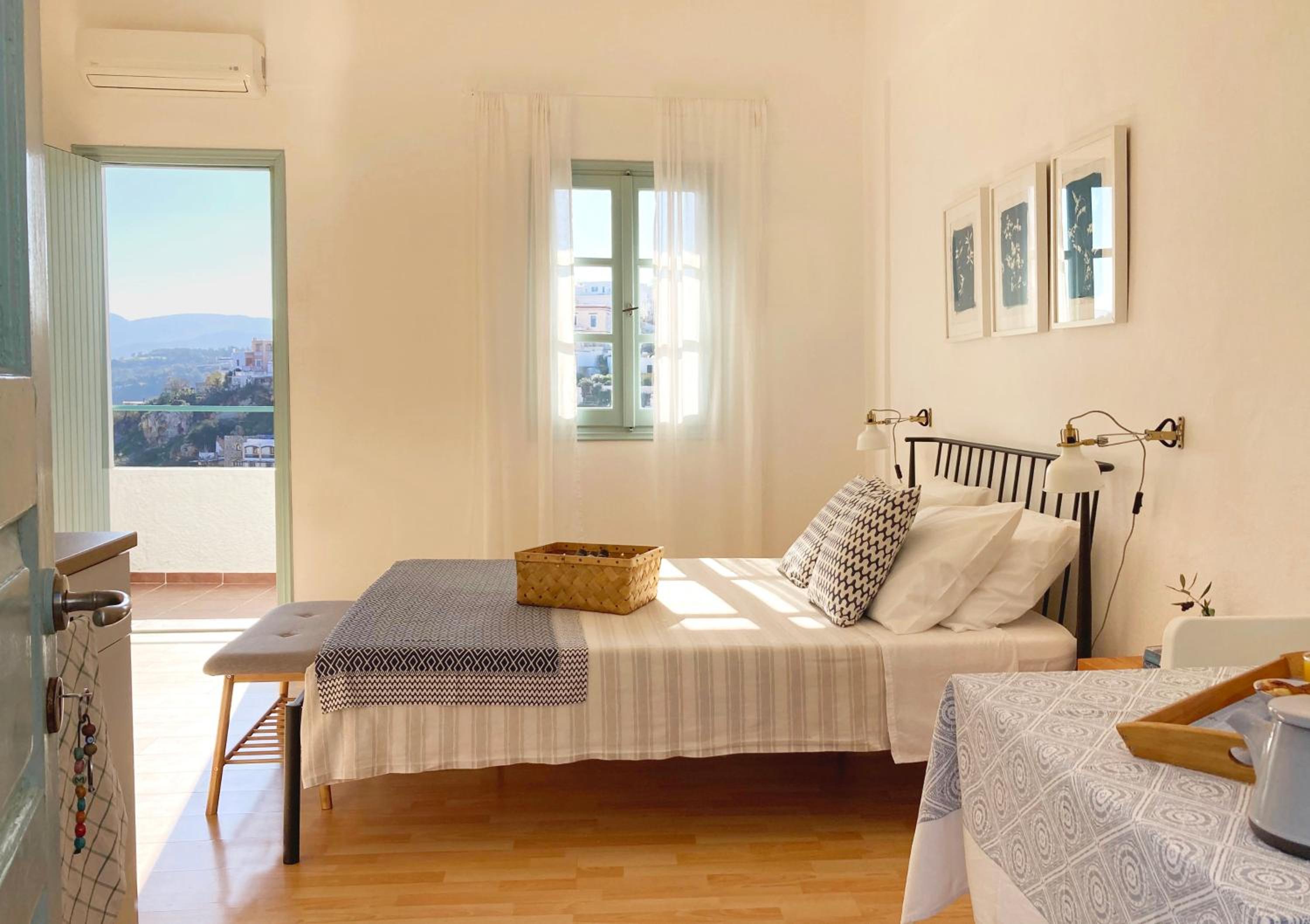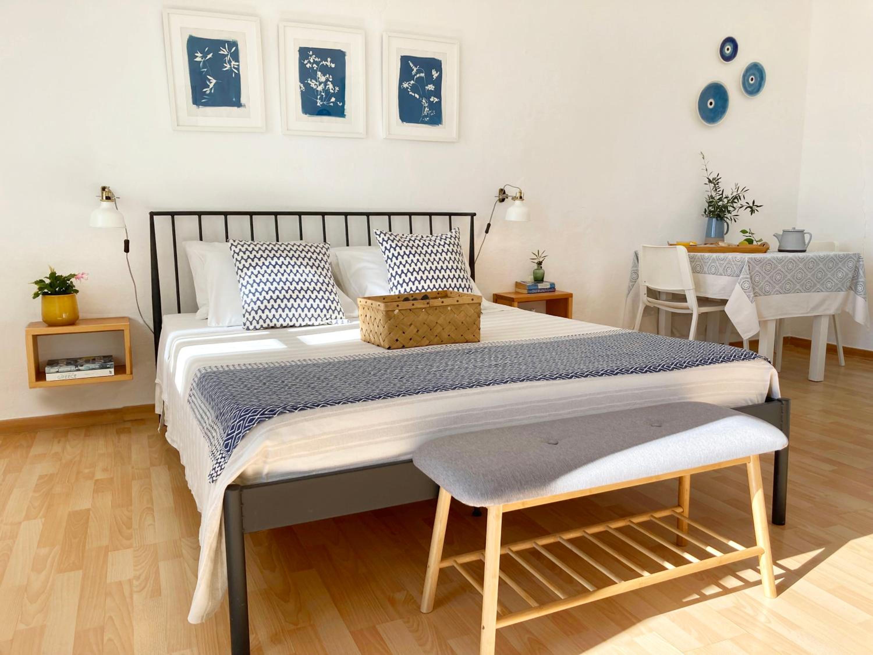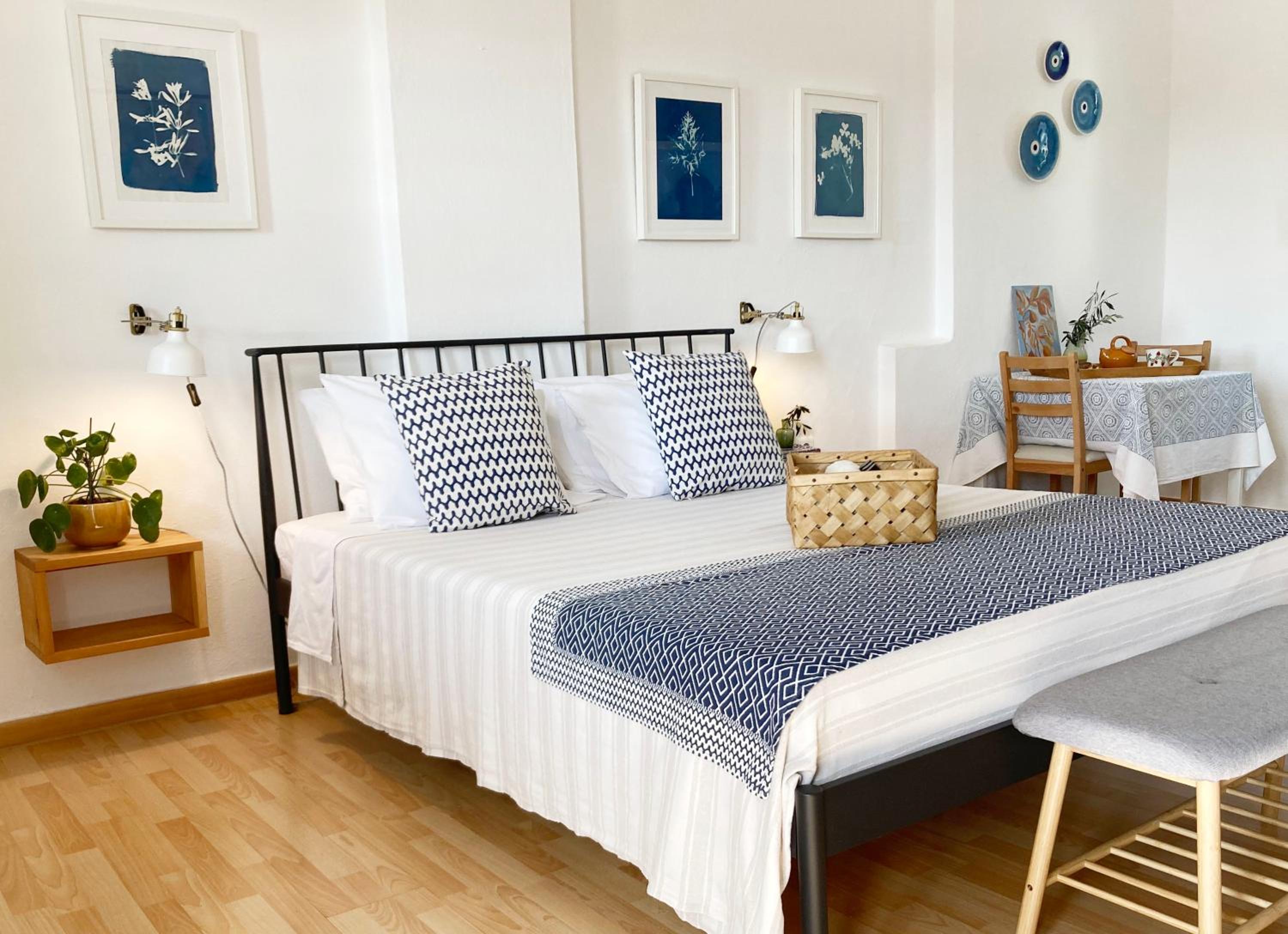Enjoy the stunning Aegean Sea views from your balcony at Asterias. The traditional Cycladic style building offers elegantly decorated accommodation in white and blue tones, with wooden floors adding a touch of warmth to the rooms.