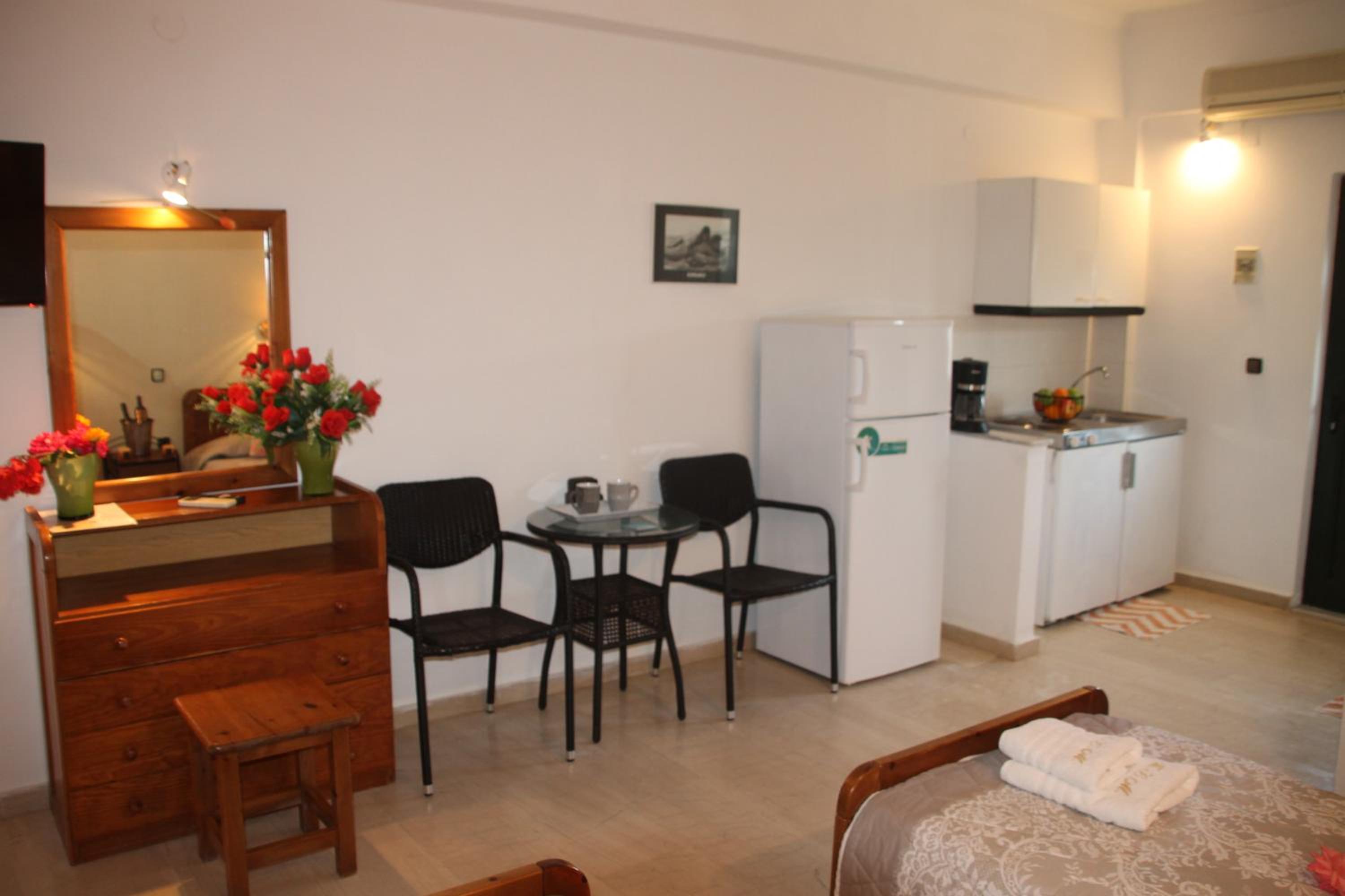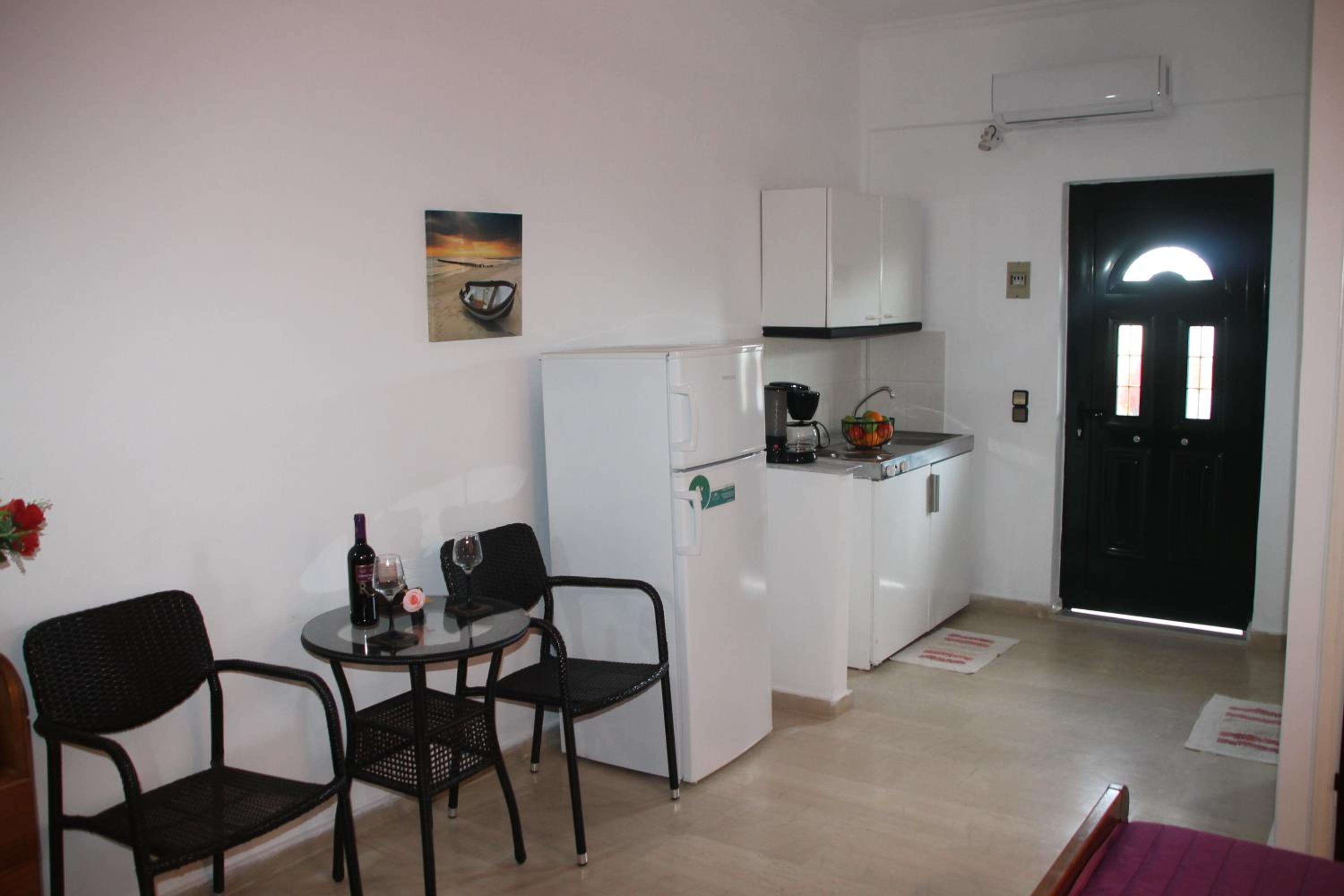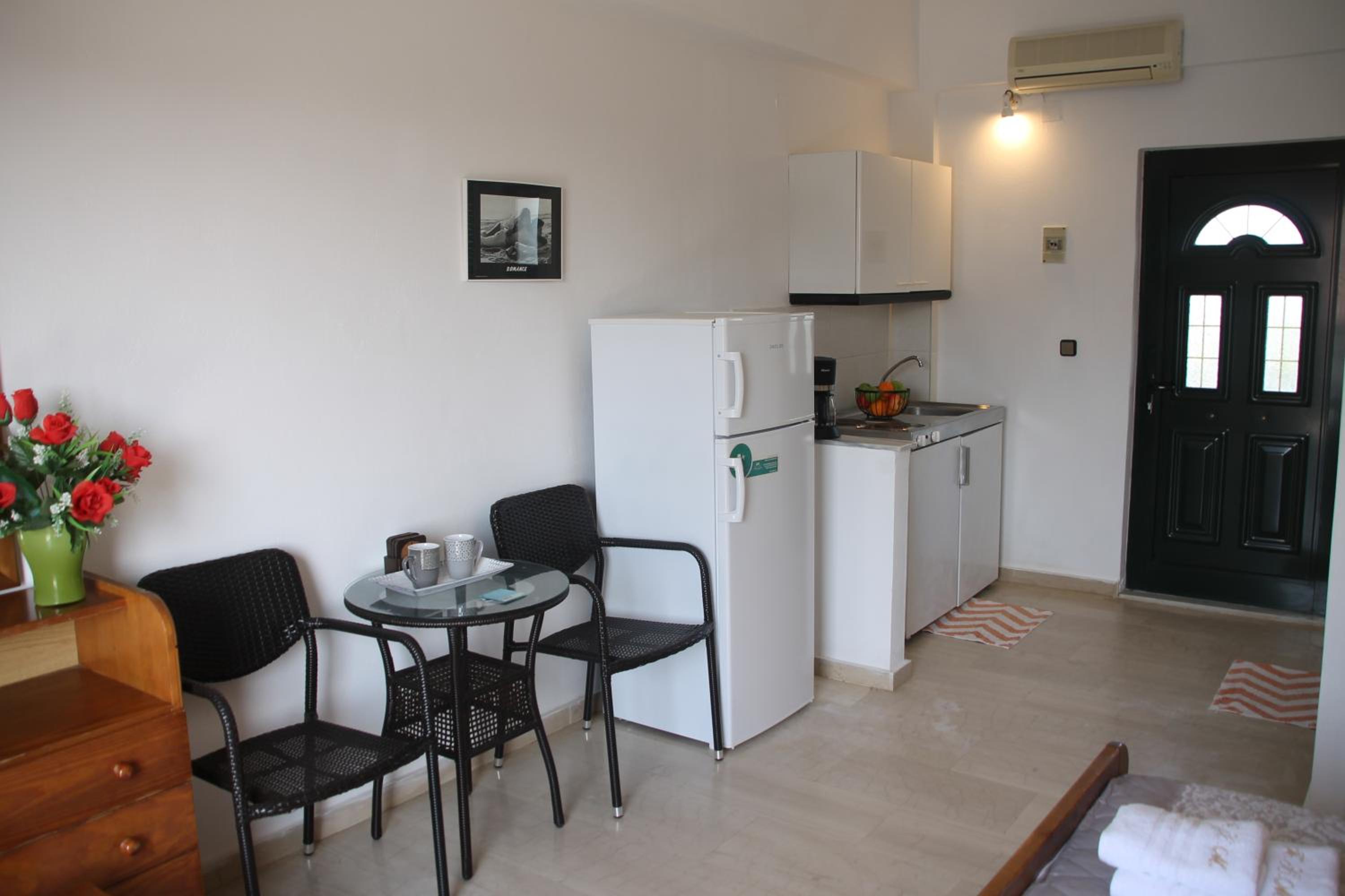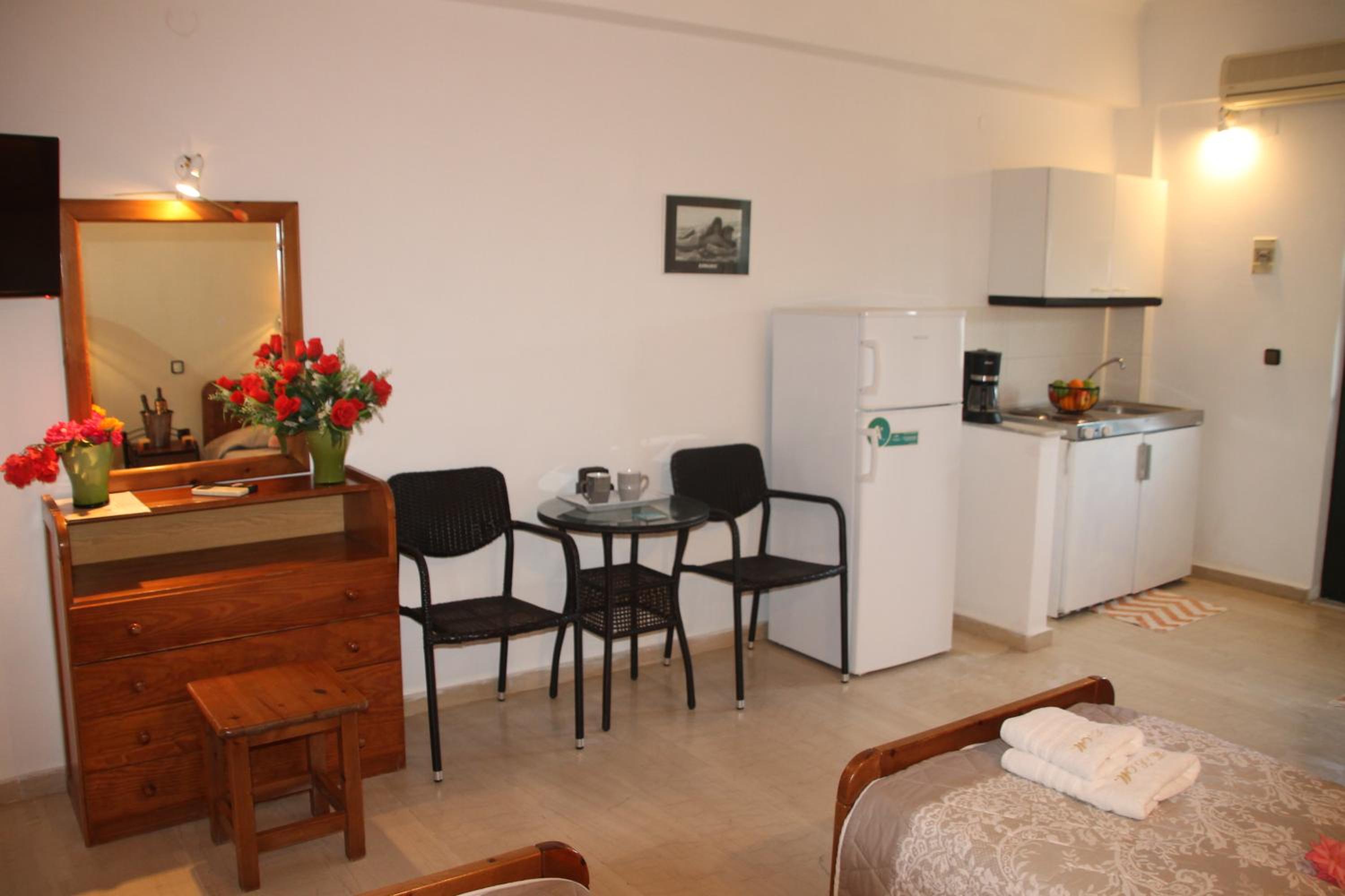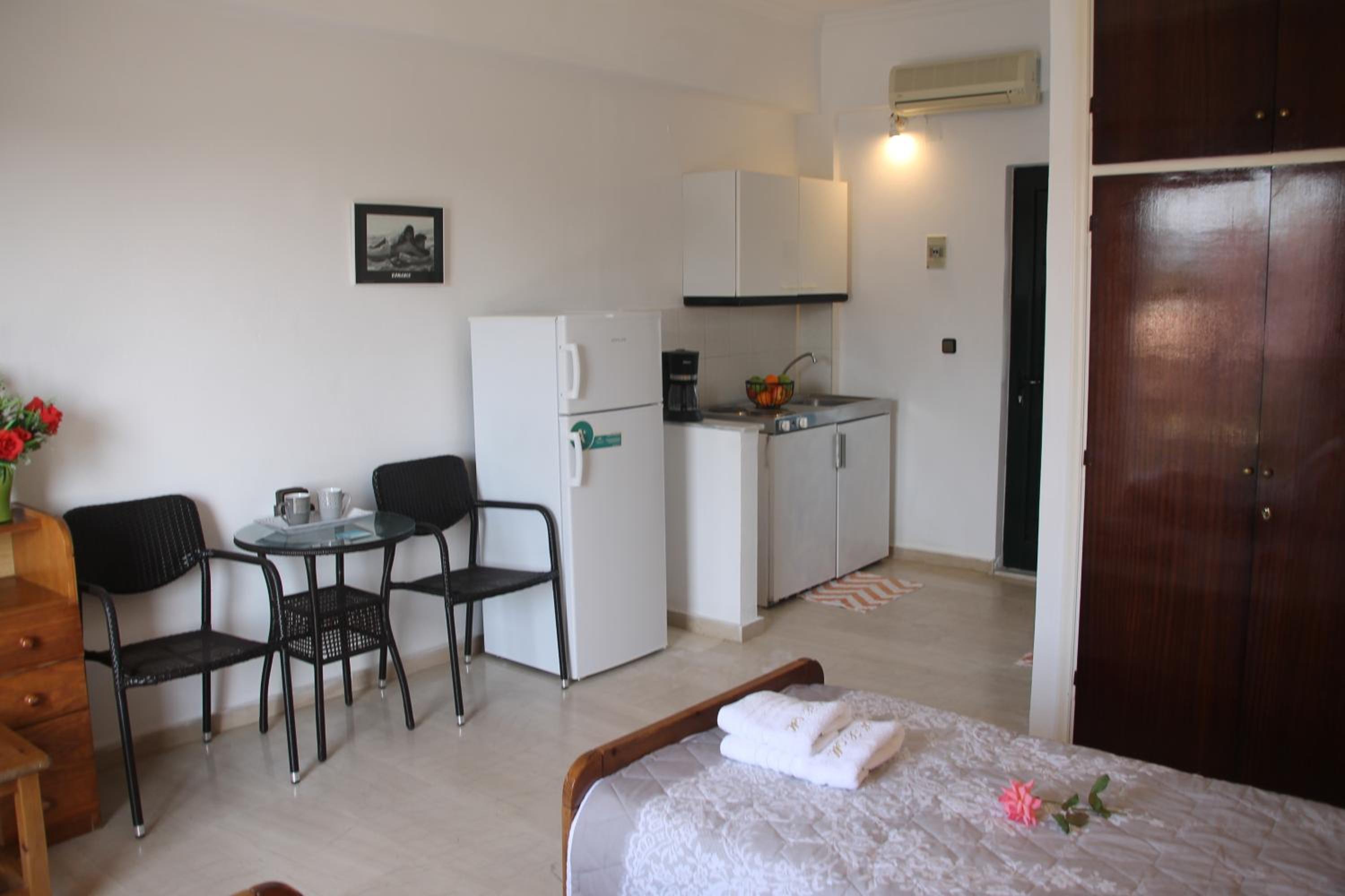 Die Lage ist ideal, nur ein paar Schritte zum Strand. Ruhig gelegen, in einer Seitengasse.In der Nähe Restaurants und Supermärkte. Kostas ist ein unheimlich netter und hilfsbereiter Gastgeber.Mistkörbe wurden täglich geleert, nach drei Tagen Gab es frische Handtücher.