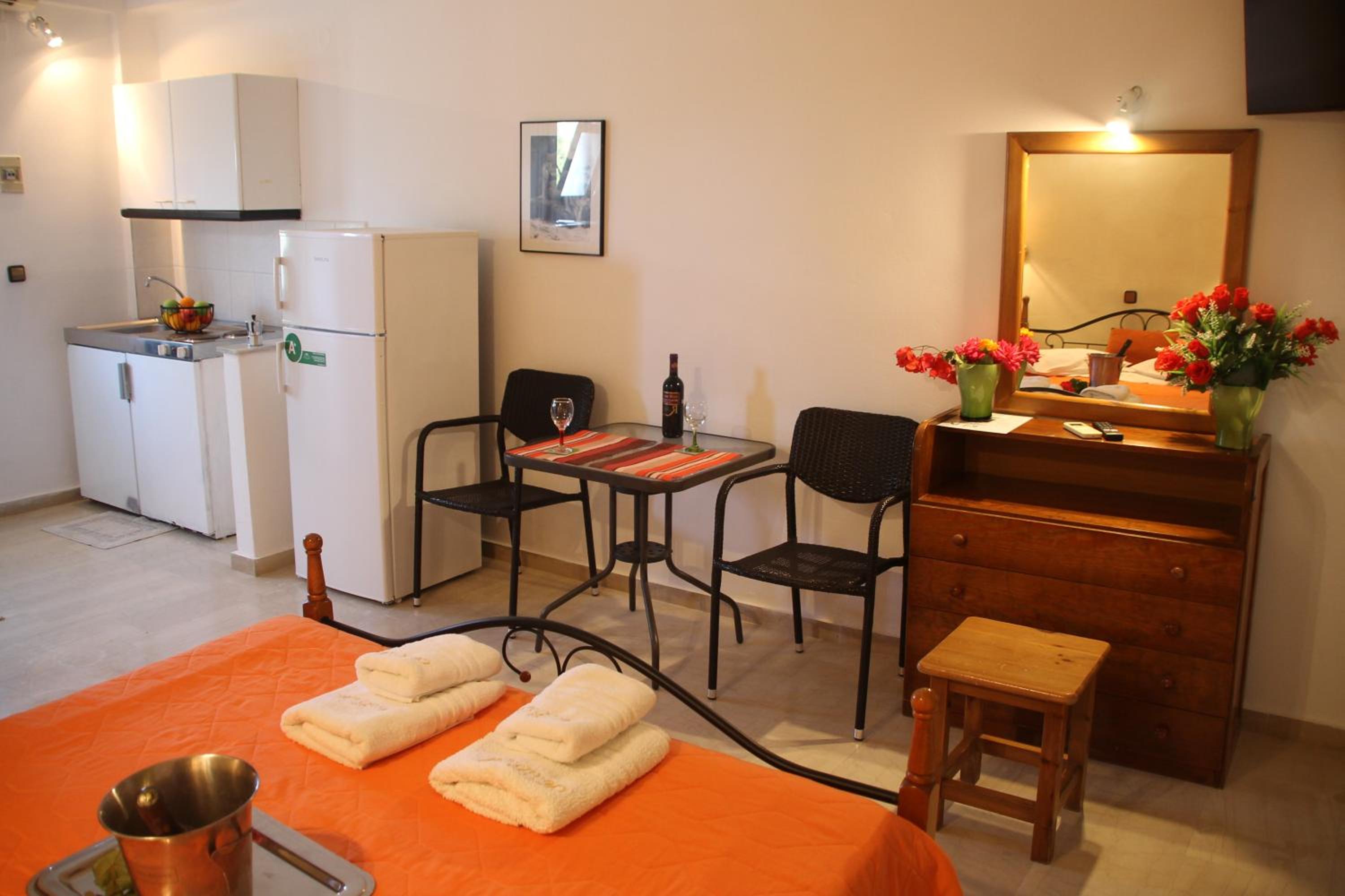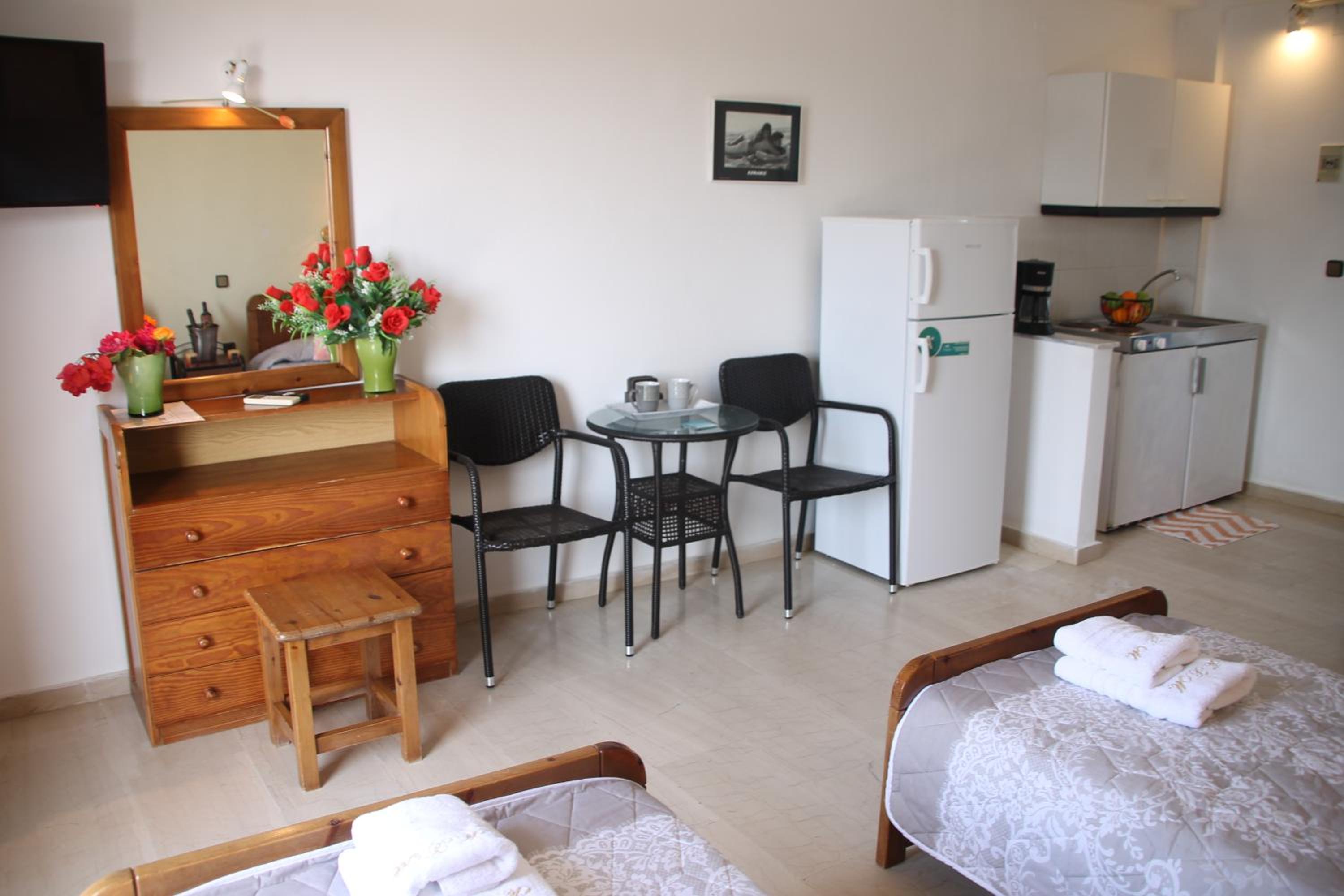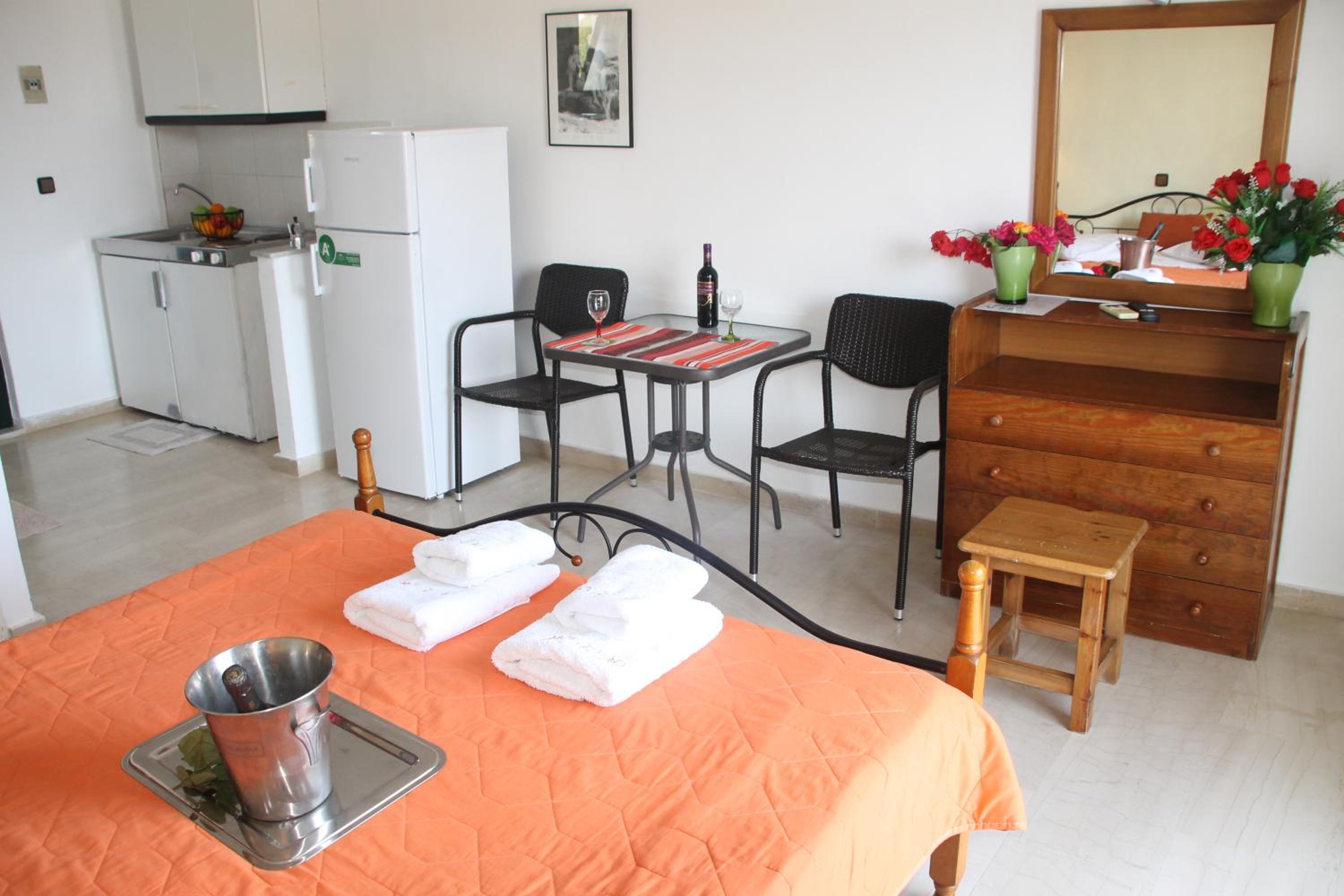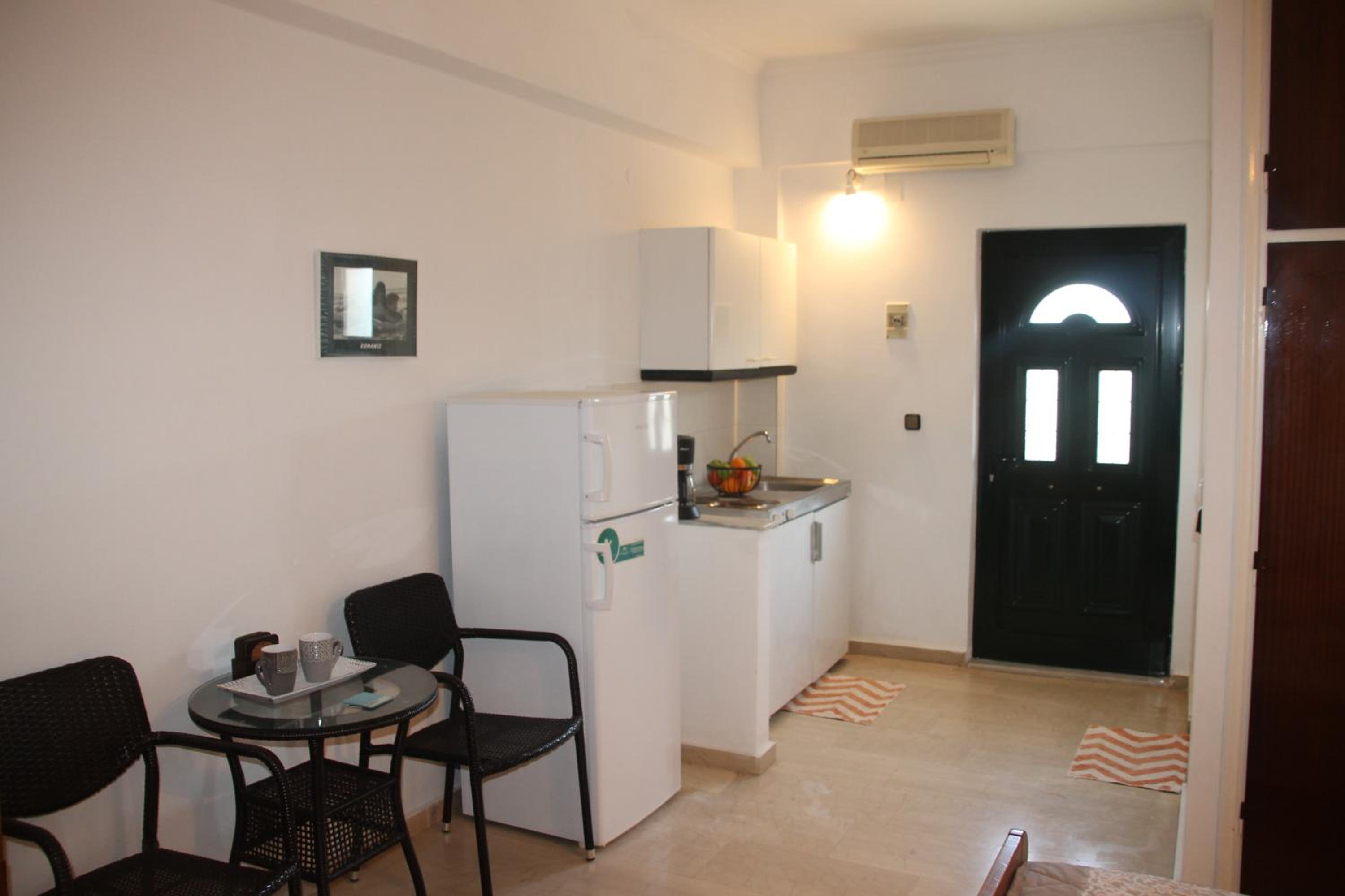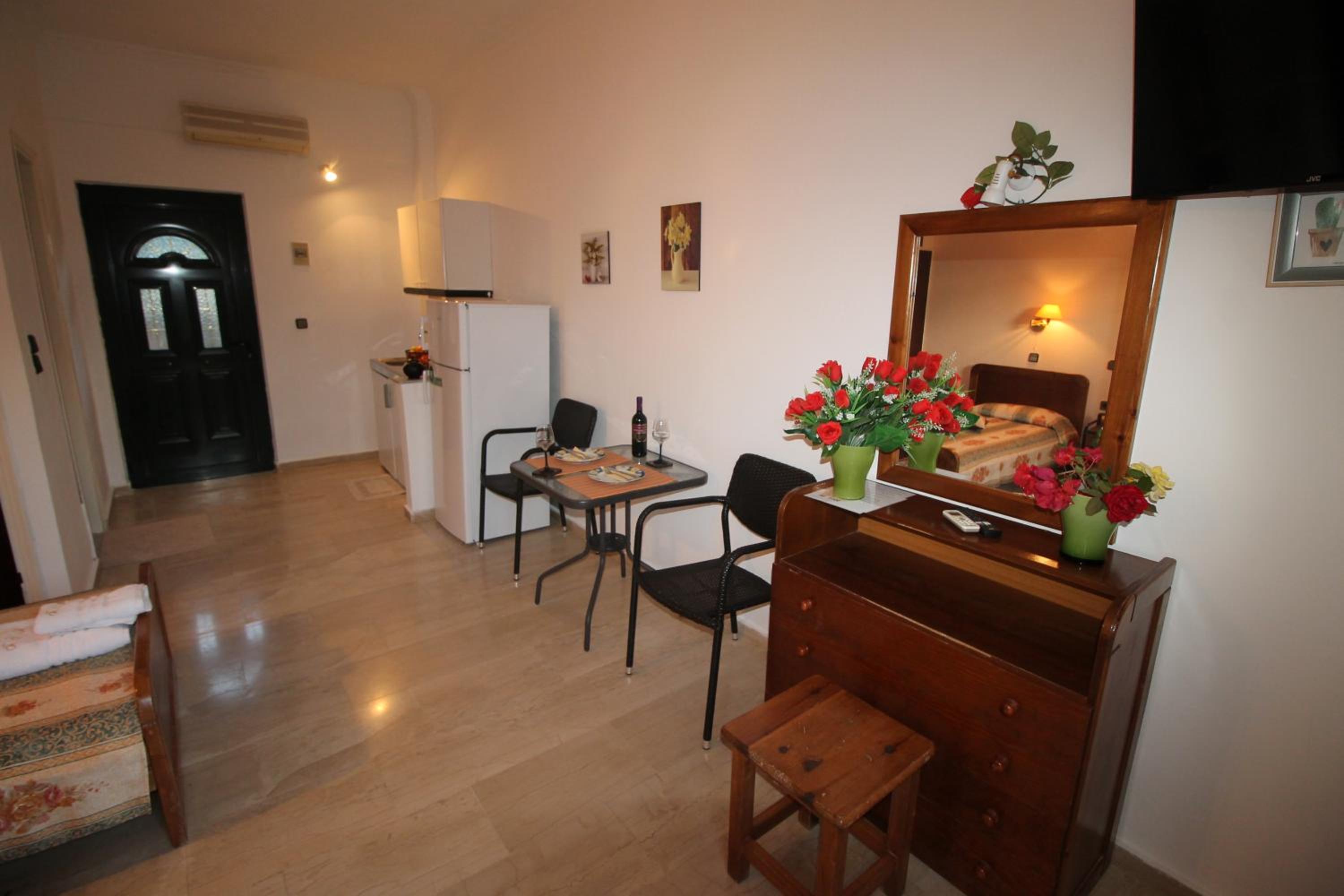 Die Lage ist ideal, nur ein paar Schritte zum Strand. Ruhig gelegen, in einer Seitengasse.In der Nähe Restaurants und Supermärkte. Kostas ist ein unheimlich netter und hilfsbereiter Gastgeber.Mistkörbe wurden täglich geleert, nach drei Tagen Gab es frische Handtücher.