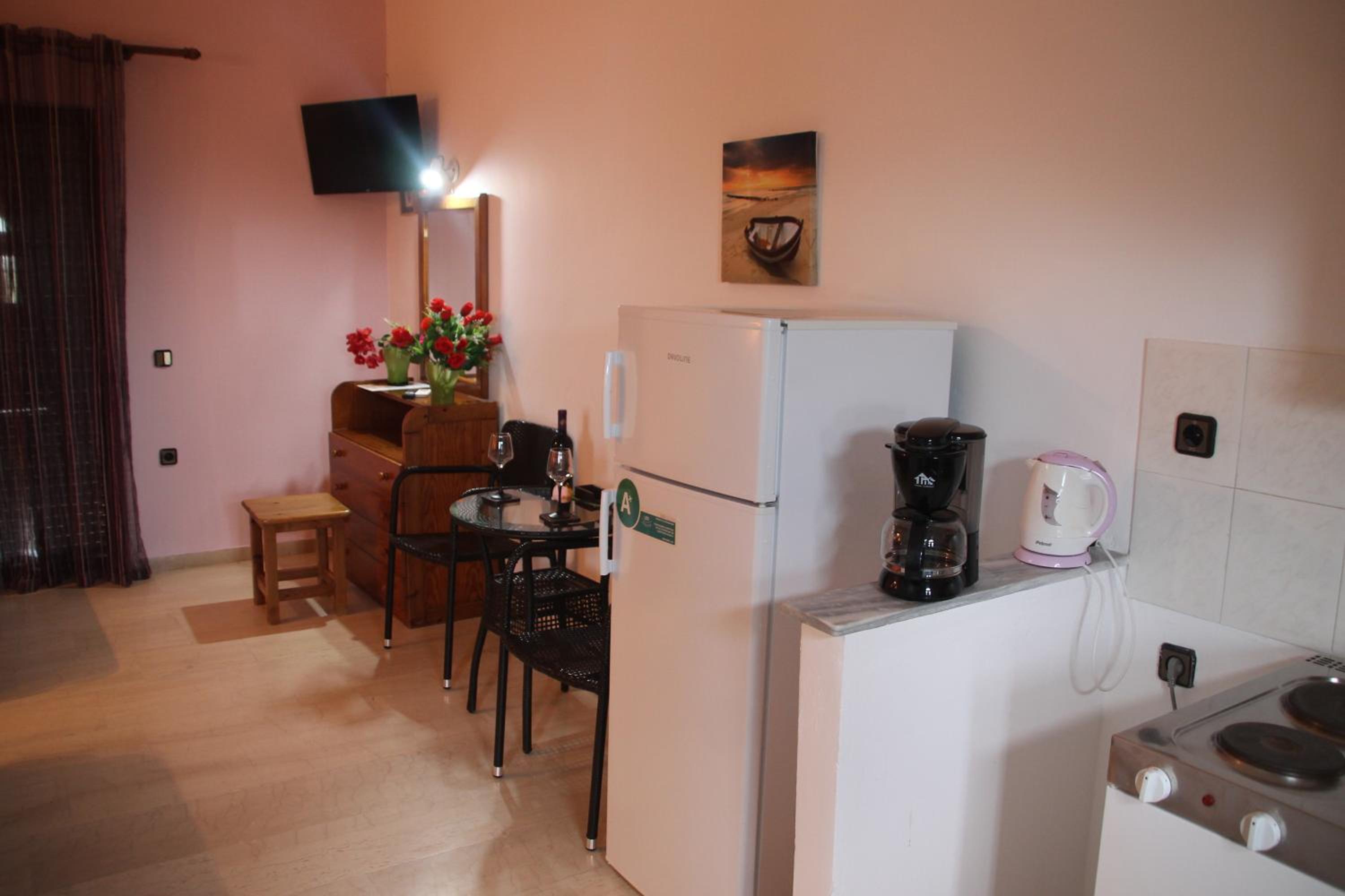 Отдых был чудесный. Хозяин встретил и поселил раньше. При встречи получили пакет домашних томатов. Комната просторная и чистая. Уборка мусора производилась каждый день. Апартаменты немного отдалены от кафе. Поэтому тихо уютно.