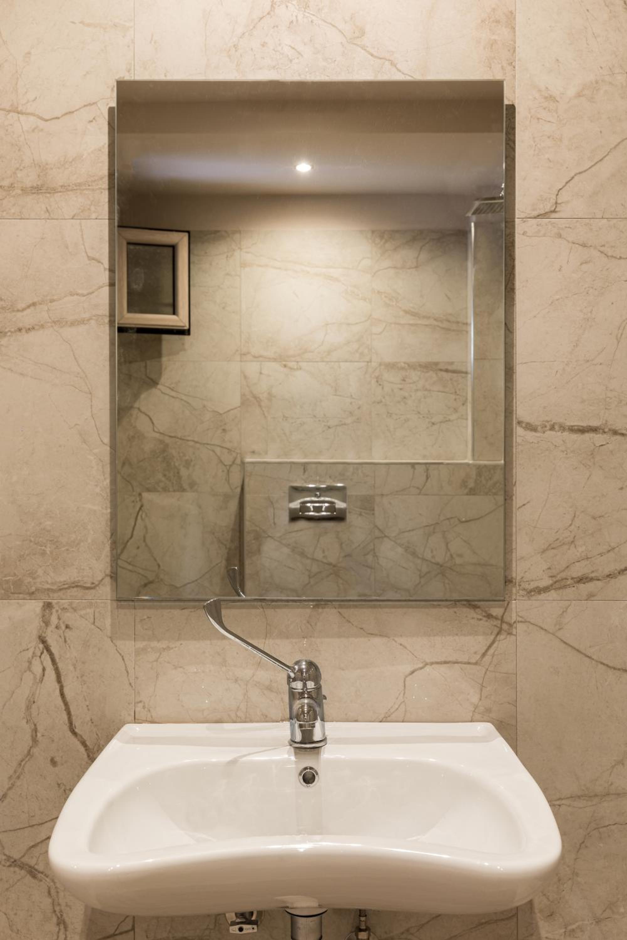 Типично за Гърция отделеното простеанстви за баня и тоалетна не е голямо, но въпреки това е приемливо (виждали сме далеч по-тесни и неудобни пространсрва. В банята има прозорче, което е разположено дотолкова ниско, че не позволява да се отвори напълно, защито глеса към коридора към стаите и би се нарушила дискретността. Липсва мрежа против насекоми. Има възможност за открехване само отгоре, което частично облекчава ситуацията.