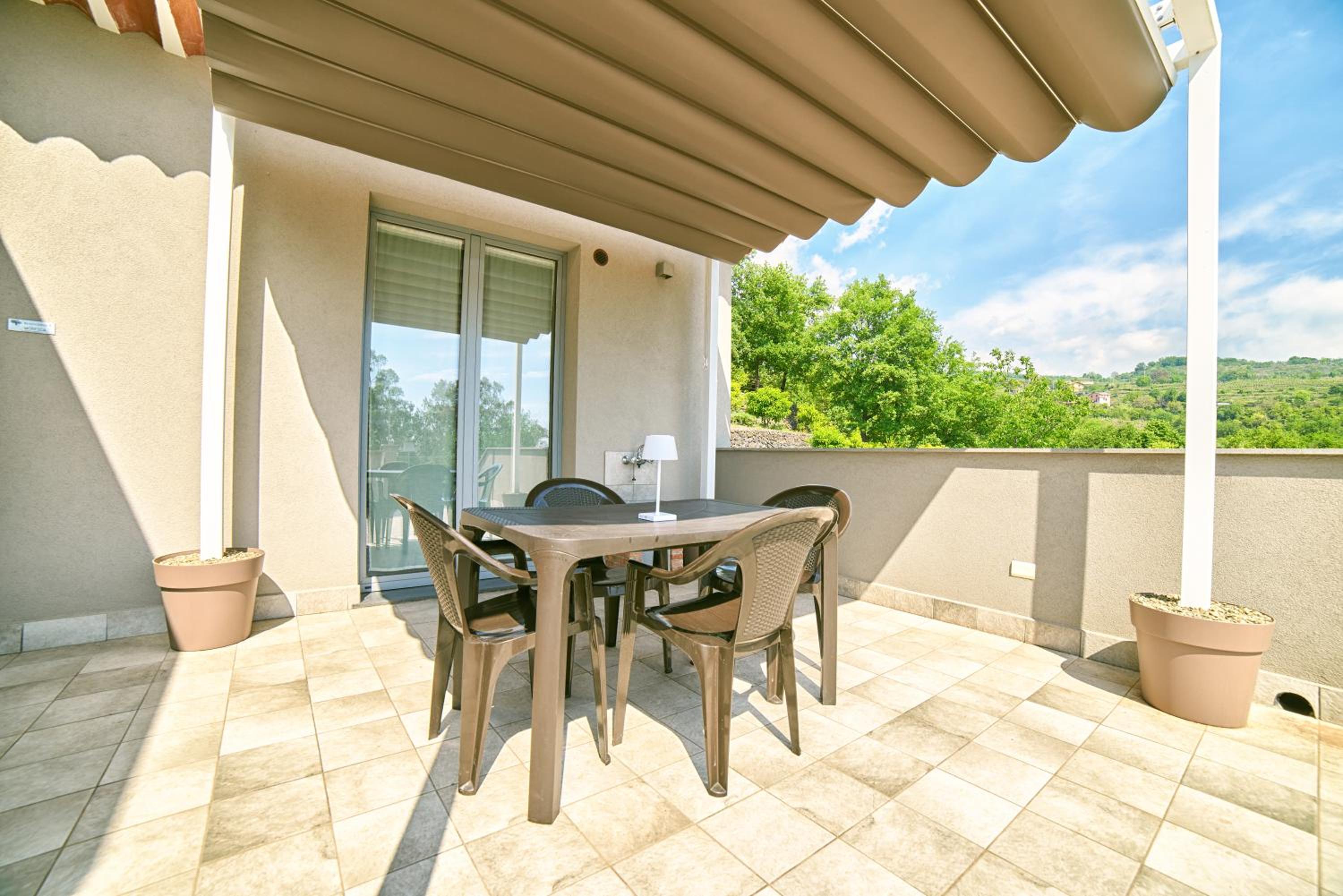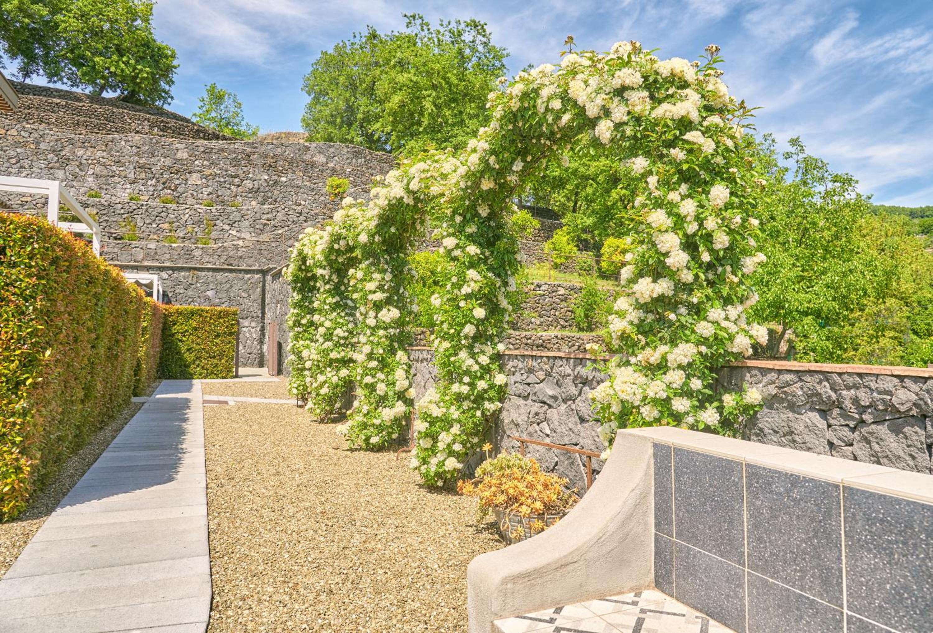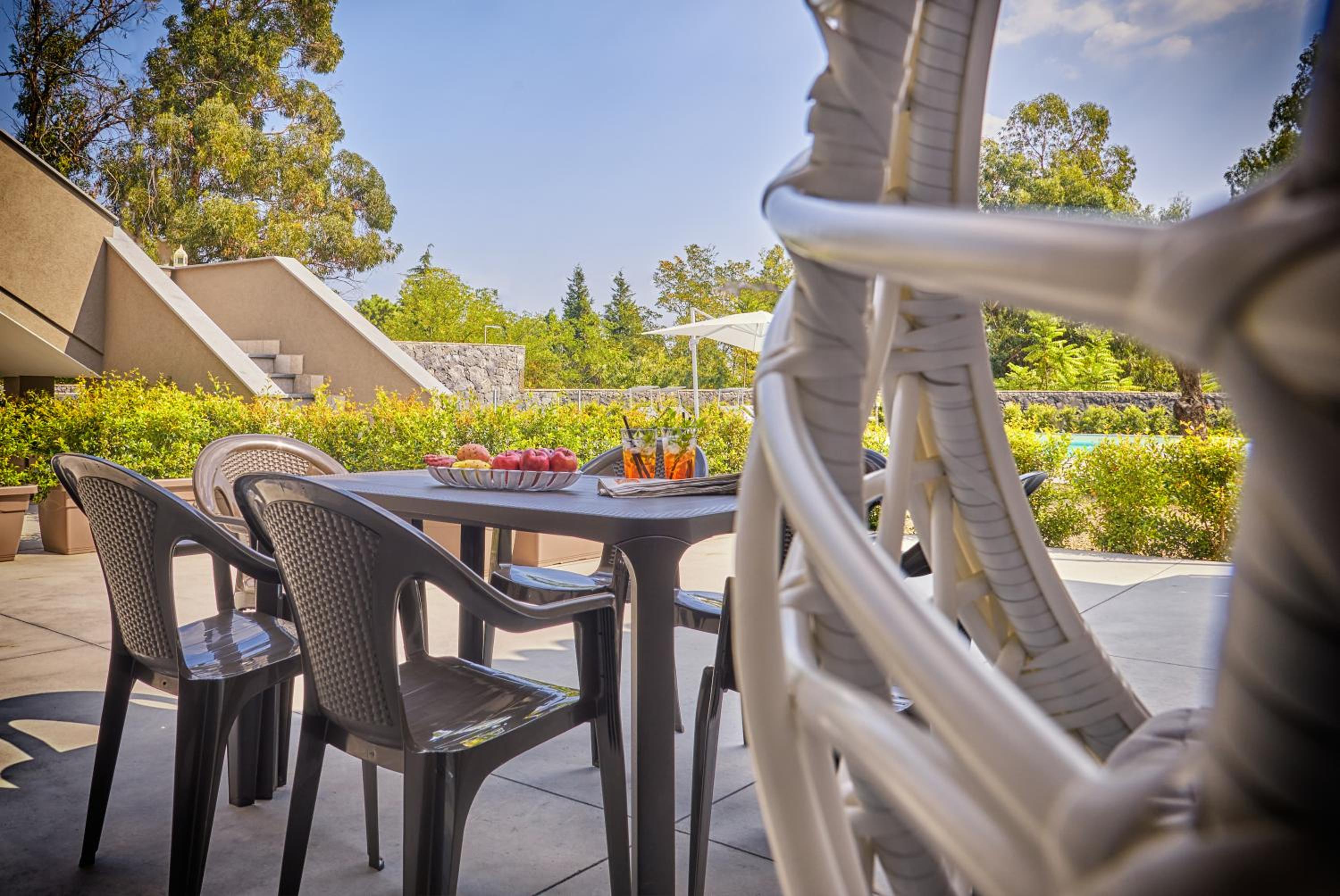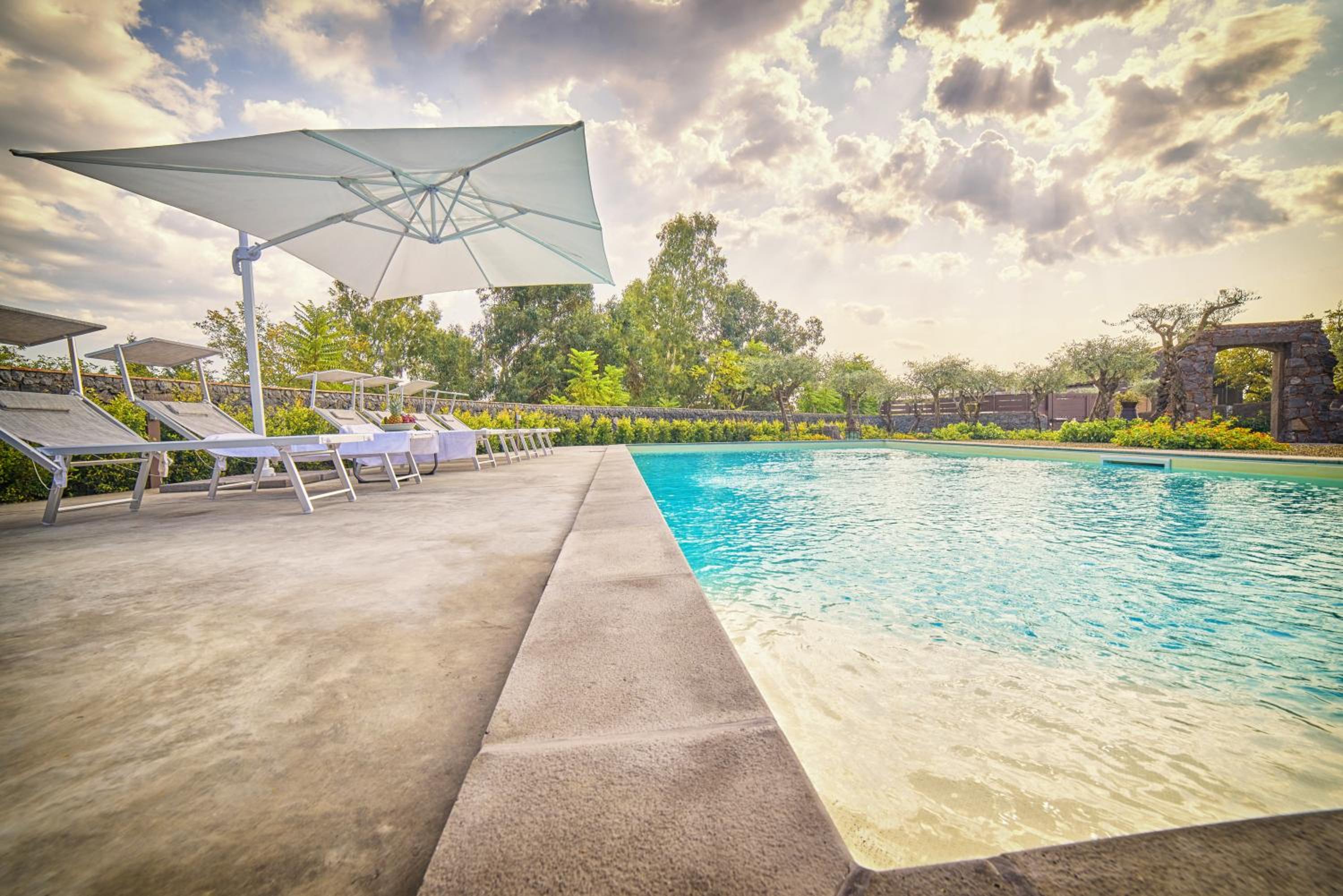 First, the grounds were beautifully manicured and designed! Our daughters spent loads of time sitting in the garden just soaking in the peacefulness next to the very clean, well-maintained pool (which I definitely took advantage of after the long Mt. Etna hike!) that had nice chairs and umbrellas as well. Our unit was on the second floor and had huge front and back patios! Loved having the washing machine and this was a great location to visit Mt. Etna (if you walk to the top of the property you can see it!) Bedroom itself was a little tight with the queen and one twin, and the other the twin bed was actually in the kitchen but my daughter didn't care. Host was lovely and responsive - she made sure to greet us as well as bid us farewell, and of course got us anything that needed restocking straight away. She truly cares about your experience and maintains a beautiful property!