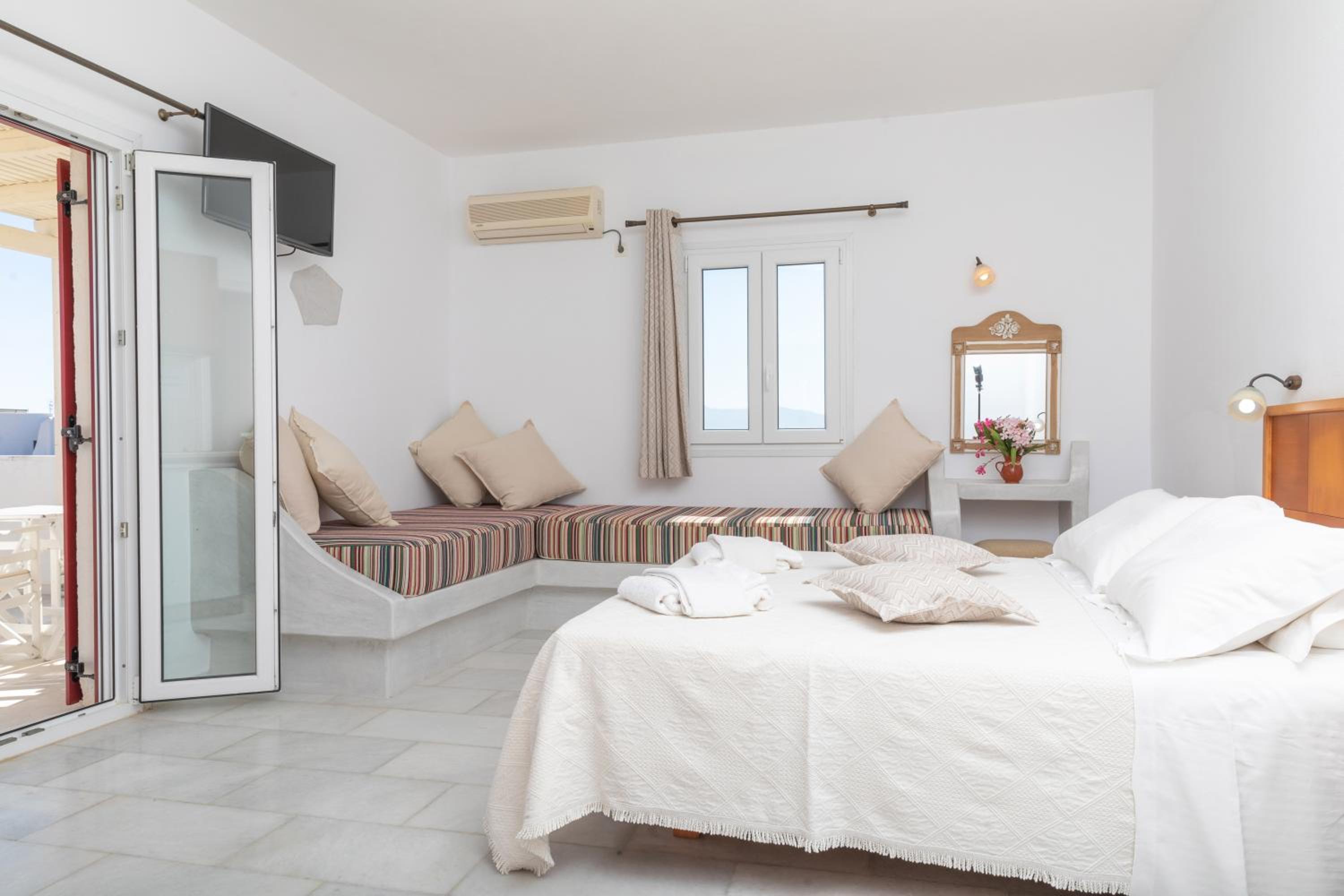 The Staff were amazing! Voula and her partner were very accommodating and hospitable. Took care of every thing we needed and there is car hire on site. €12 per massive bag of laundry & they return it to you dried & folded before the end of the day. 10minute walk to some of the nicest beaches in the world. 2-3mins on an ATV or in a Car. The Inside of the rooms were older, Reminded me of staying at my yaya & Papou’s house so was very nostalgic for me but just keep in mind that it is an old place.
