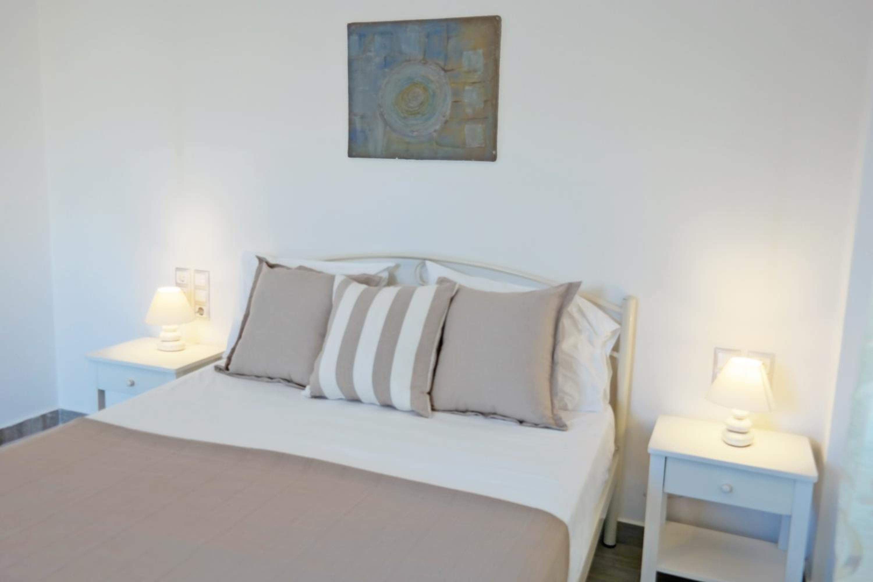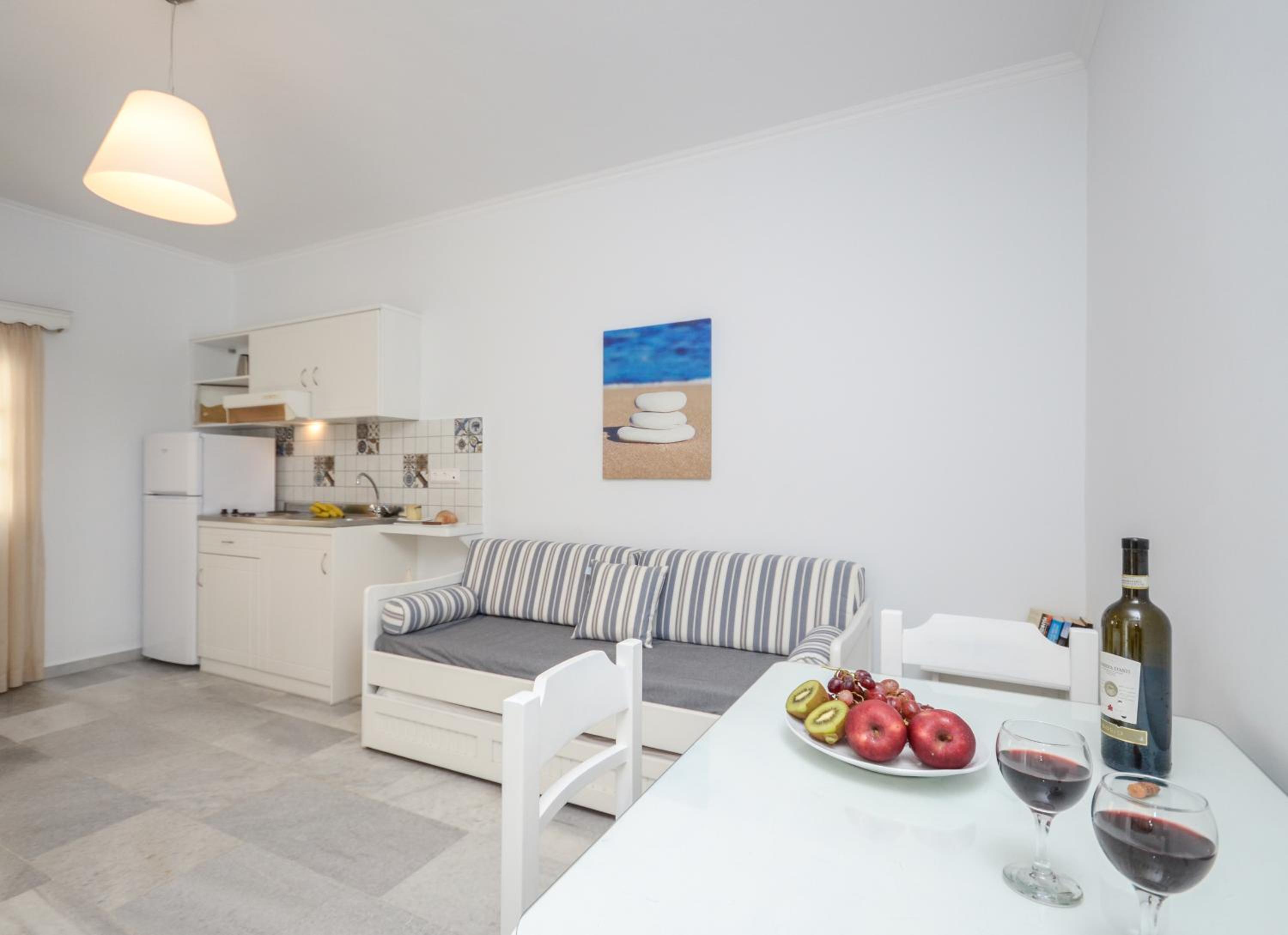 The 1 bedroom Apartment had a balcony and modern bathroom, comfortable double bed and kitchen/living room. Was well placed for supermarket, beach, tavernas, restaurants and bars. The Grounds were green and well kept with a lovely swimming pool which had lots of spare sunbeds etc. Maria and Christoff were very friendly and helpful - organising a hire car for us and helping with our return ferry. The breakfast was wonderful too.