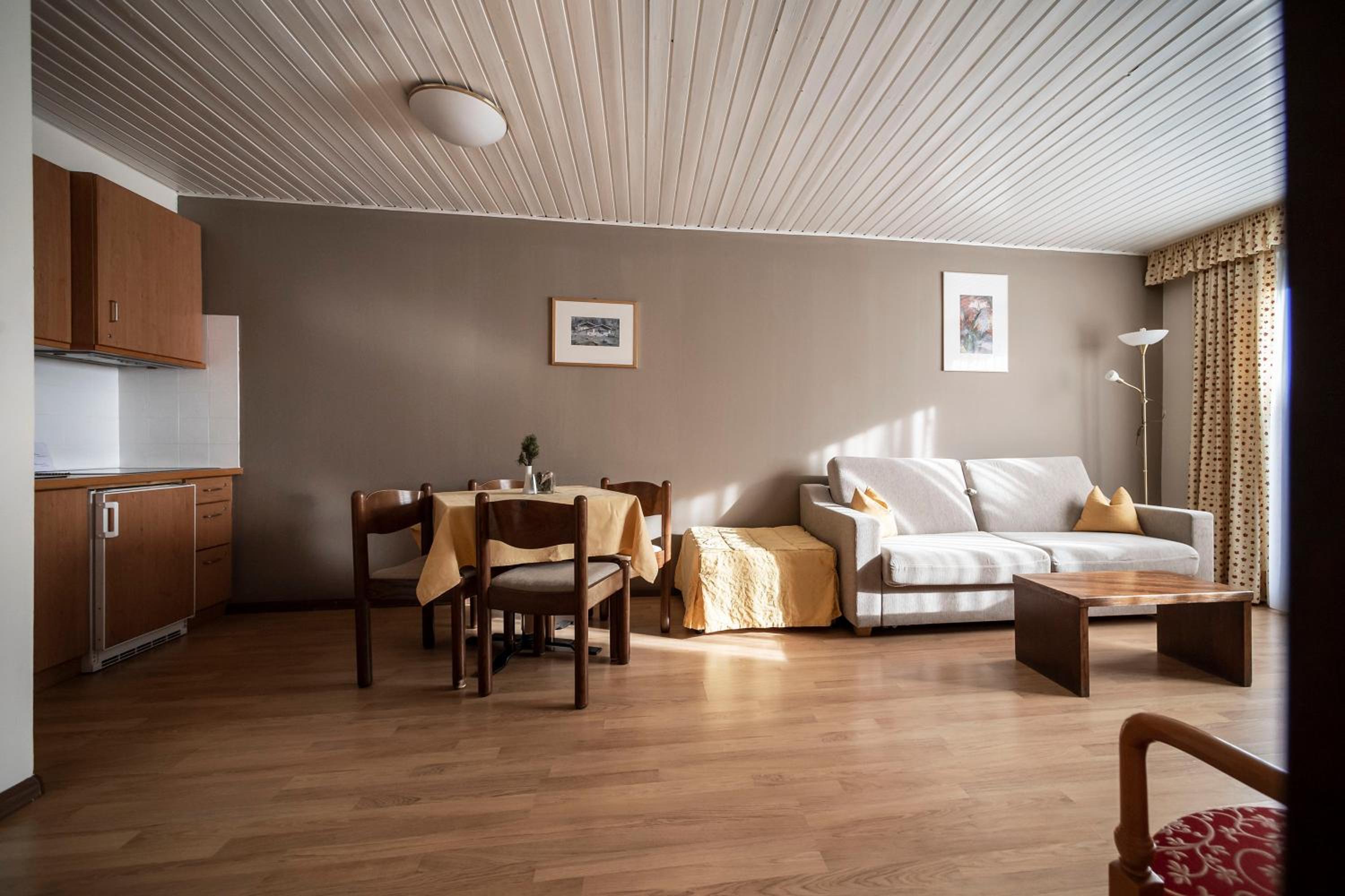 Experience comfort and charm in our self-catering apartments featuring traditional mountain decor, wooden furnishings, and modern amenities spread across multiple levels for added privacy.