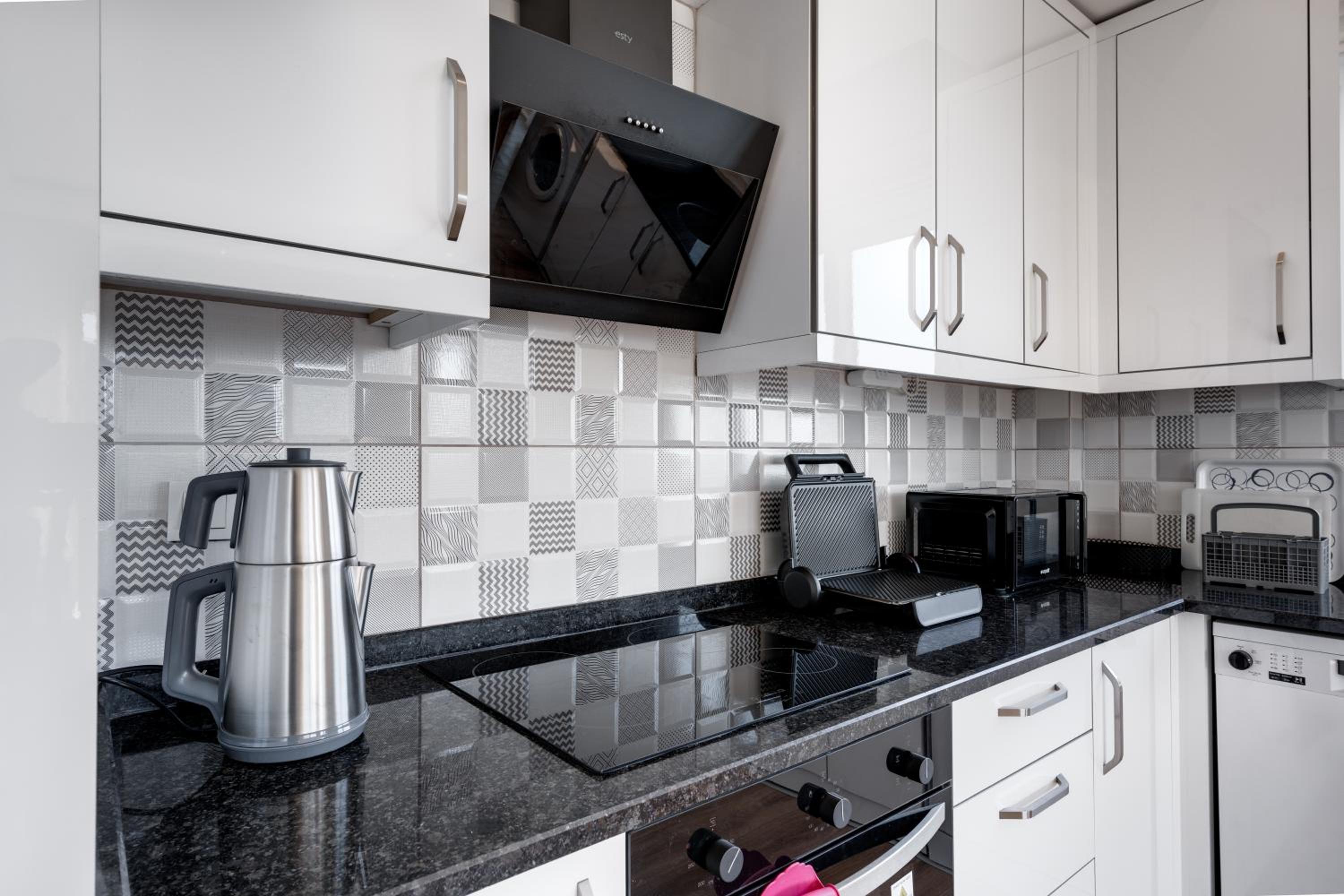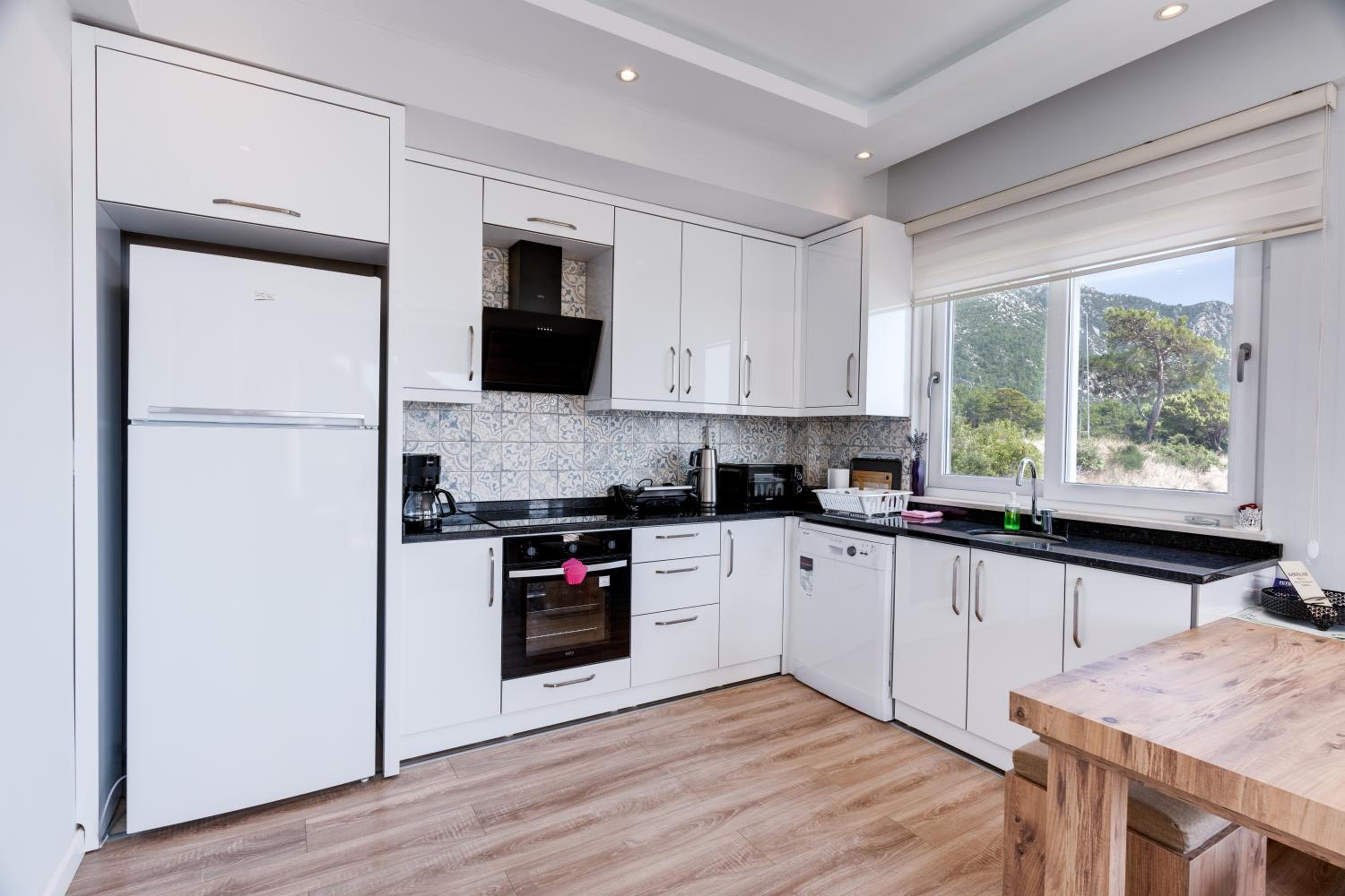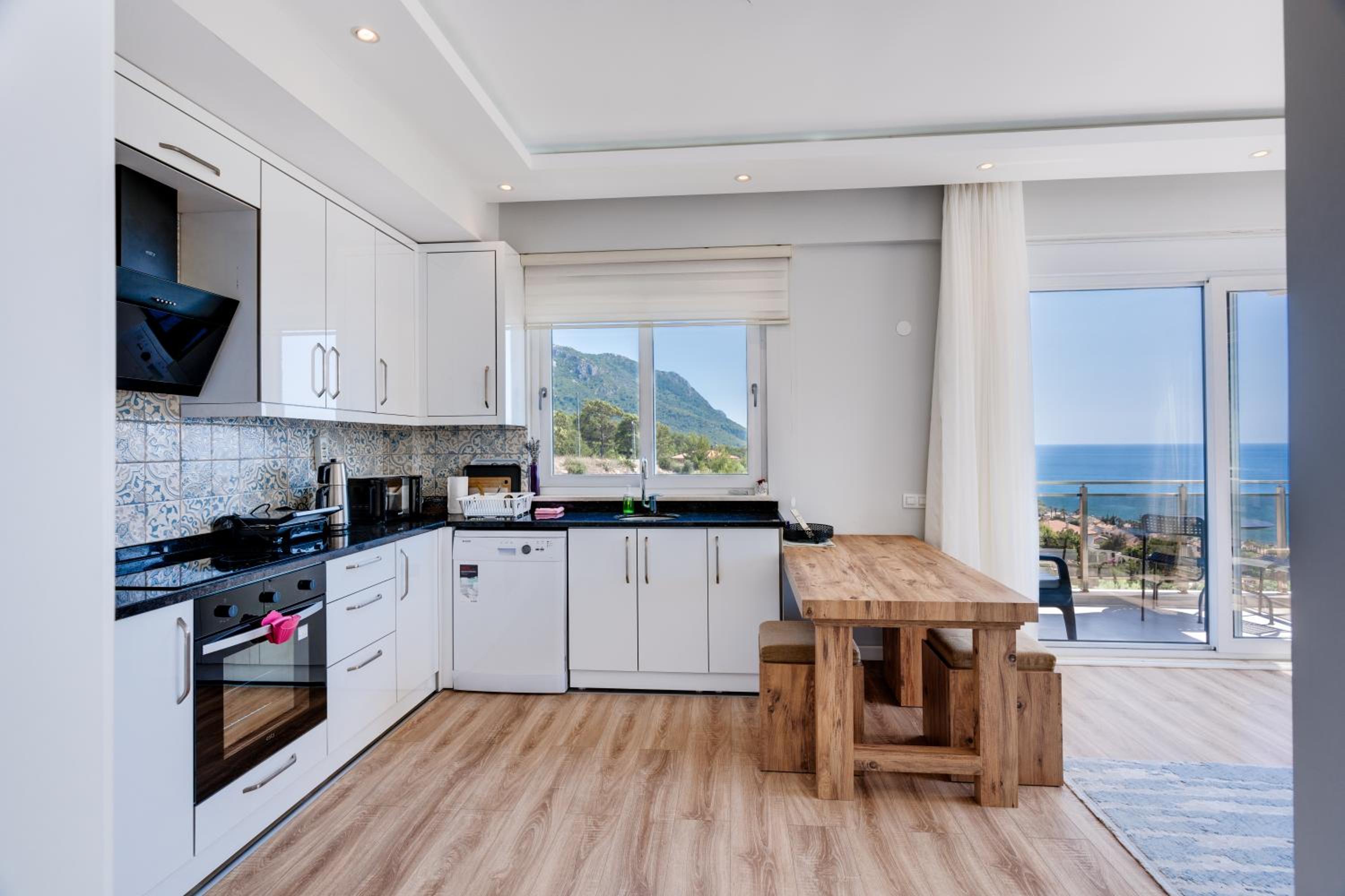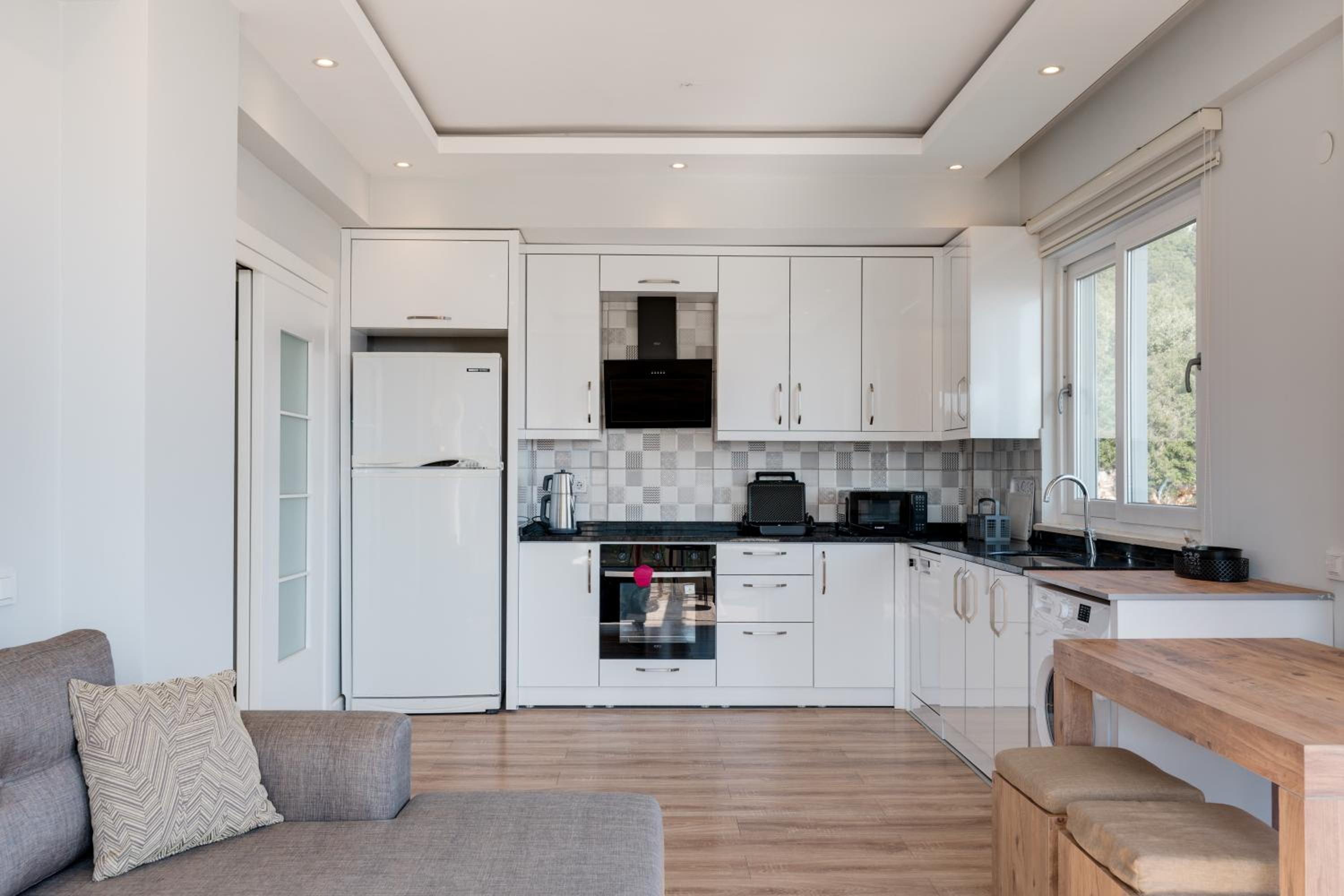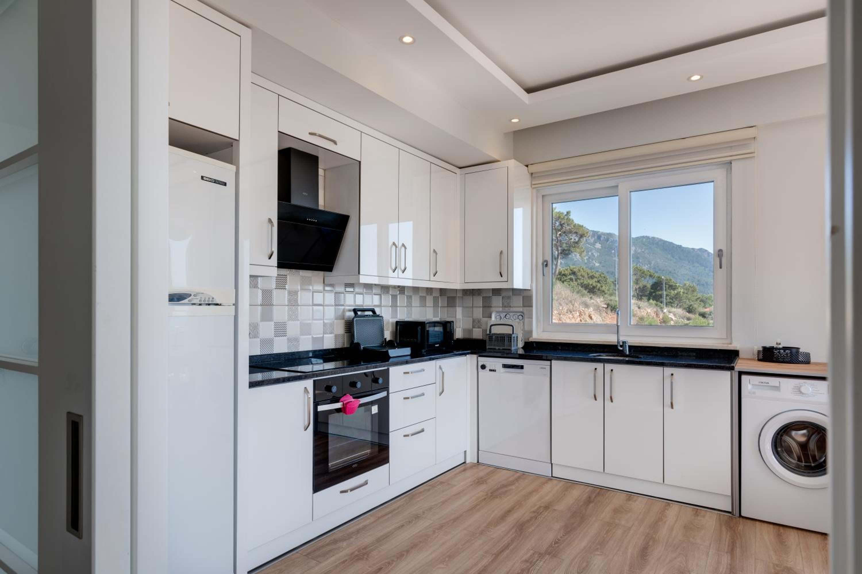 + The kitchen is well equipped and has everything you need: large fridge, washing machine (with detergent), dishwasher (with detergent), stove, oven, microwave, kettle, coffee pot, crockery, tableware, seasonings and etc.