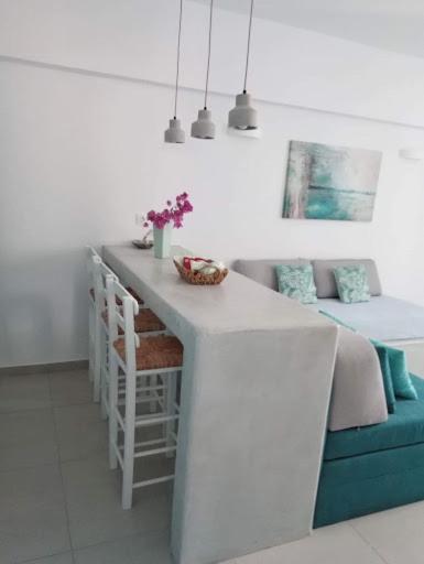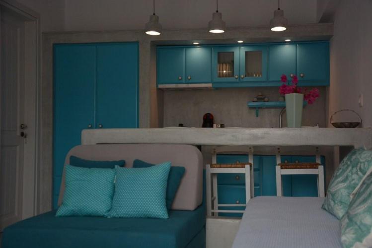 The Studio was confortable and beautifully decorated in a traditional greek style. There was always a nice breeze going throug that kept the studio cool and at night we didn't need th a/c. The Studio was cleaned every day amd they put new little bottles of soap, shower gel and lotion in the bathroom, and in the kitchen some honey, butter, cookies, marmelade and a bottle of wine.