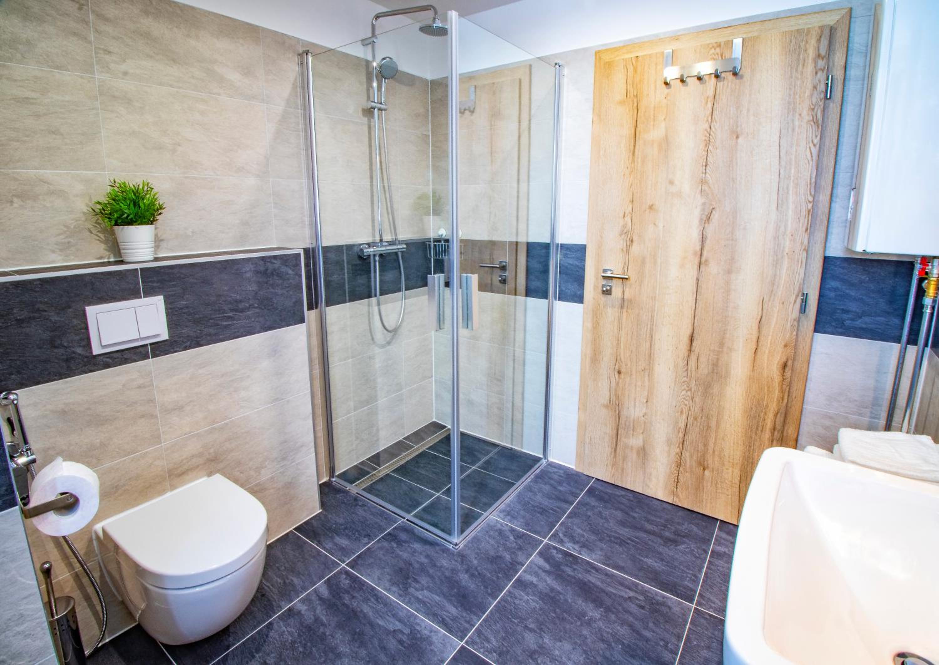 Das Bad ist sehr beengt. Der gestellte Parkplatz war letztlich doch ein Außenstellplatz. Der Abstellraum für Ski ist praktisch, aber leider nur über die Garage erreichbar. Wenn man aber nur einen Außenstellplatz bekommt, öffnet sich das Tor nicht und man muss jedesmal über den Hauseingang und das Treppenhaus Umweg laufen. Da hat man es deutlich leichter, wenn man direkten Zugang zu Tiefgarage hätte.