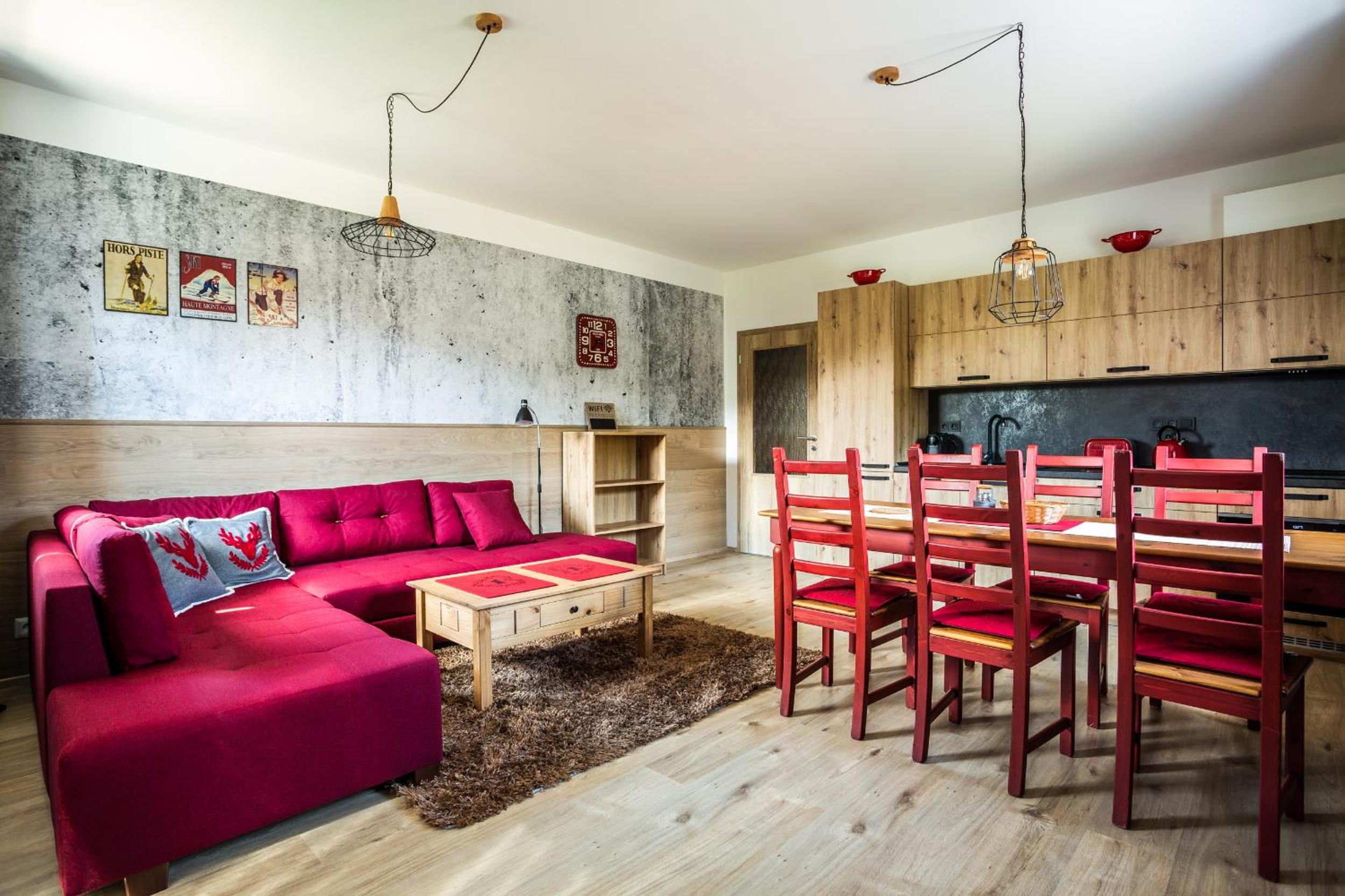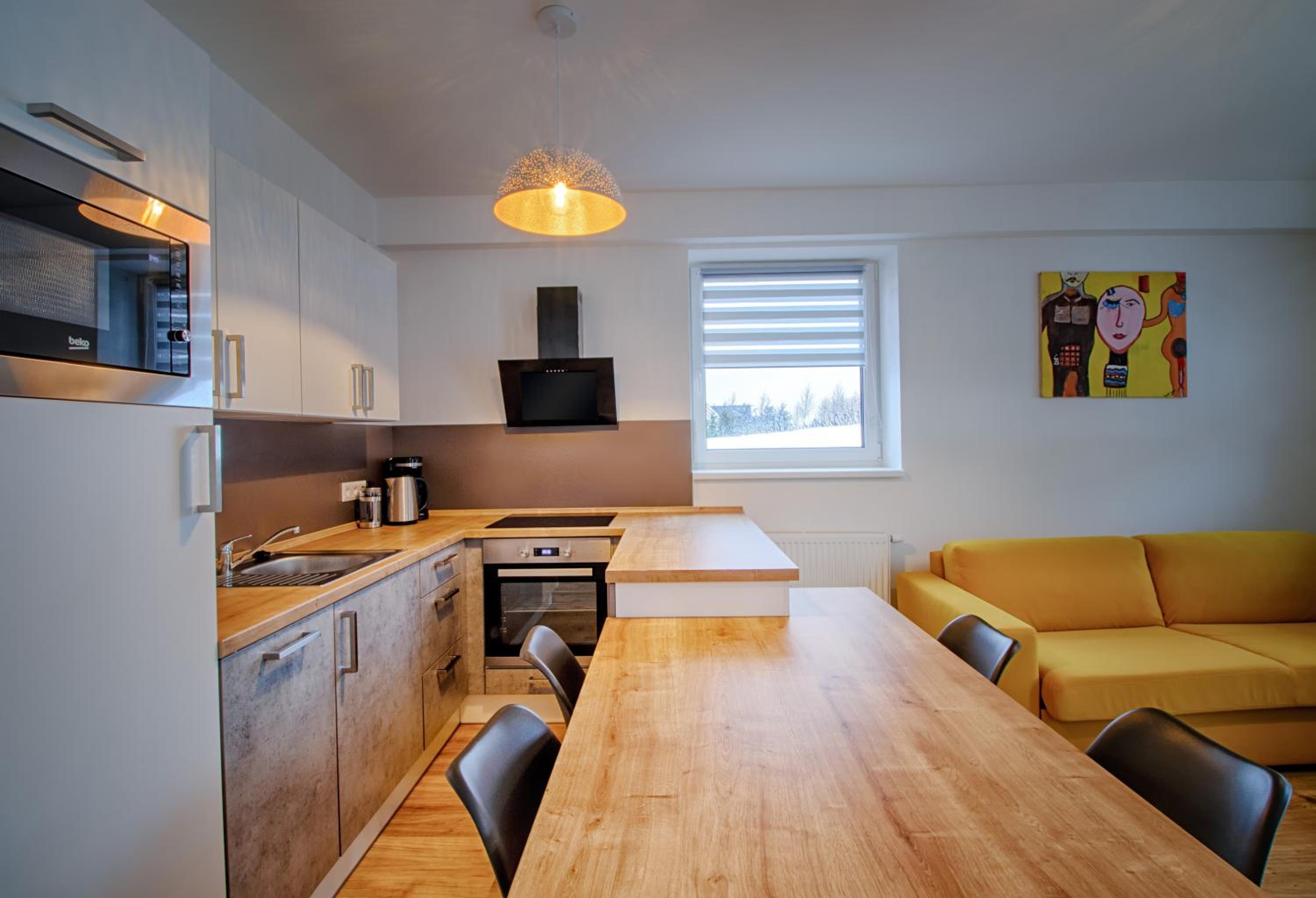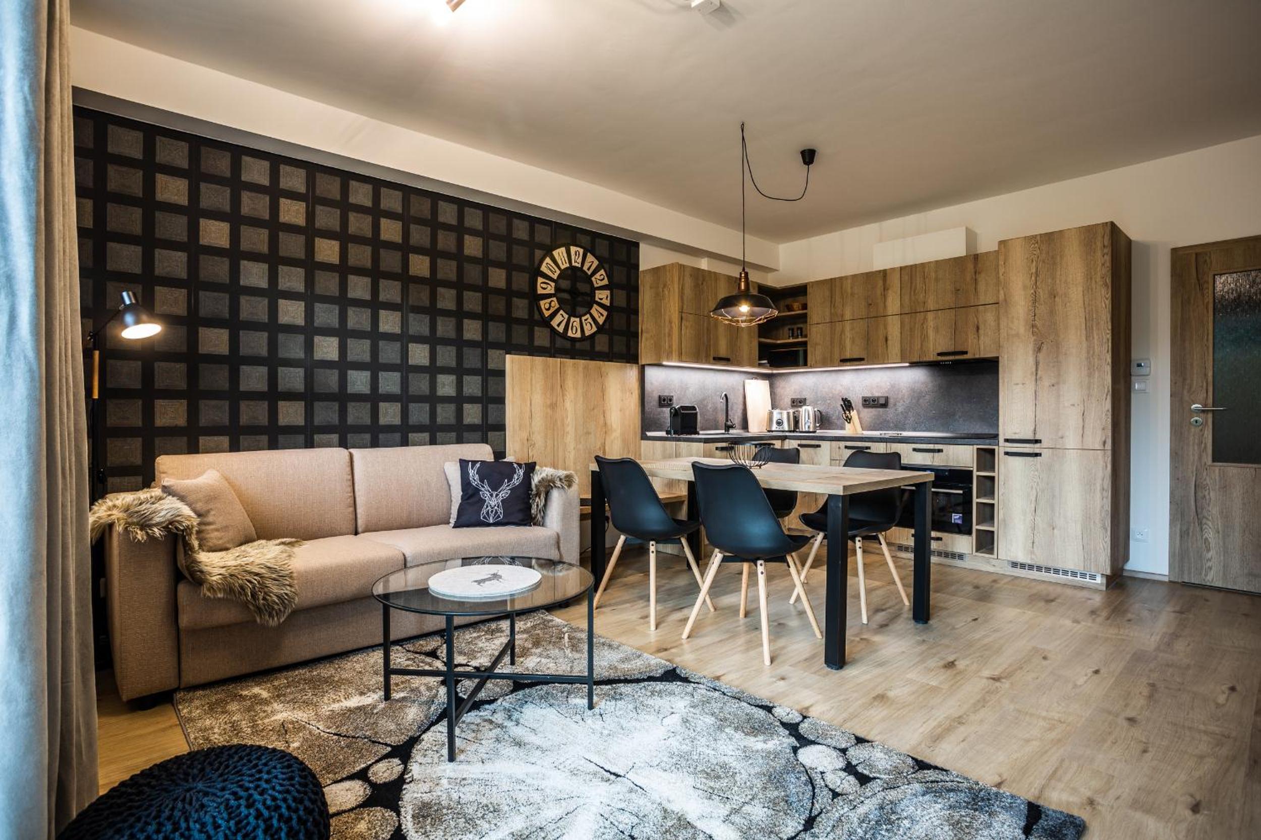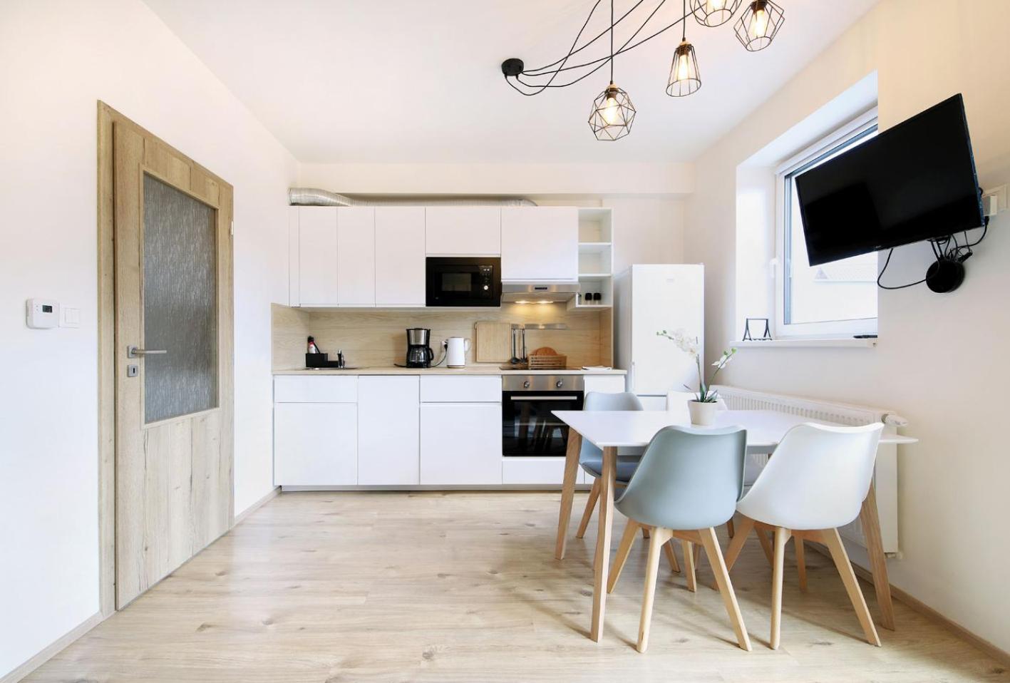 Indulge in the comfort of a fully equipped kitchen and a spacious seating area with a sofa at Aparthotel Klínovec Views. Prepare your favorite meals with ease using the microwave, fridge, and stovetop provided, and enjoy dining in the inviting dining area.