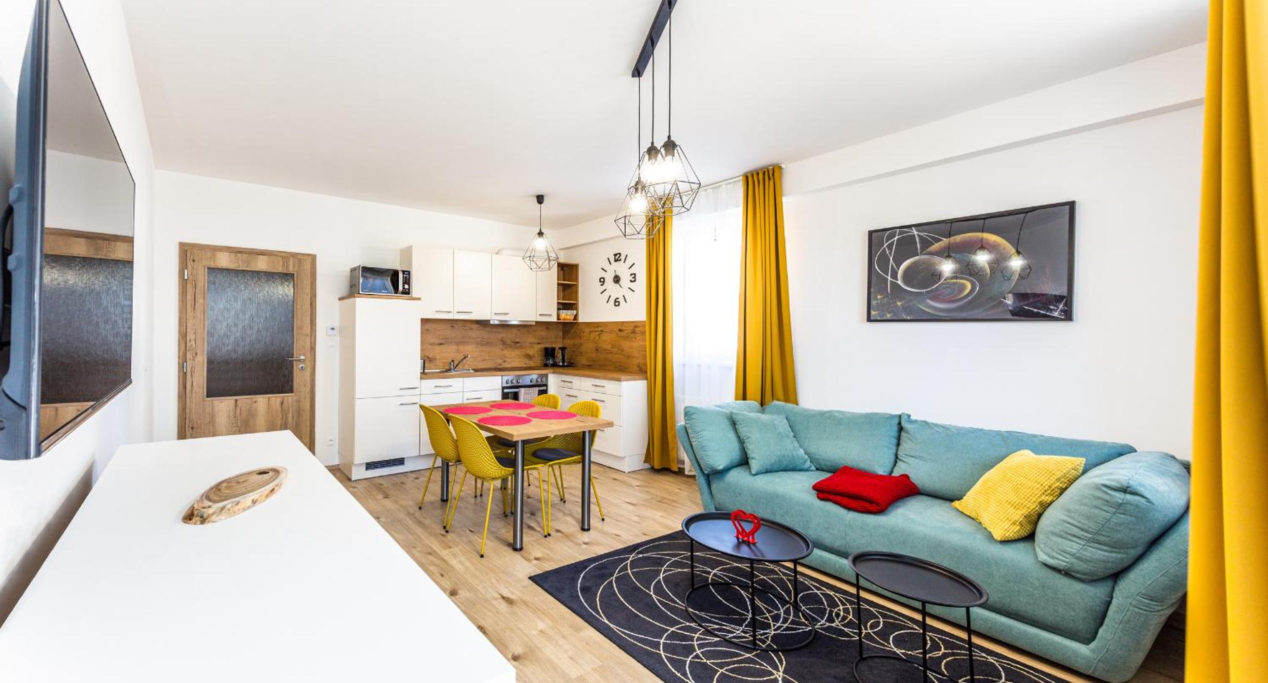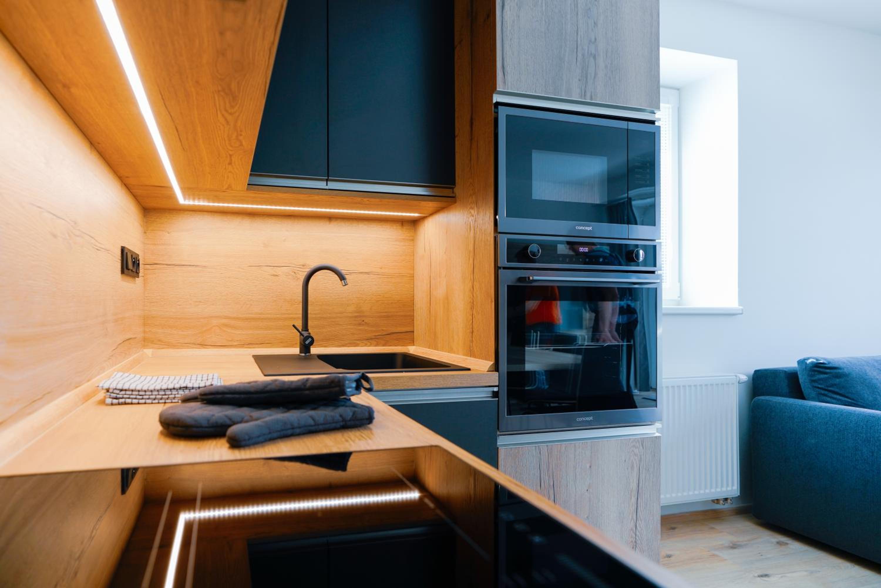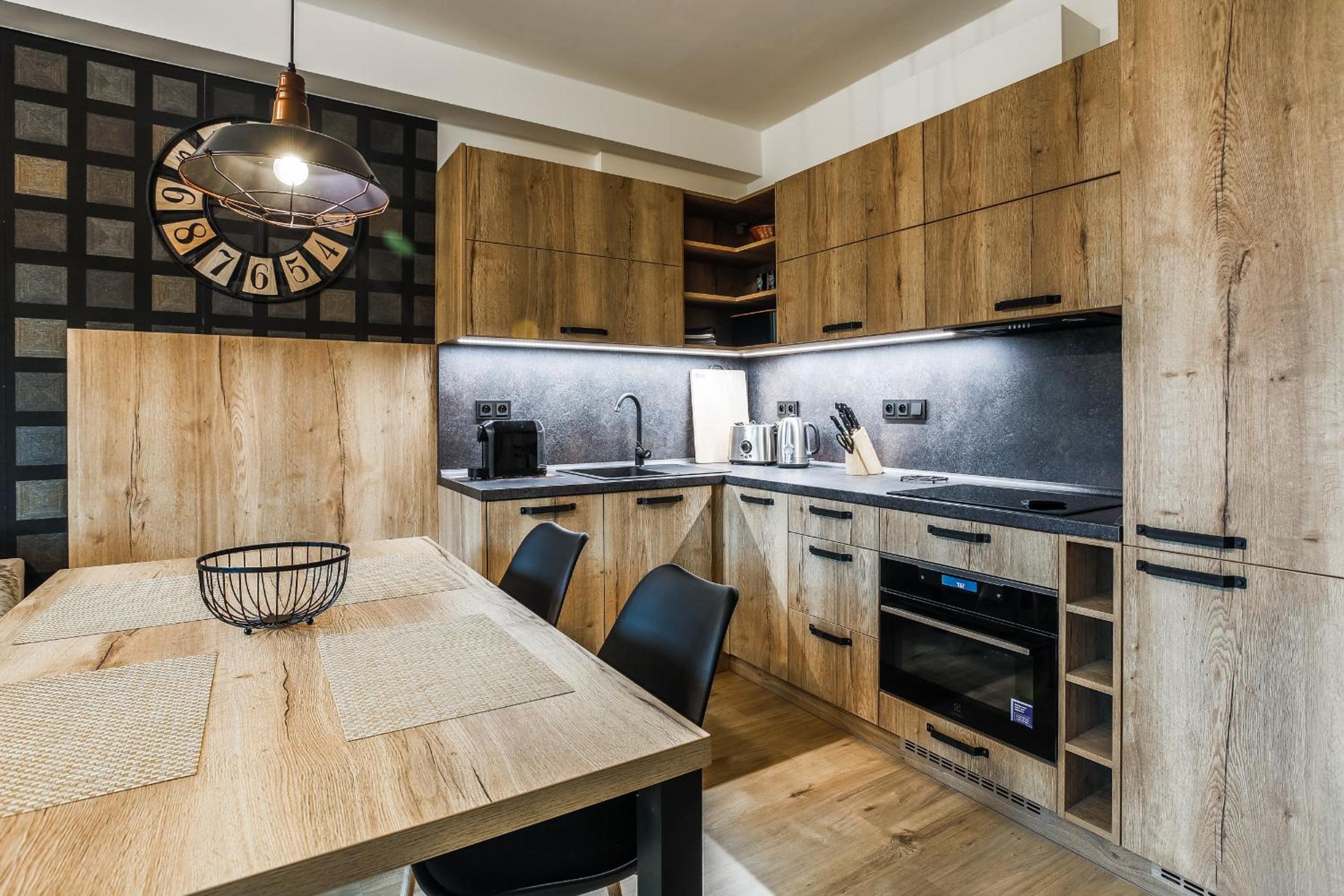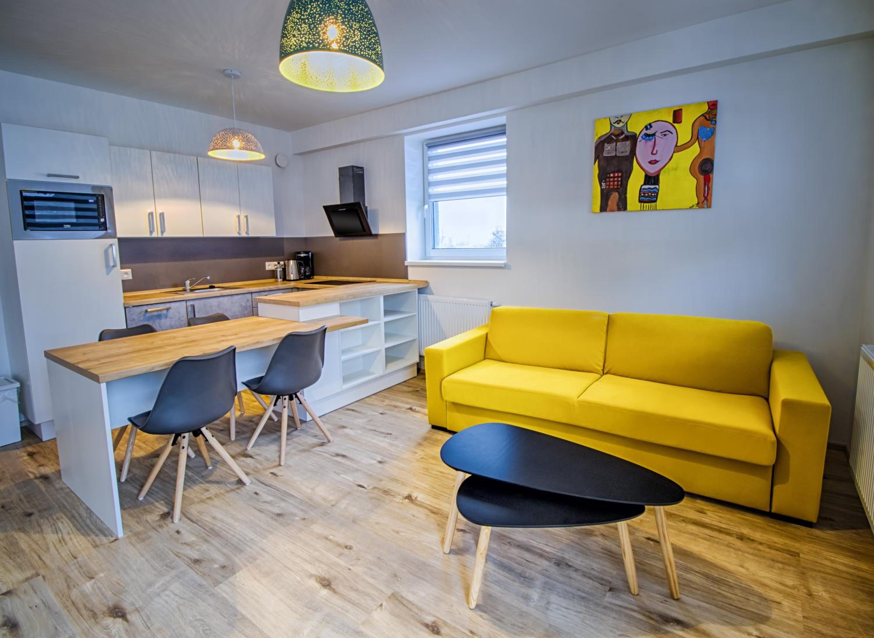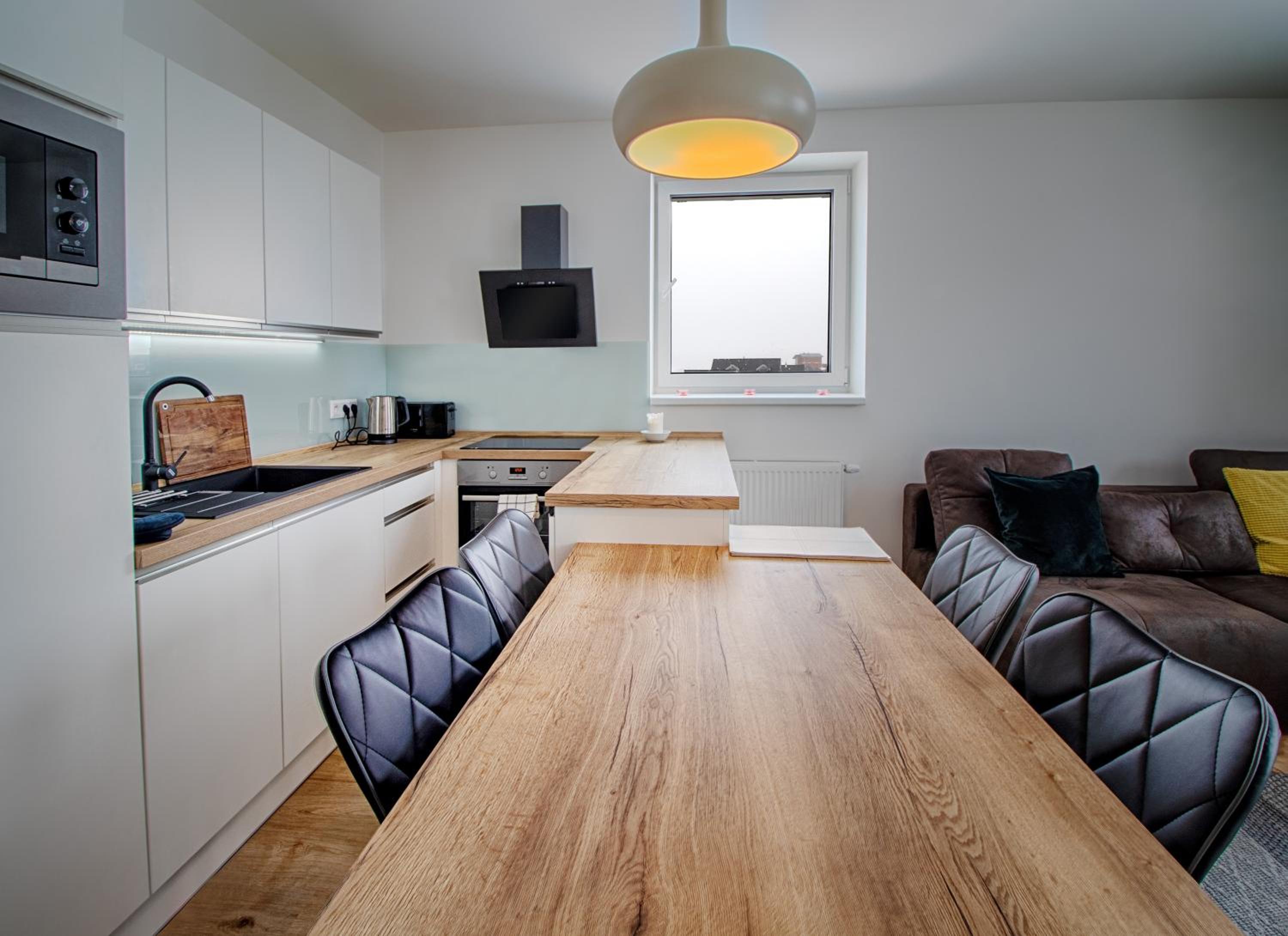 Indulge in the comfort of a fully equipped kitchen and a spacious seating area with a sofa at Aparthotel Klínovec Views. Prepare your favorite meals with ease using the microwave, fridge, and stovetop provided, and enjoy dining in the inviting dining area.