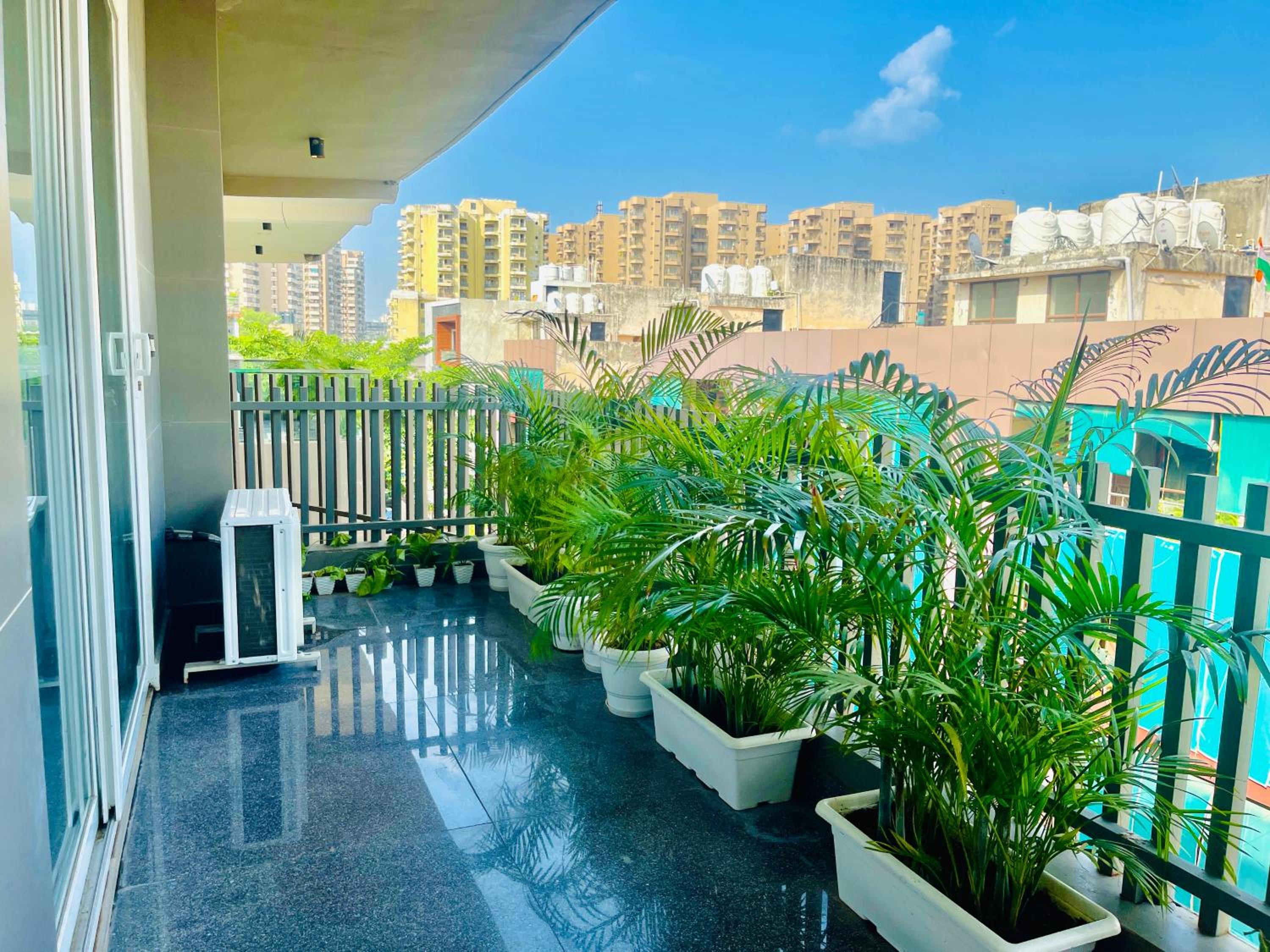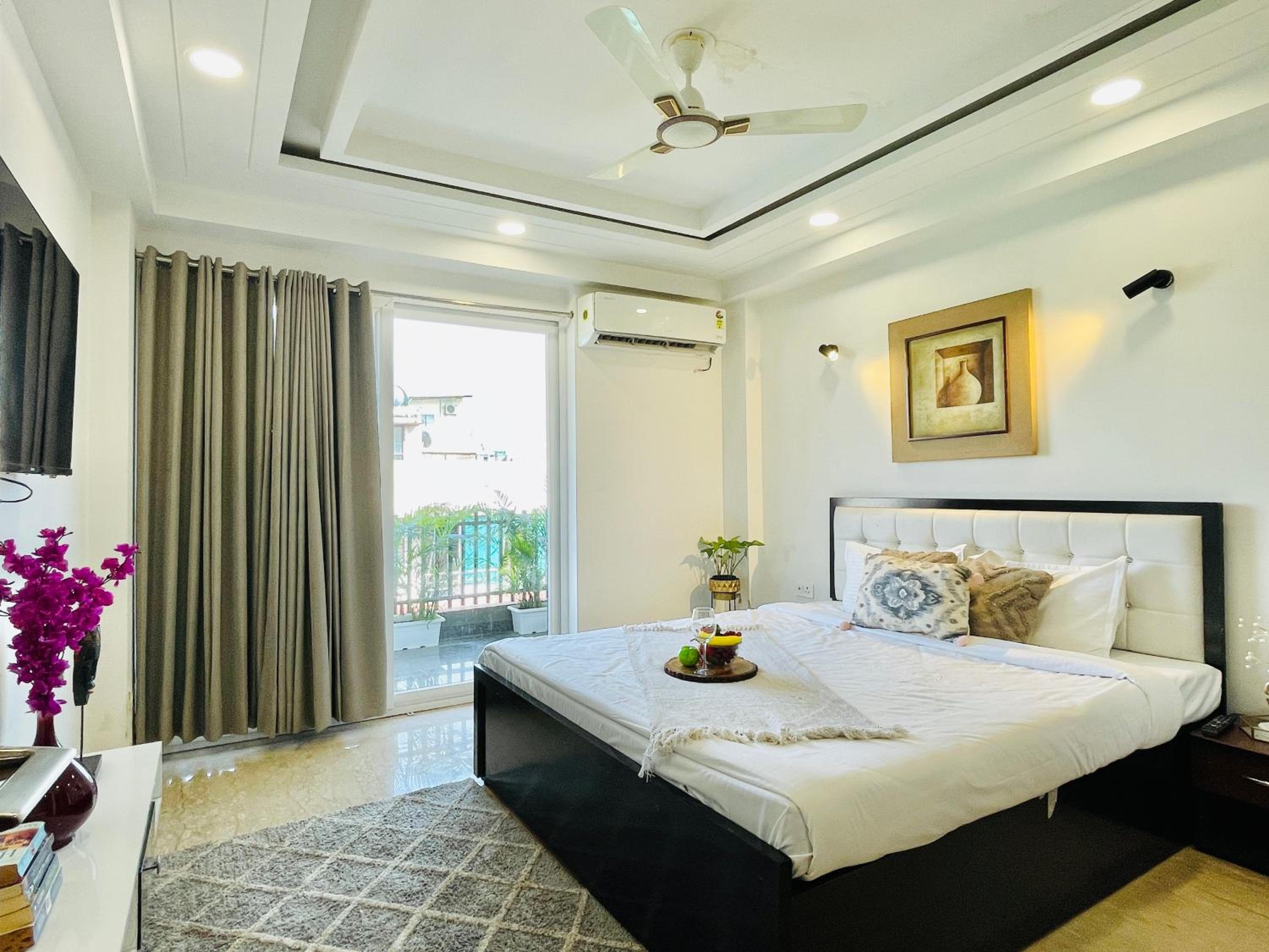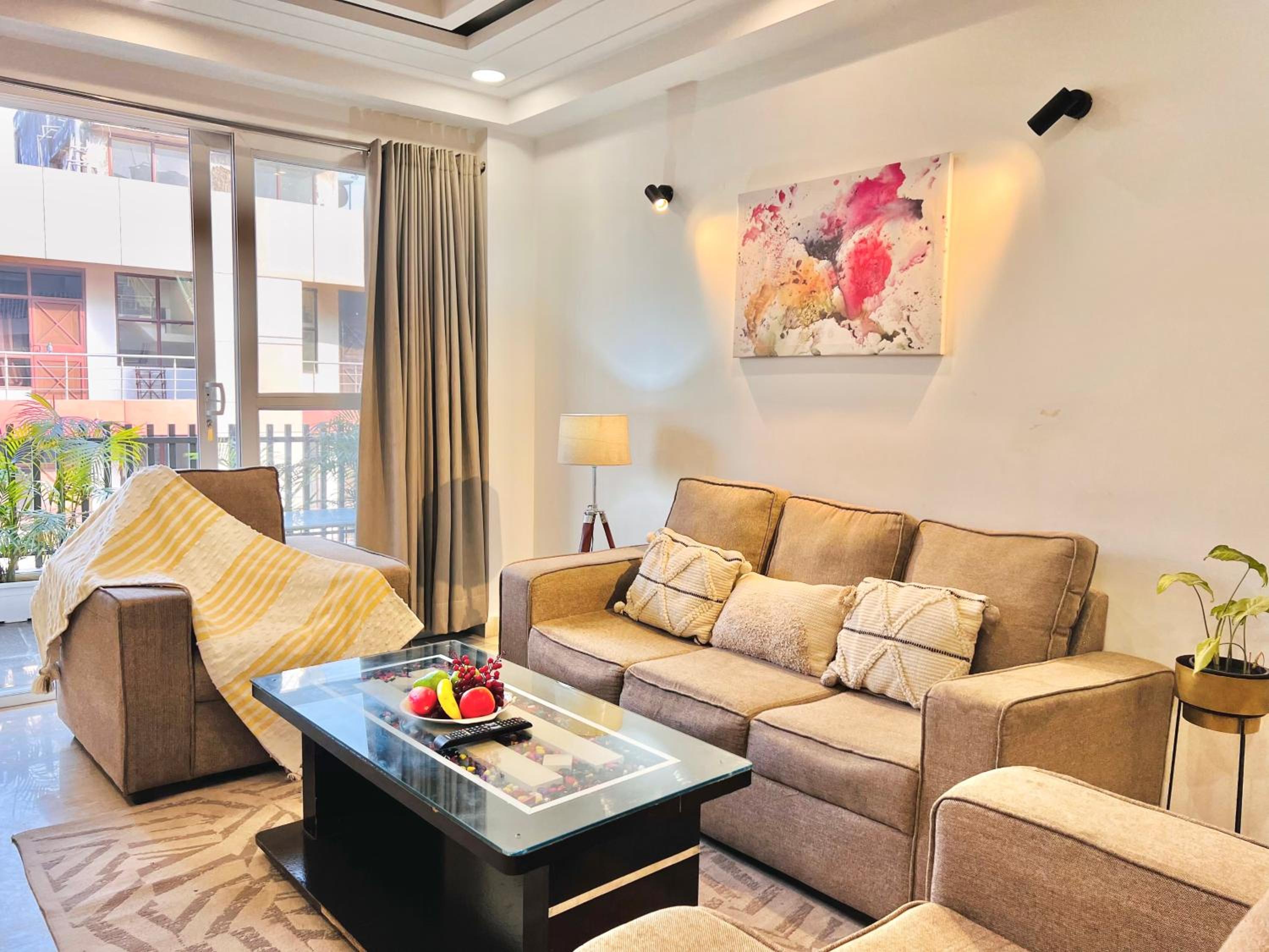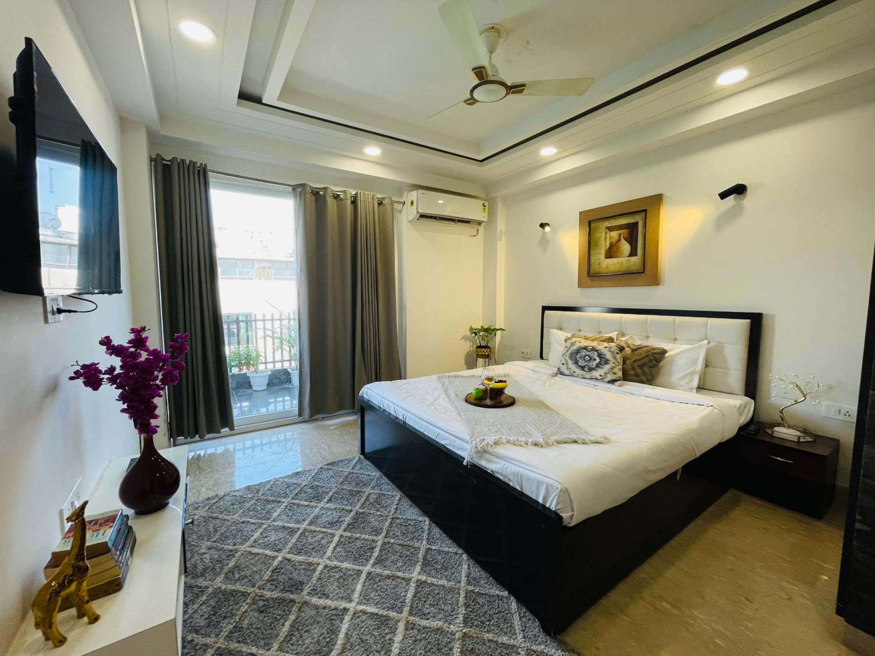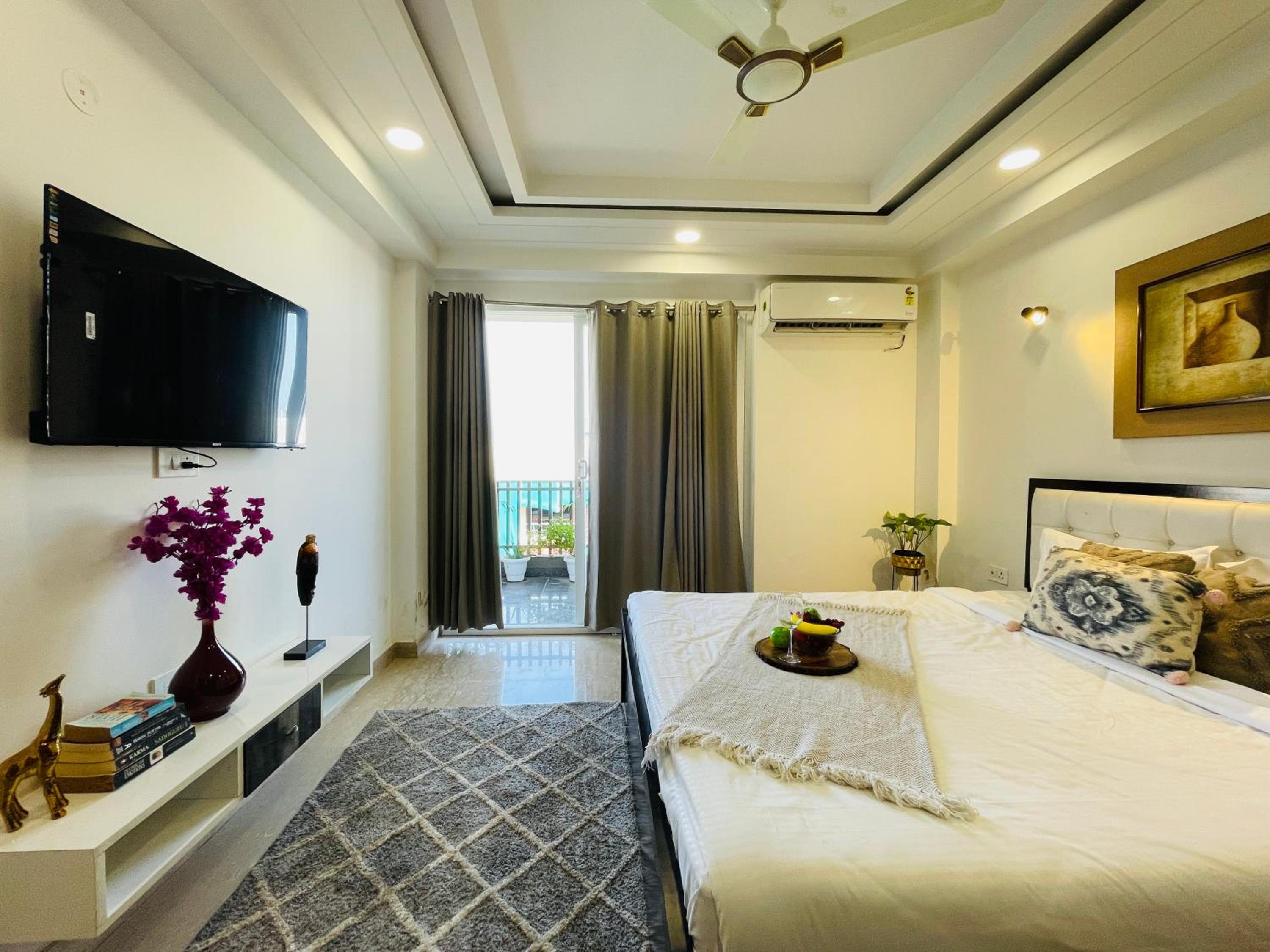 Experience comfort and style at Bedchambers Serviced Apartments in Gurgaon. The spacious 3-bedroom apartment offers a fully equipped kitchen, flat-screen TV, and a private balcony with garden views.