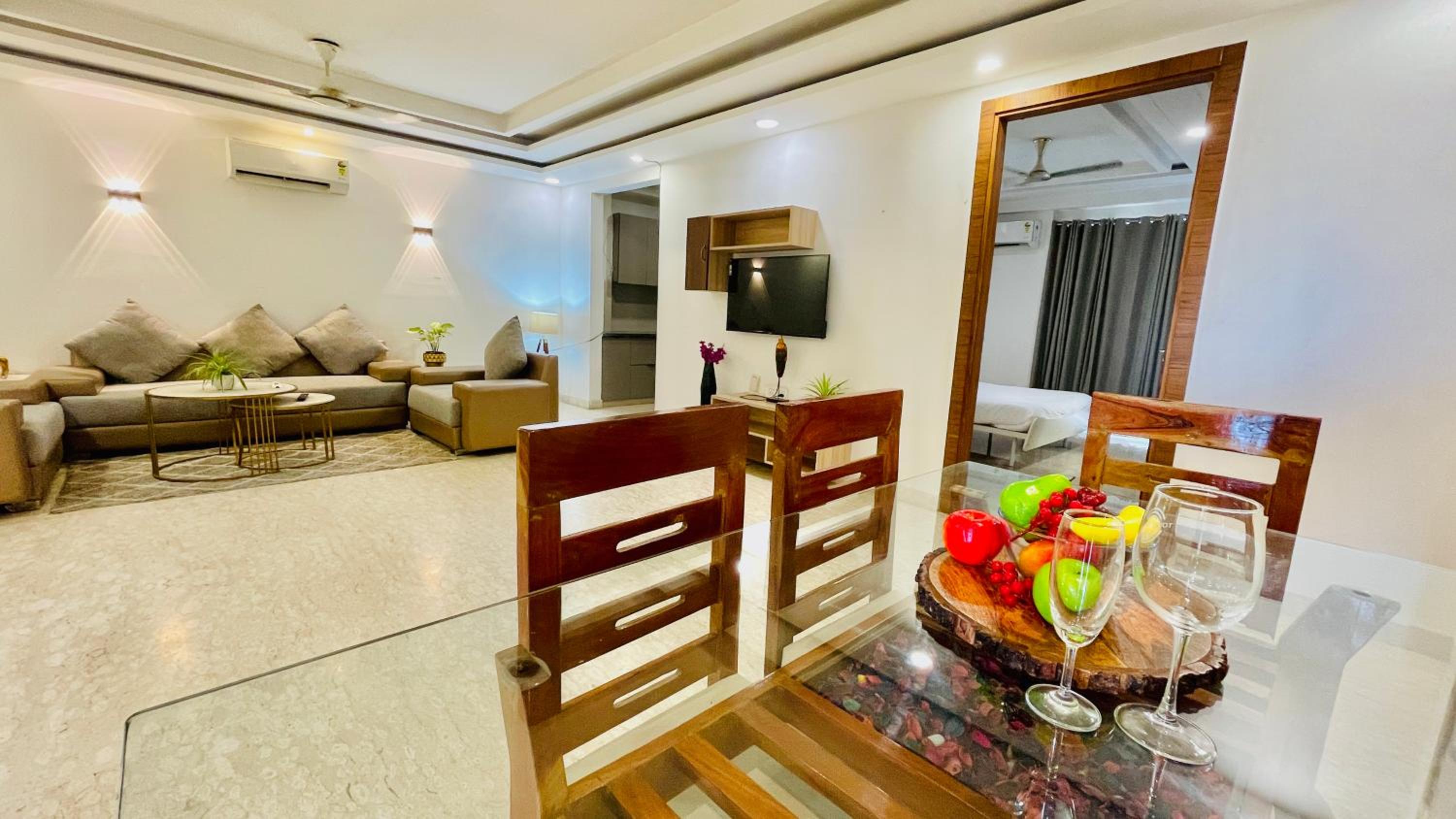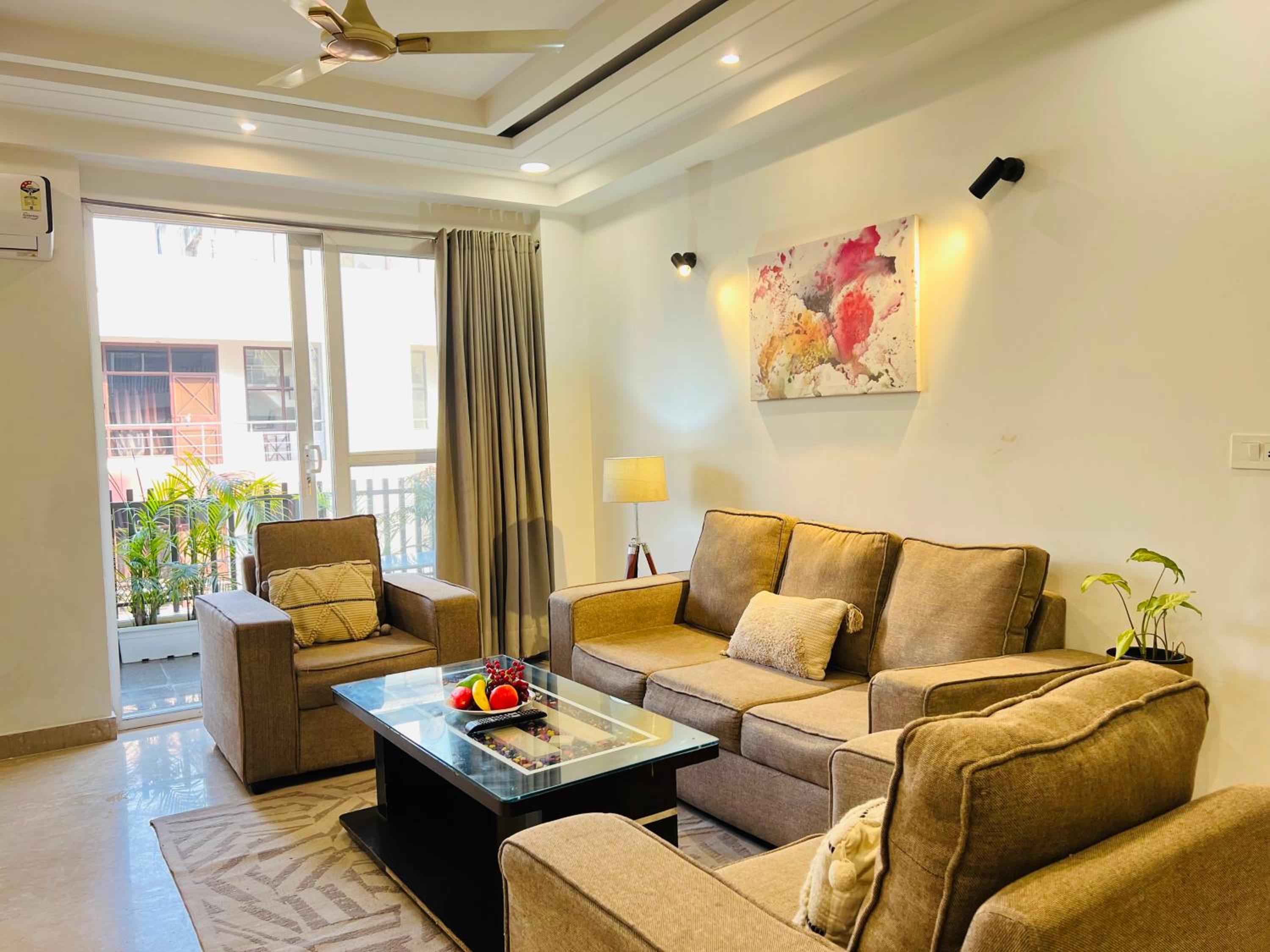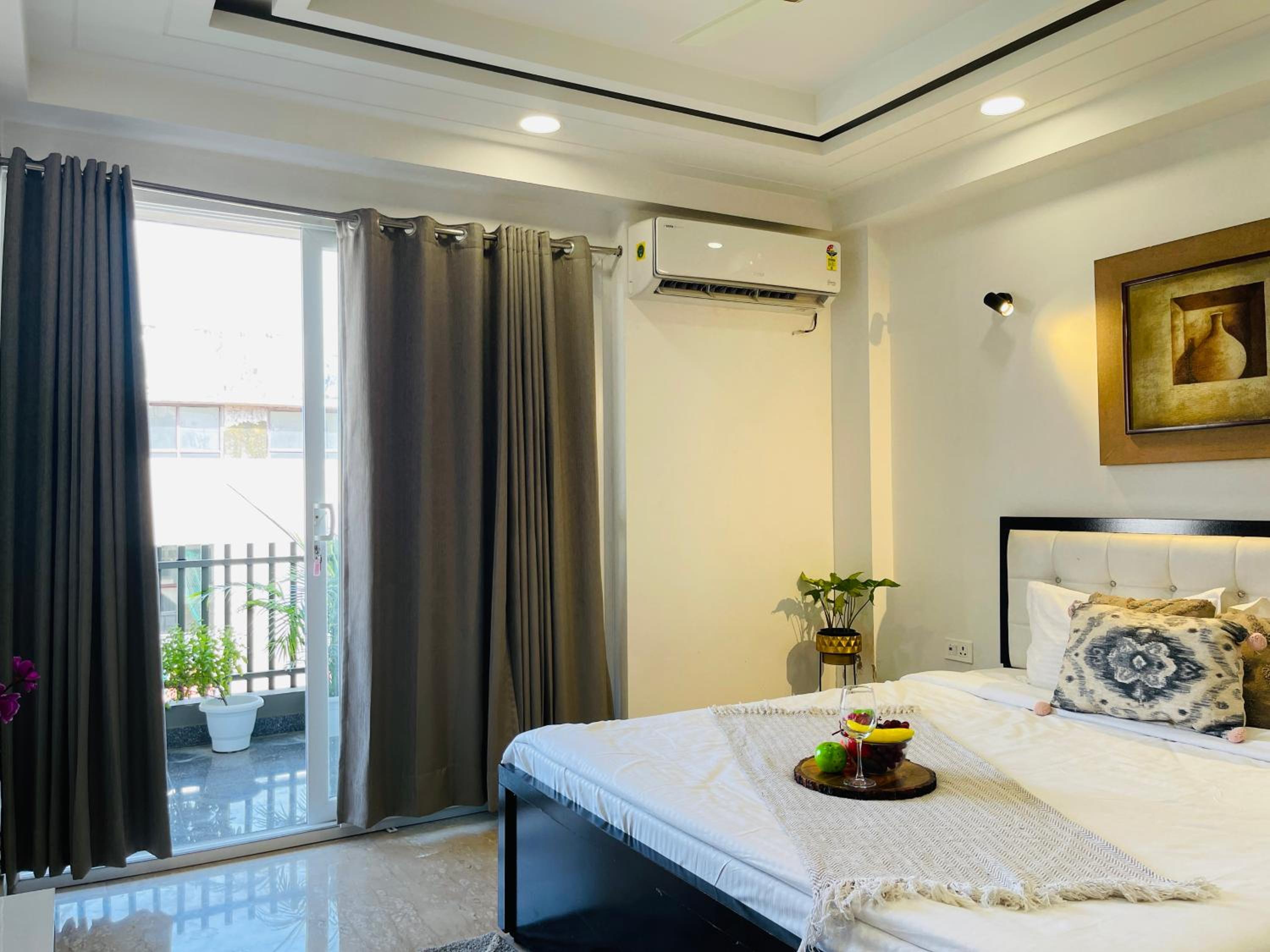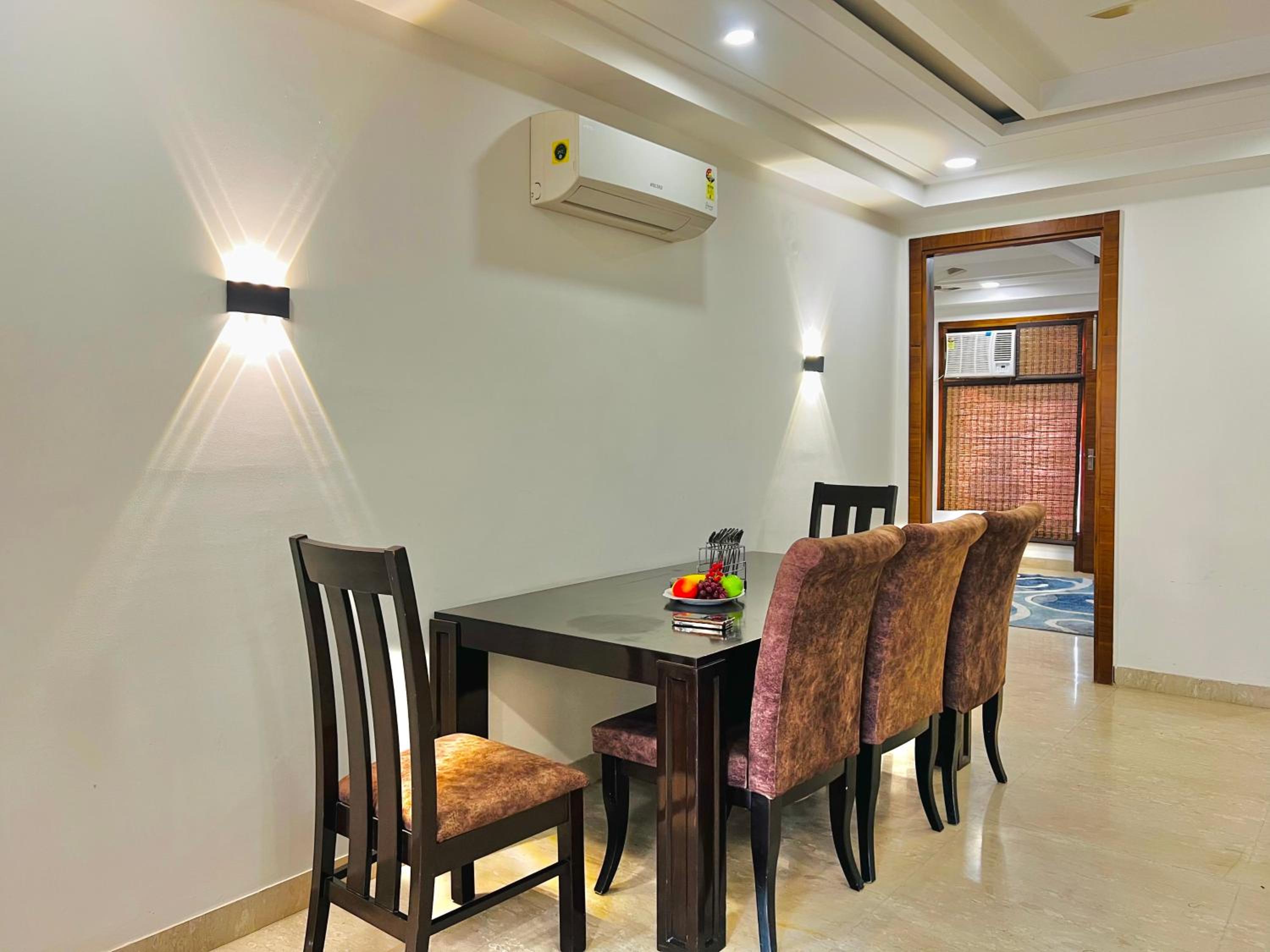 Experience comfort and style at Bedchambers Serviced Apartments in Gurgaon. The spacious 3-bedroom apartment offers a fully equipped kitchen, flat-screen TV, and a private balcony with garden views.