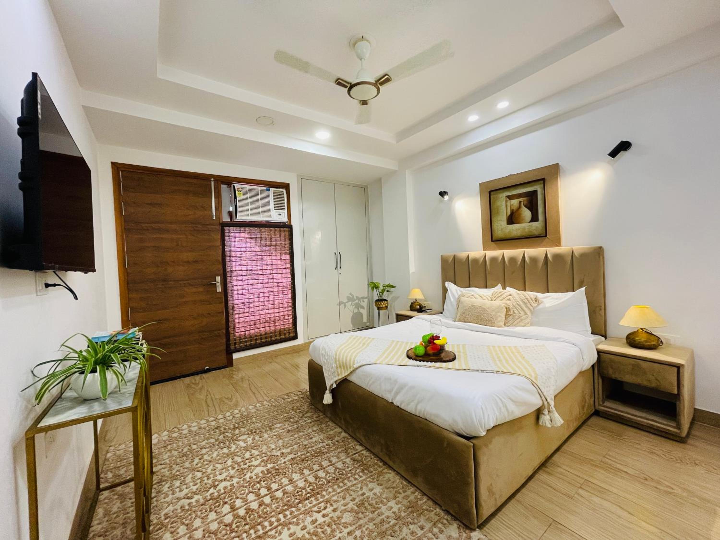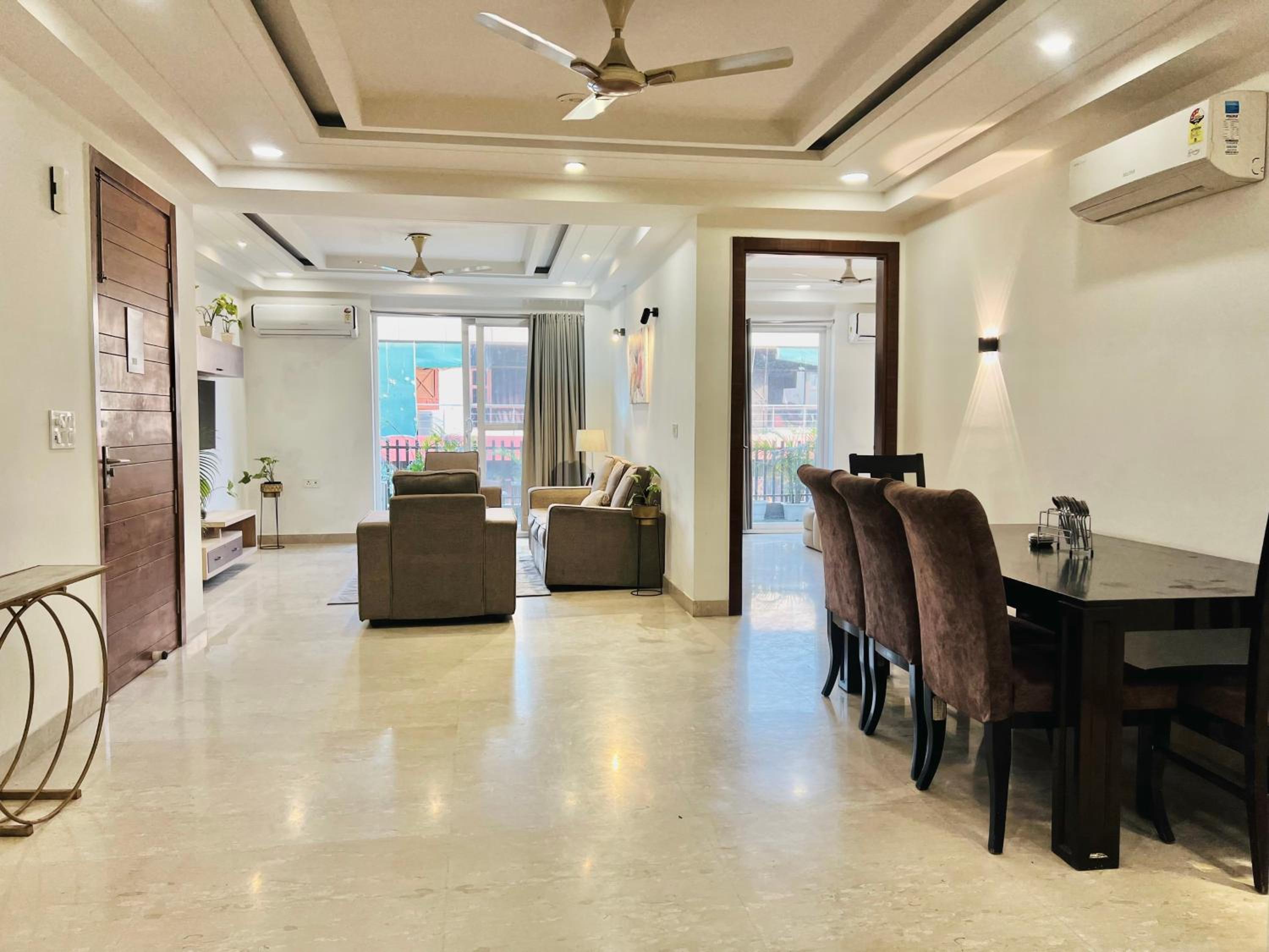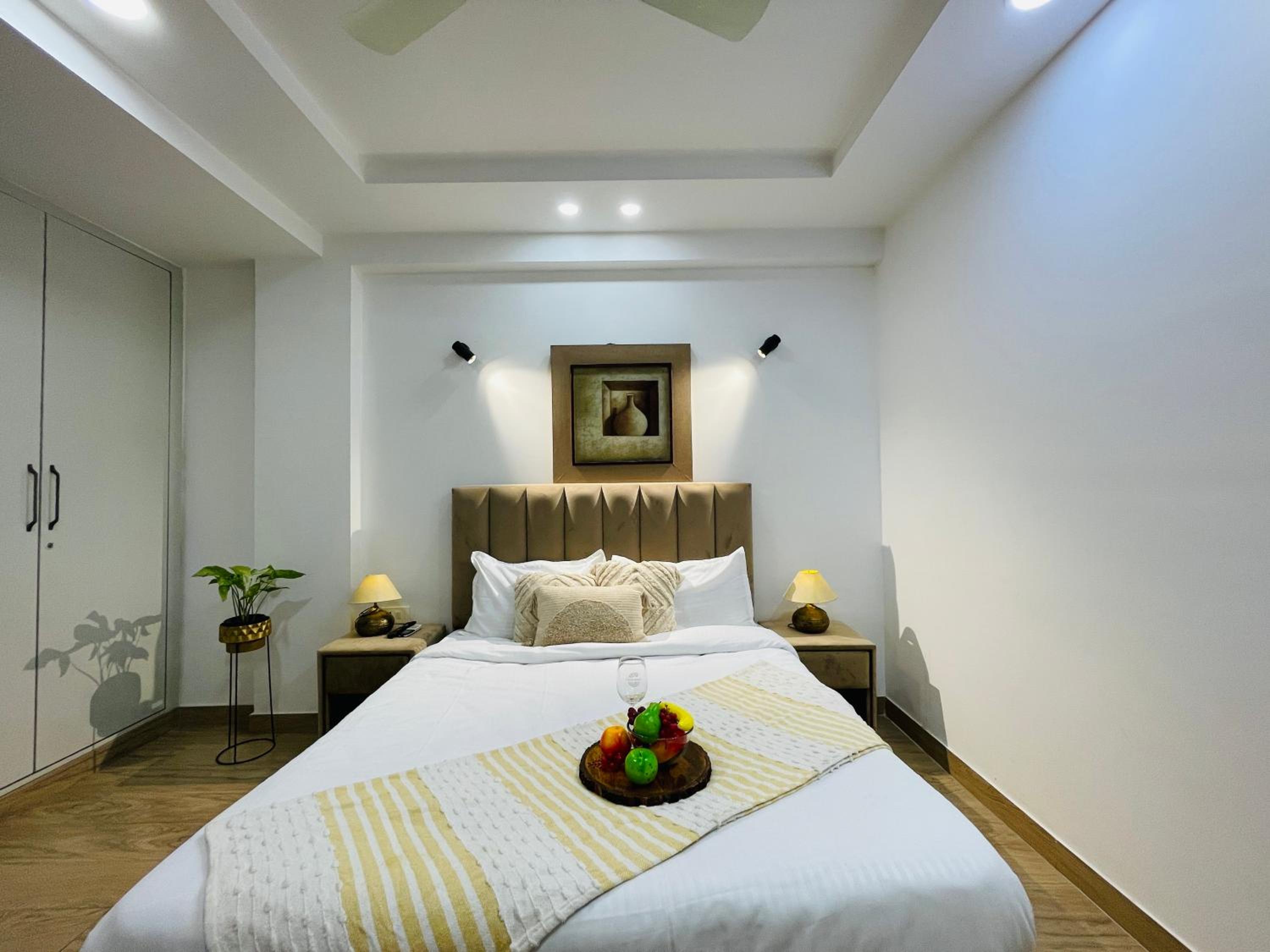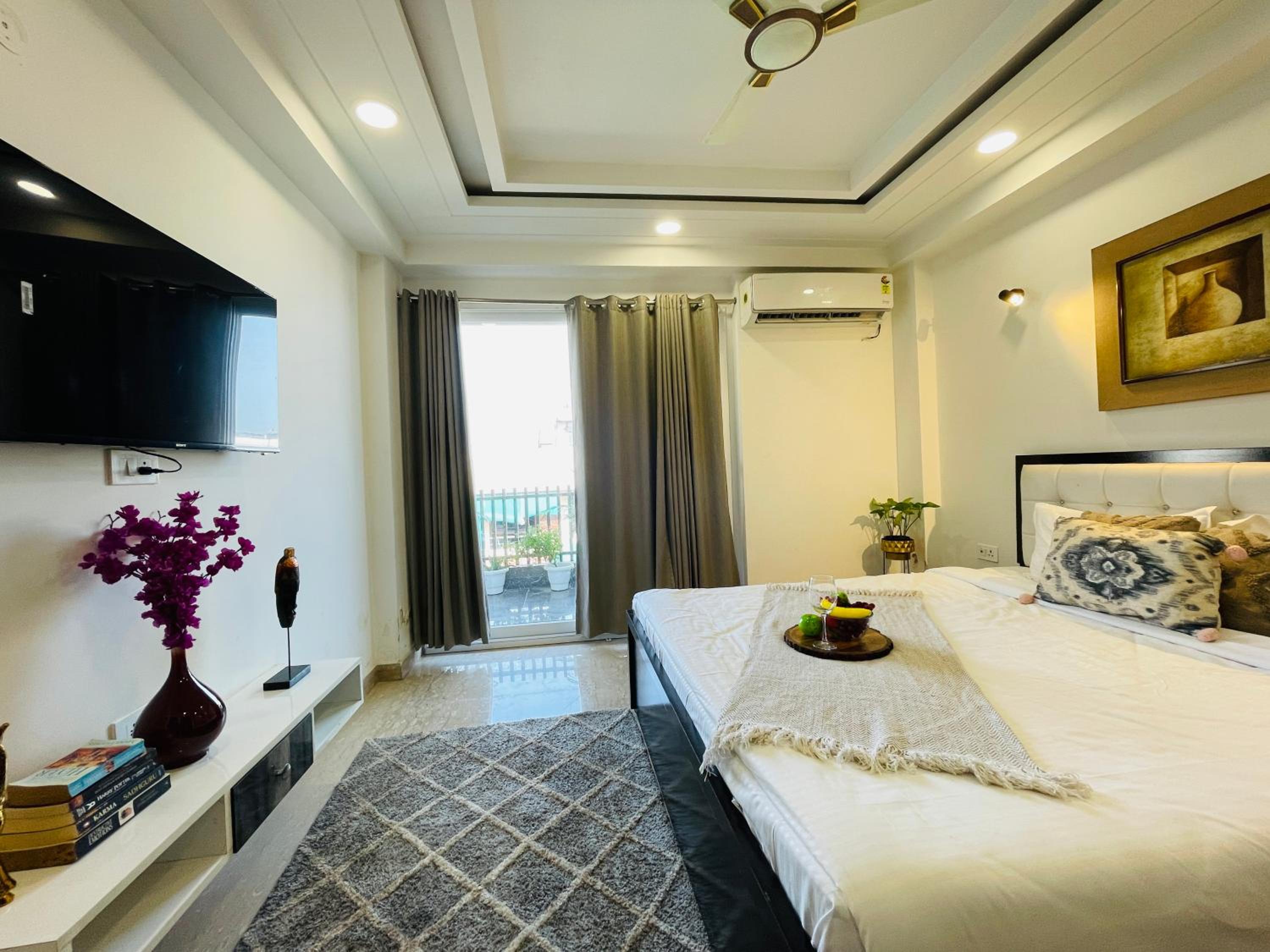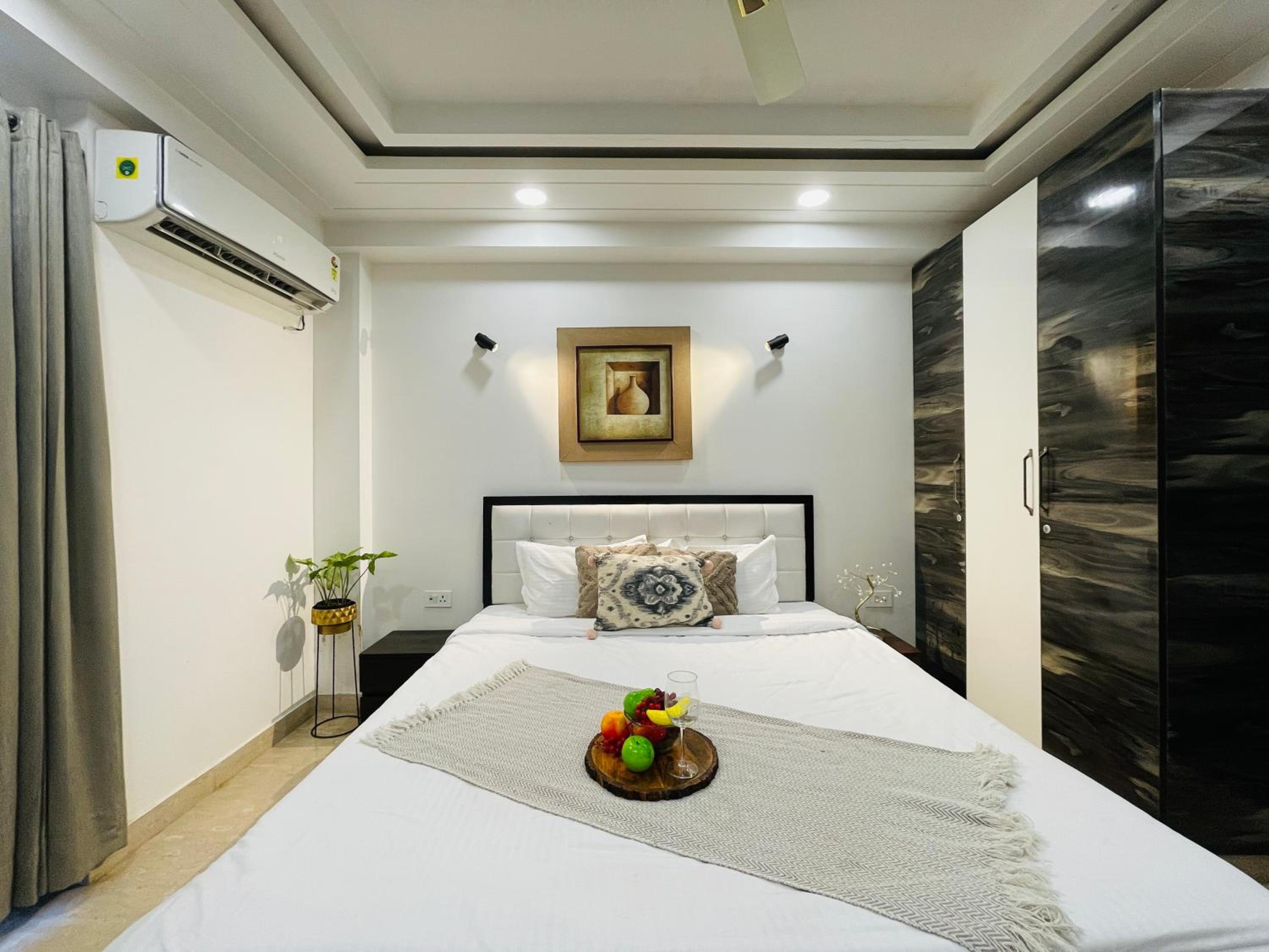 Experience comfort and style at Bedchambers Serviced Apartments in Gurgaon. The spacious 3-bedroom apartment offers a fully equipped kitchen, flat-screen TV, and a private balcony with garden views.