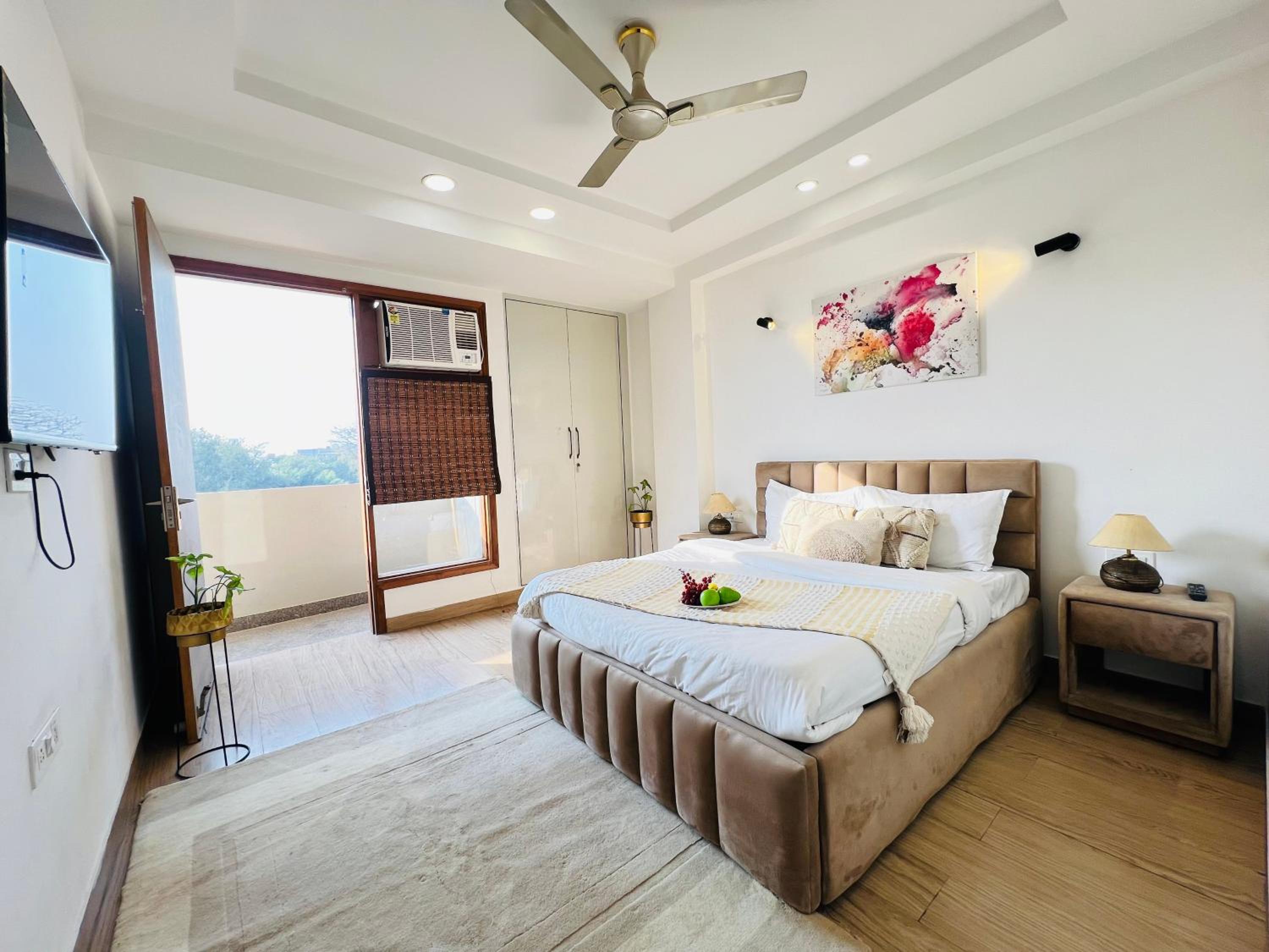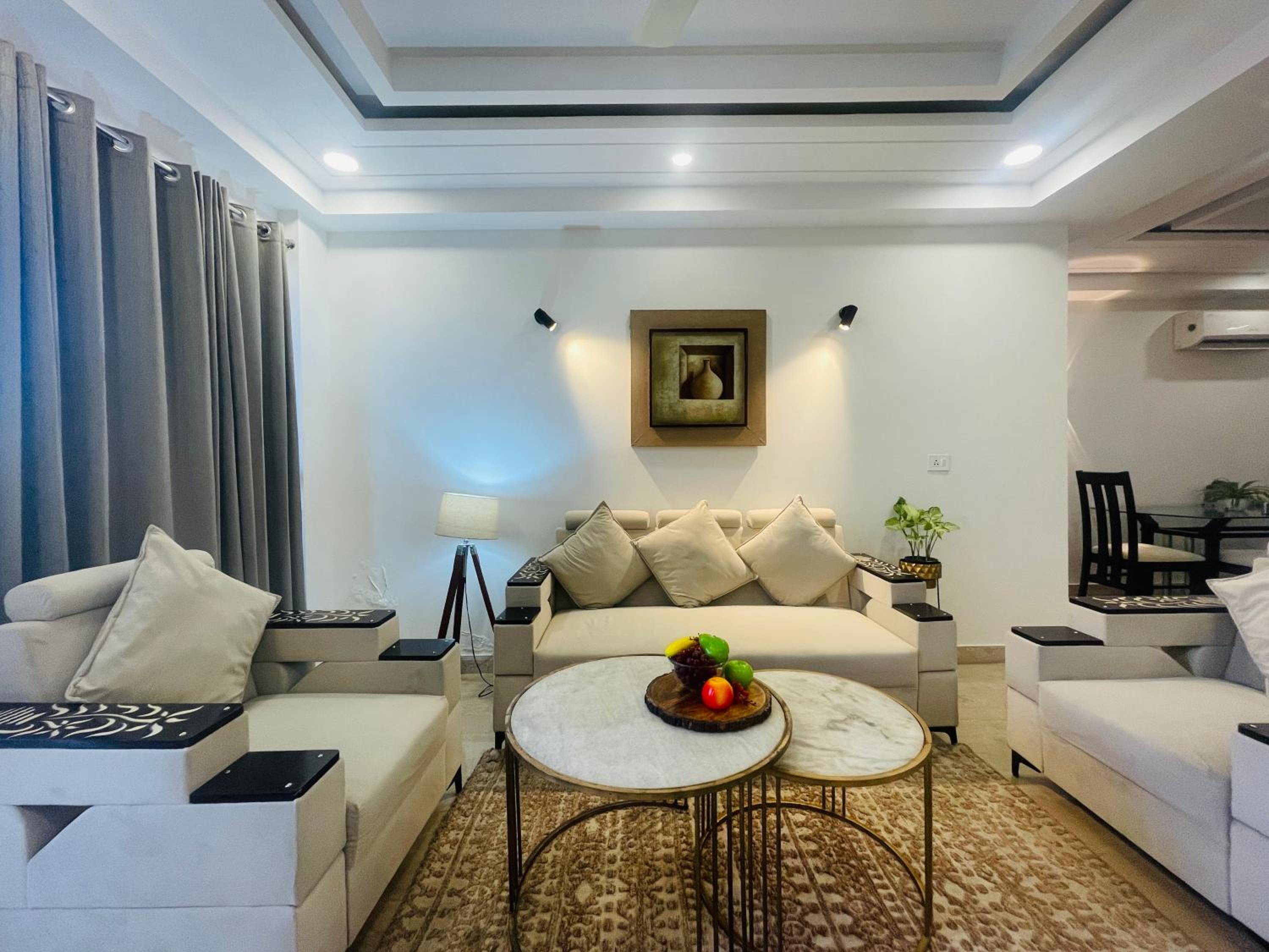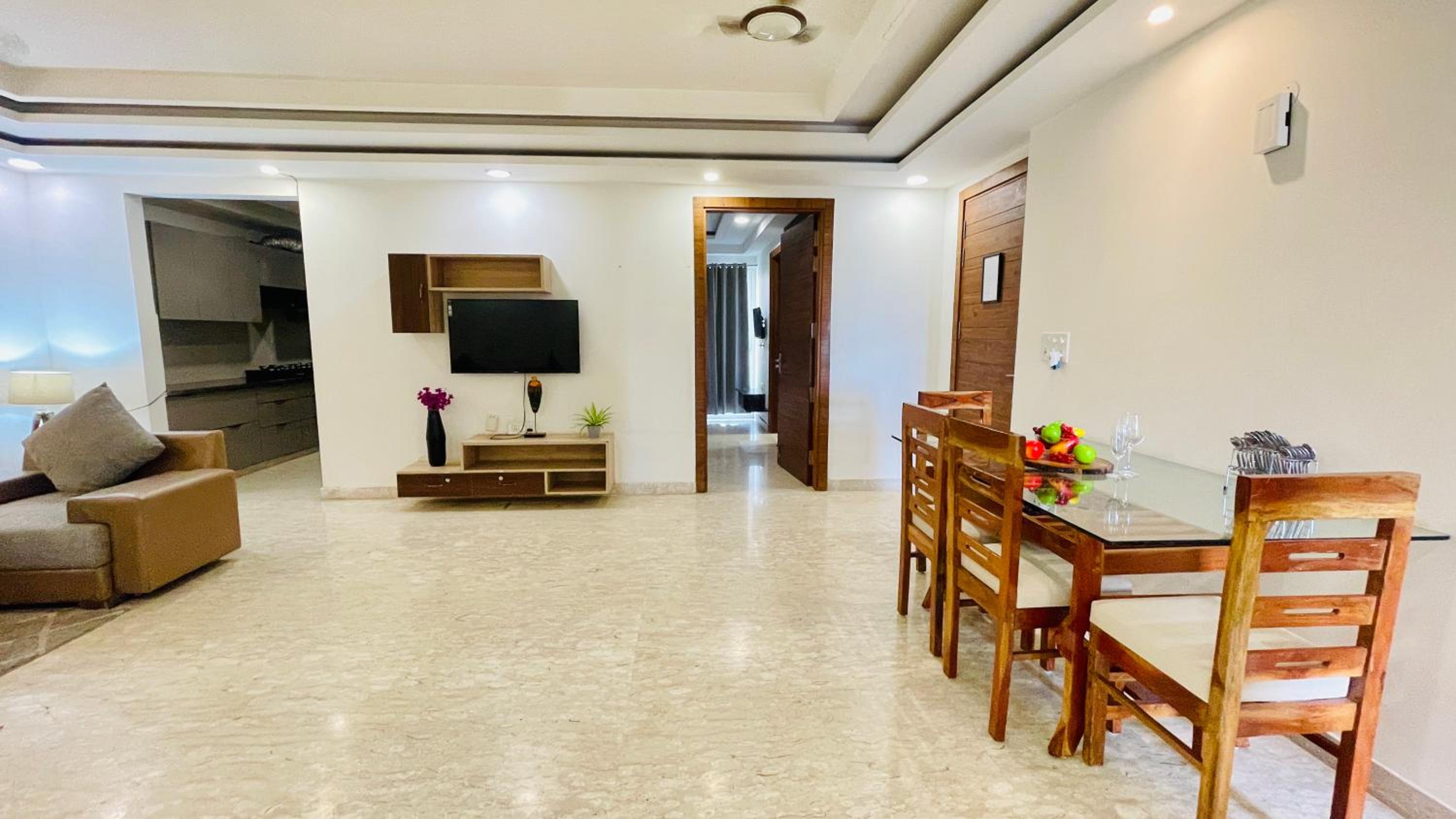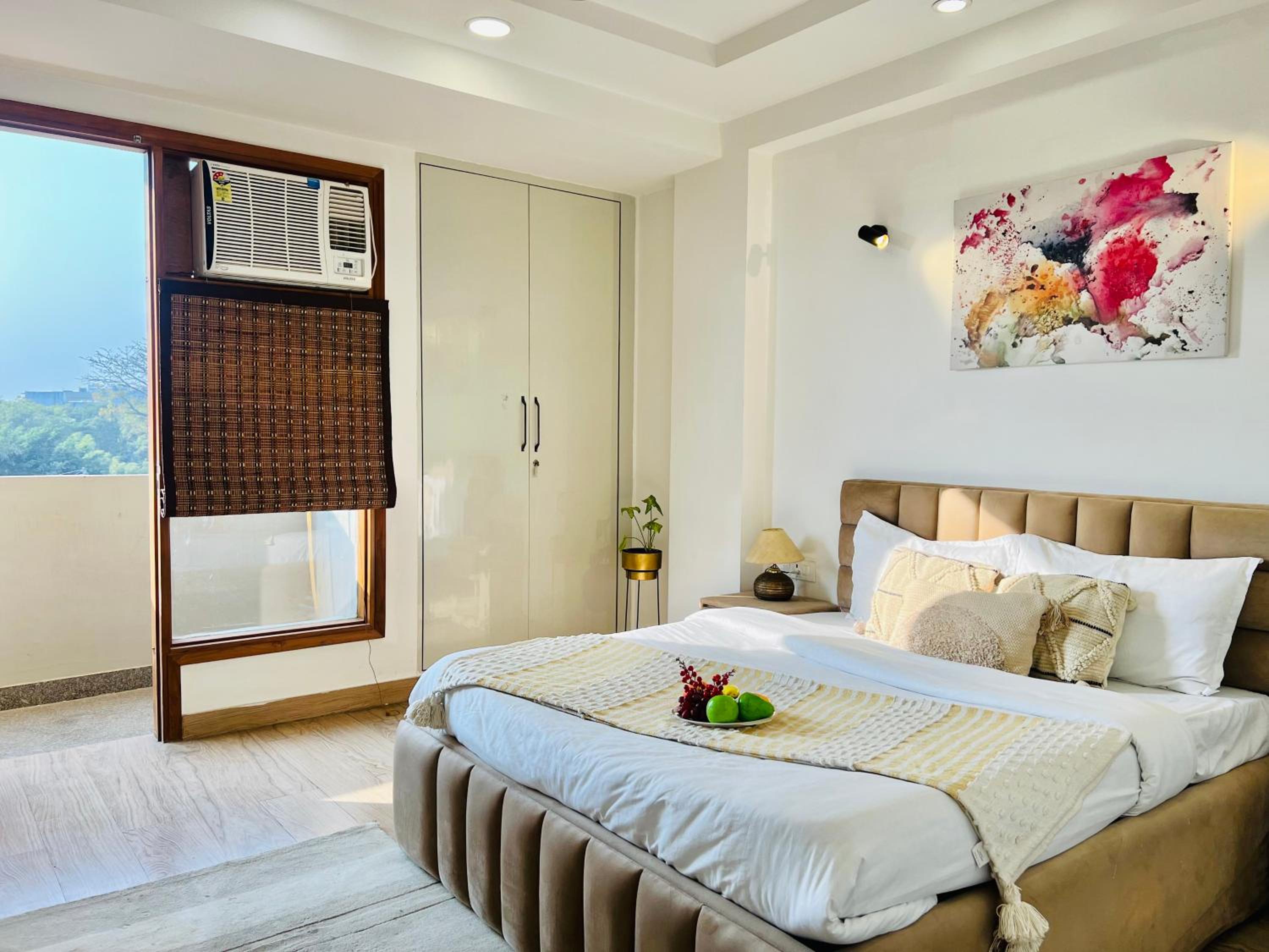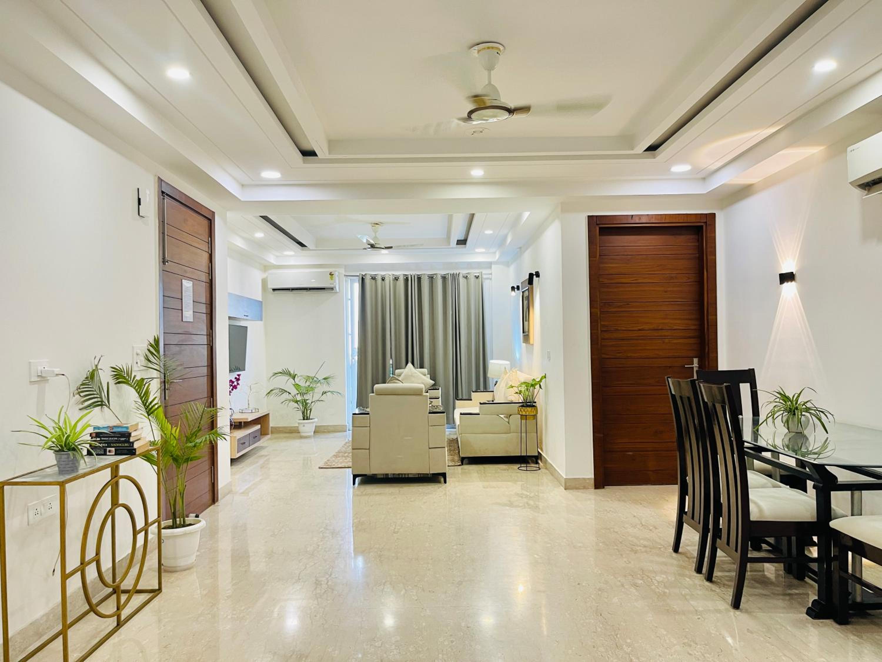 Experience comfort and style at Bedchambers Serviced Apartments in Gurgaon. The spacious 3-bedroom apartment offers a fully equipped kitchen, flat-screen TV, and a private balcony with garden views.