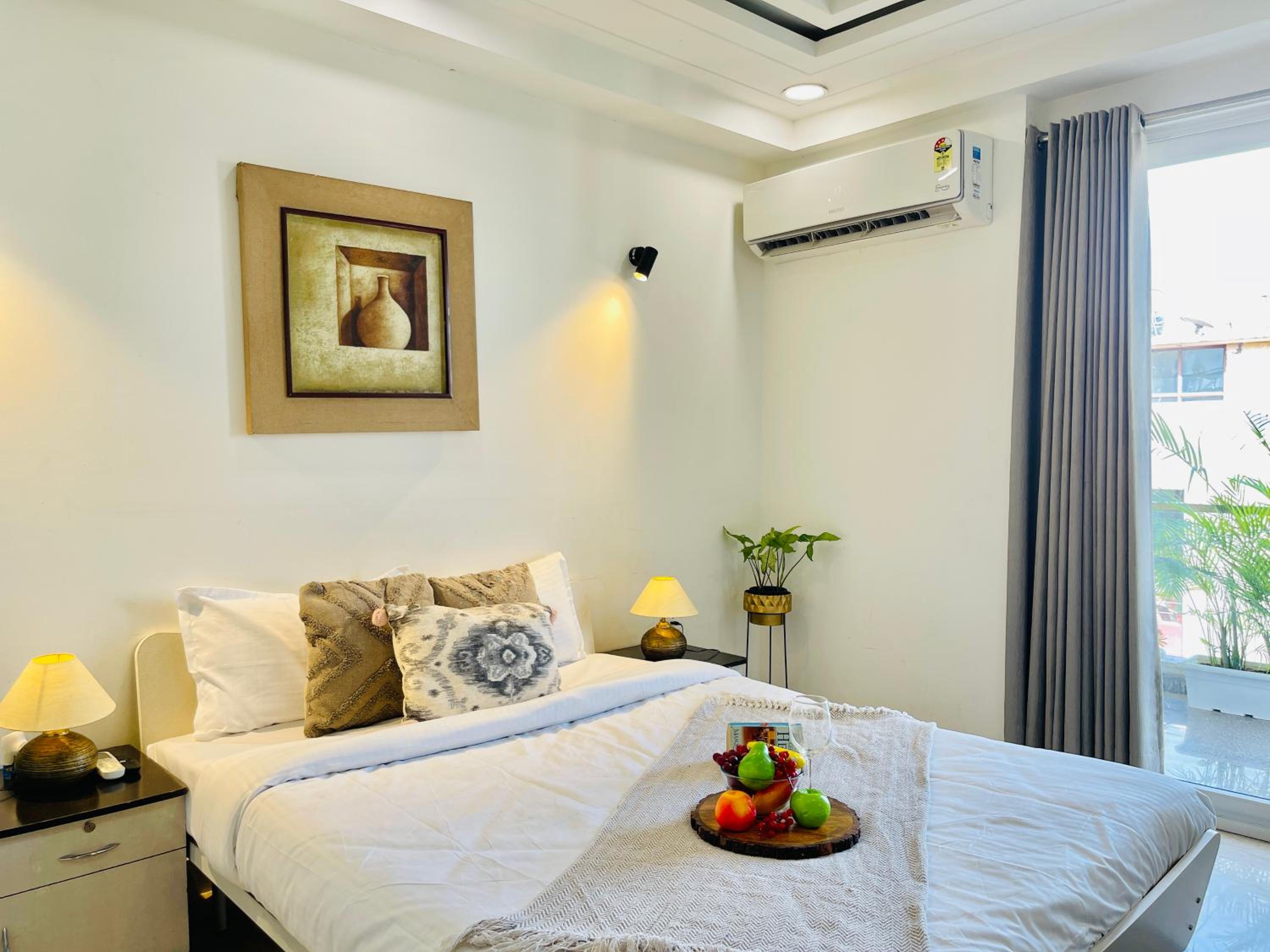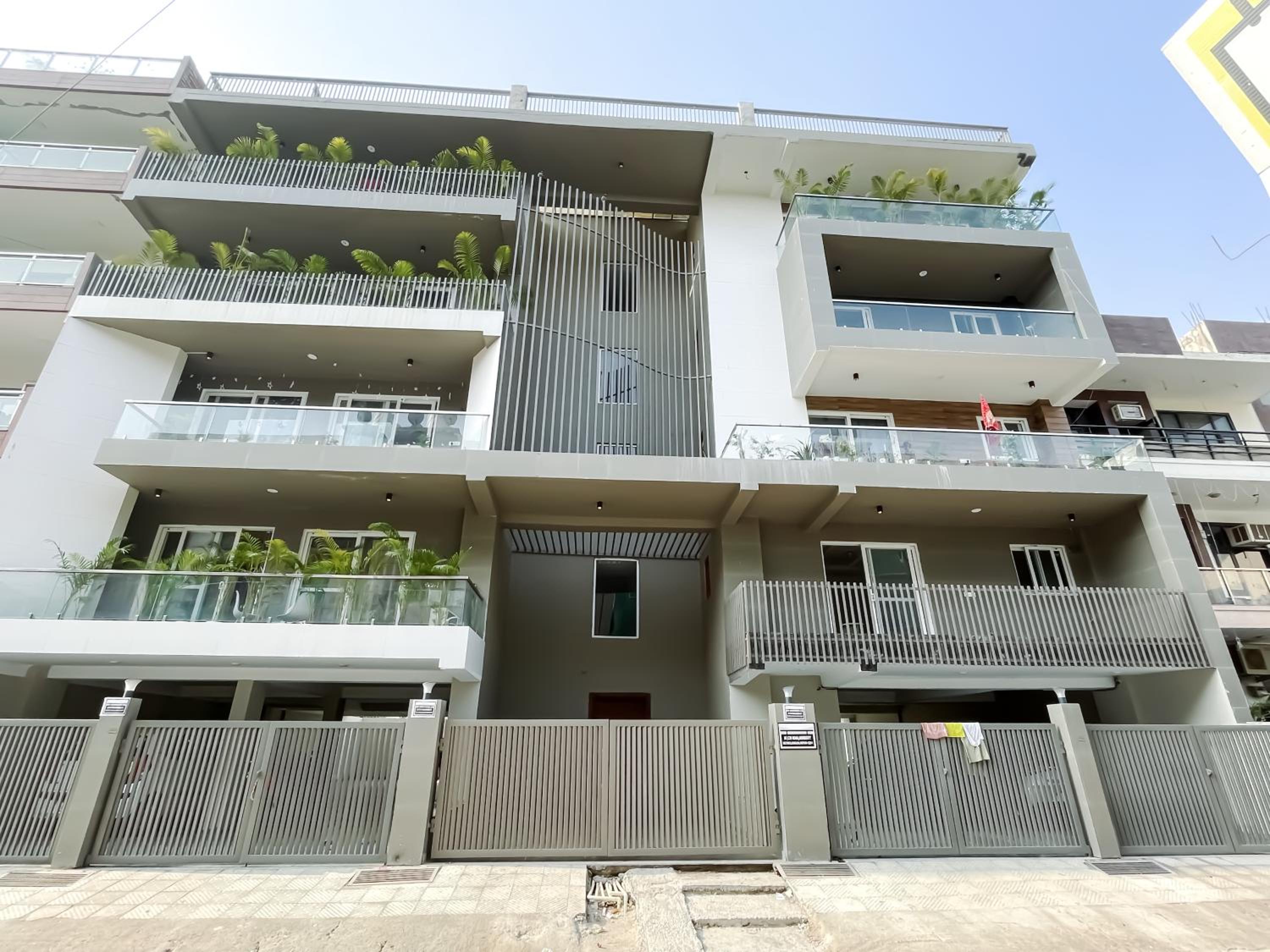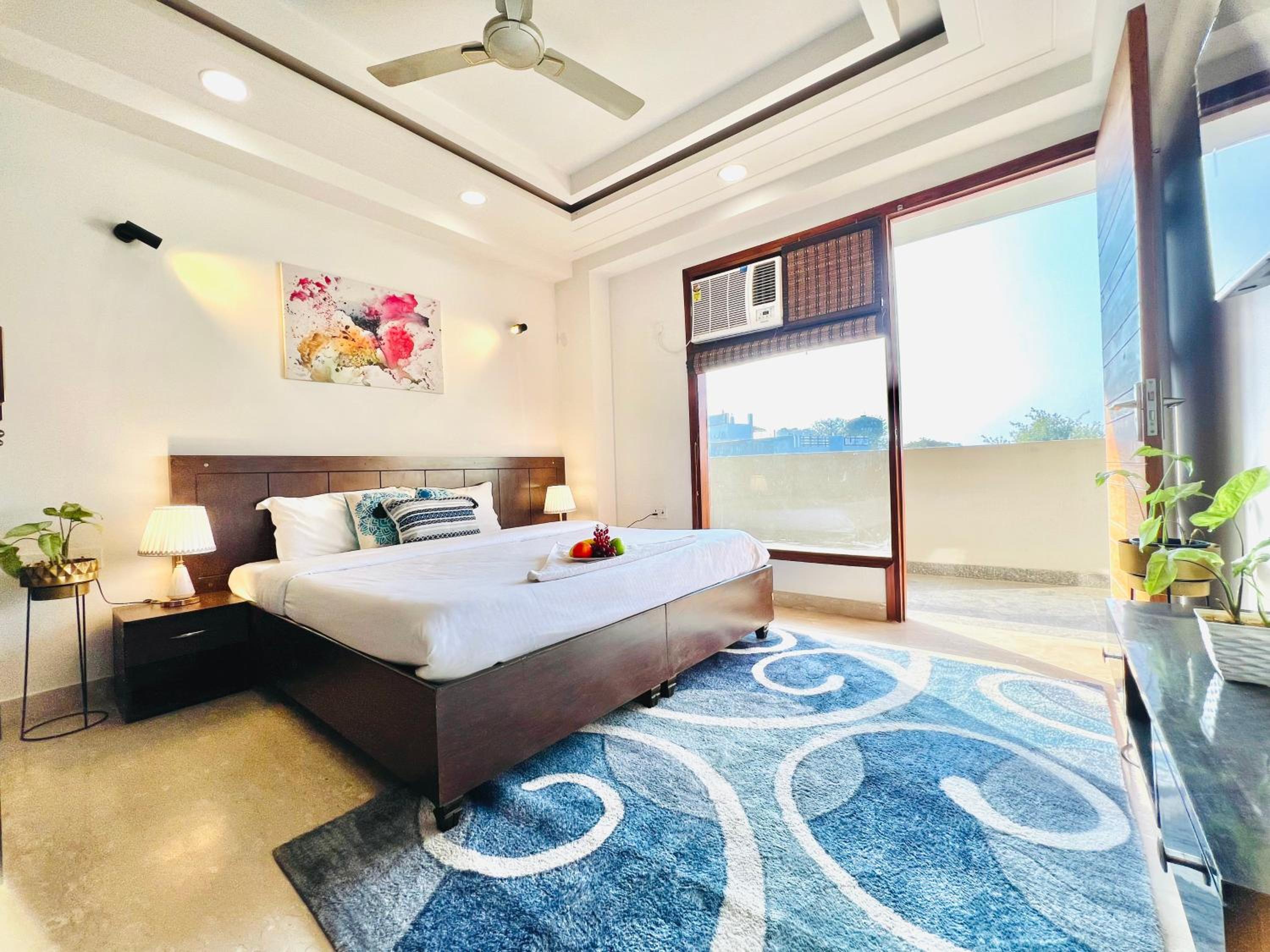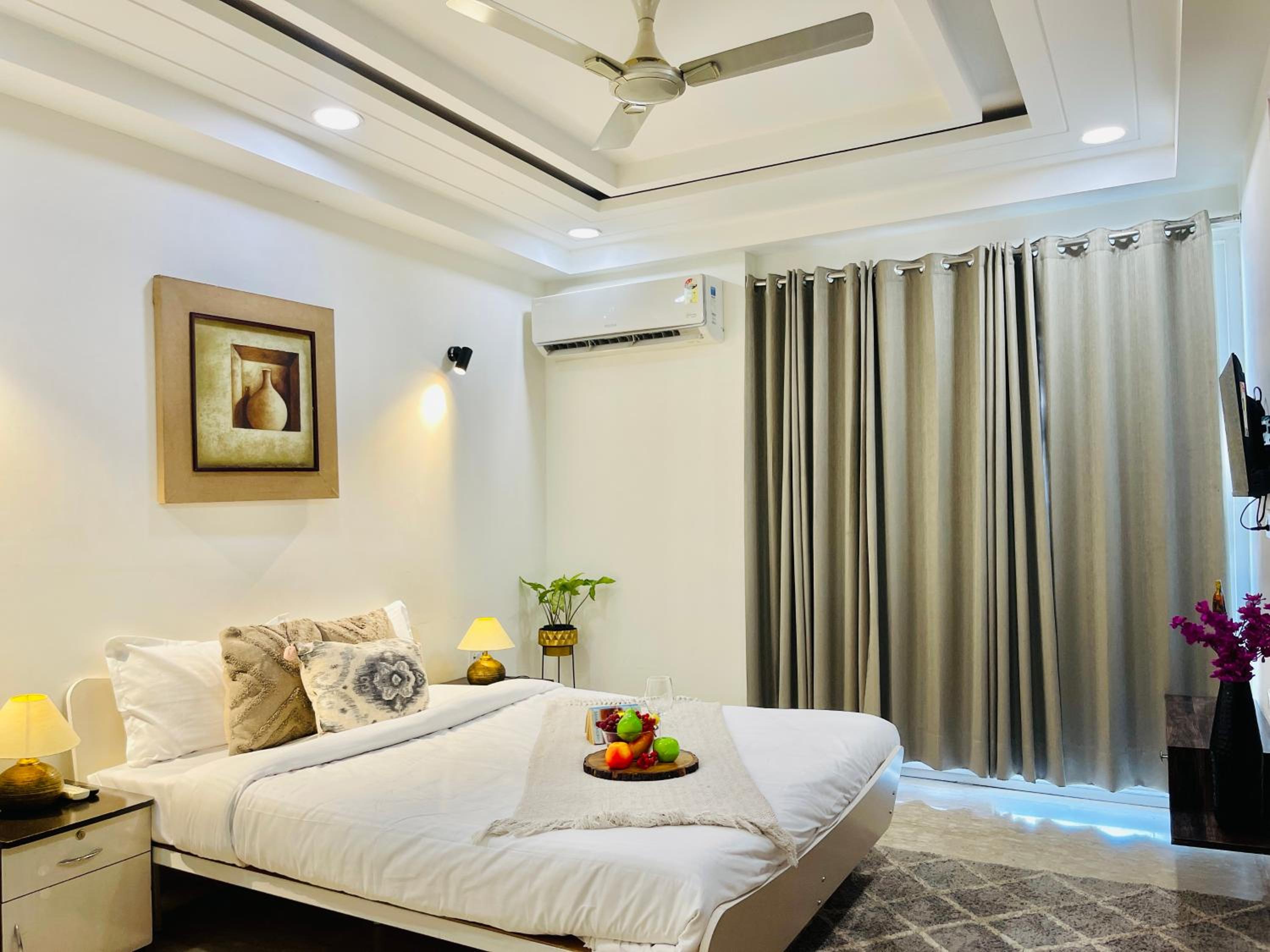 Experience comfort and style at Bedchambers Serviced Apartments in Gurgaon. The spacious 3-bedroom apartment offers a fully equipped kitchen, flat-screen TV, and a private balcony with garden views.