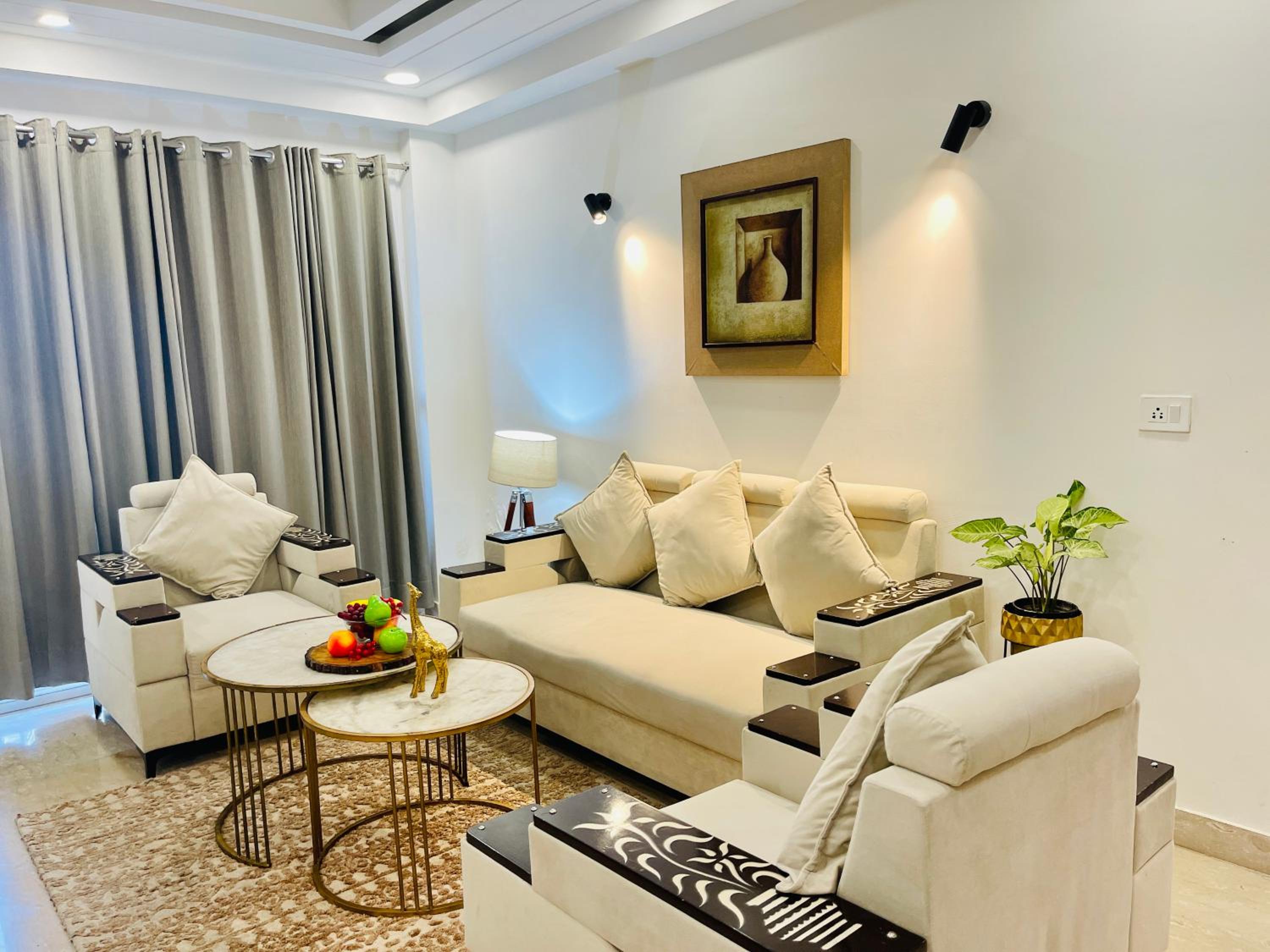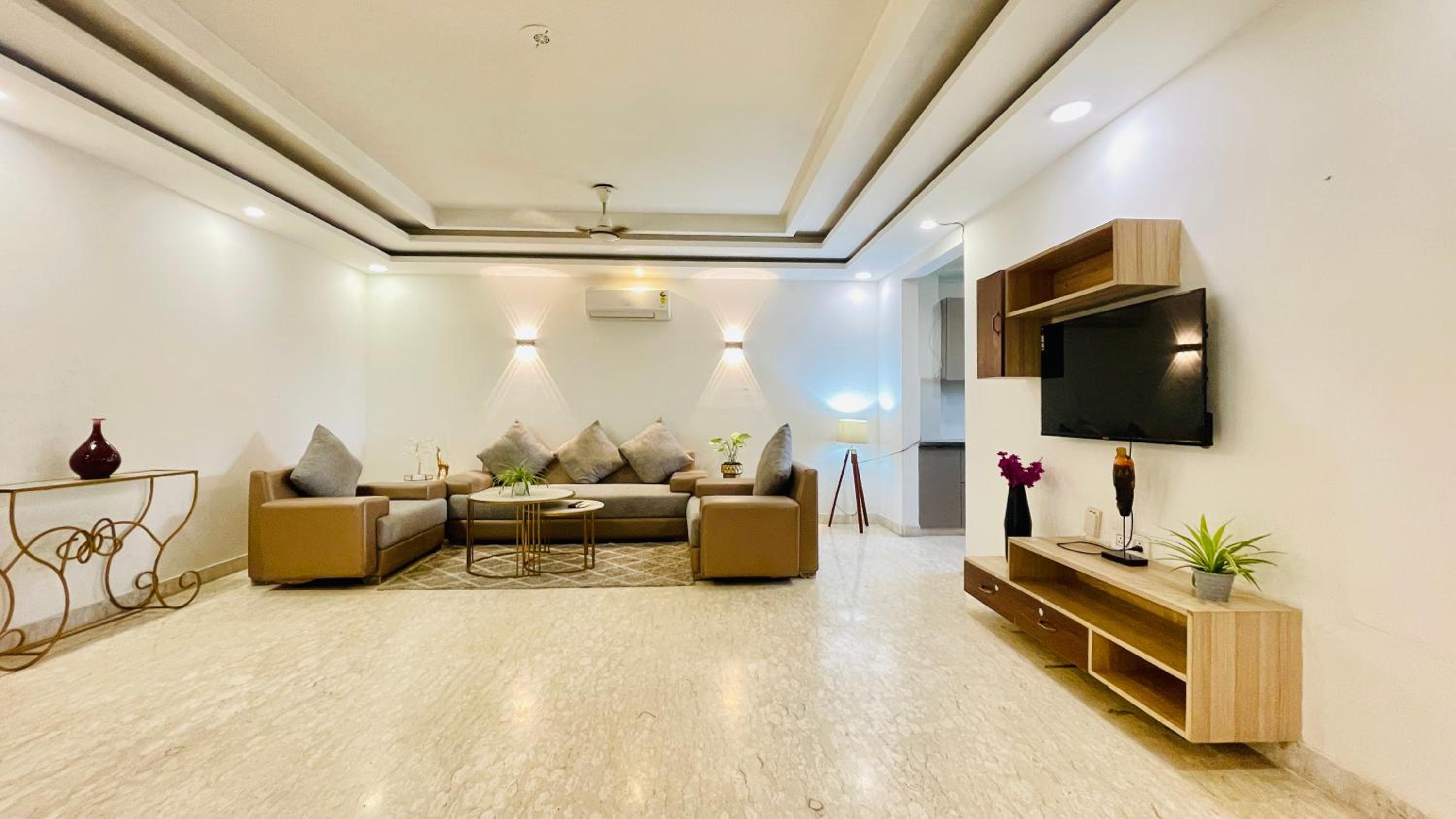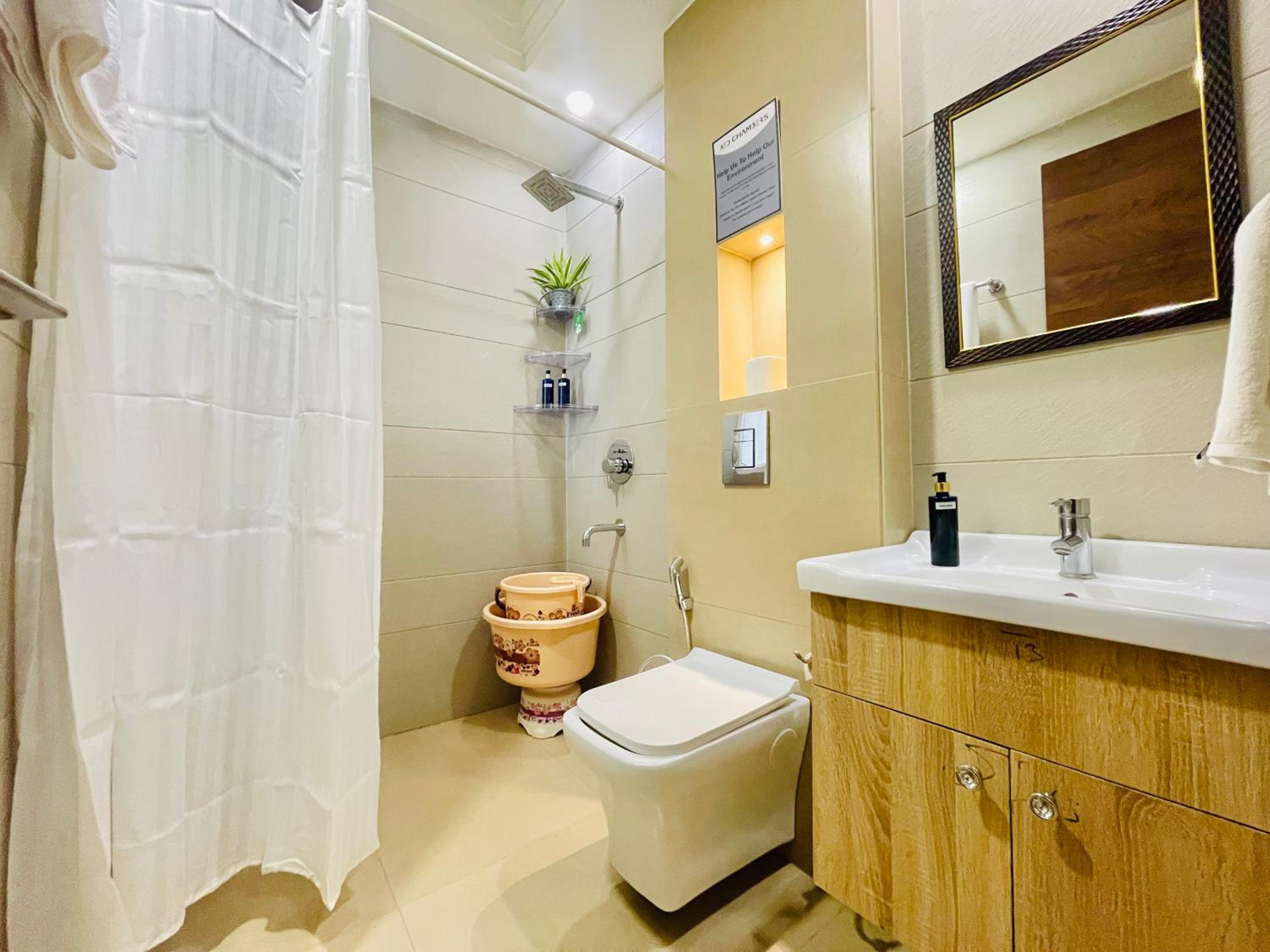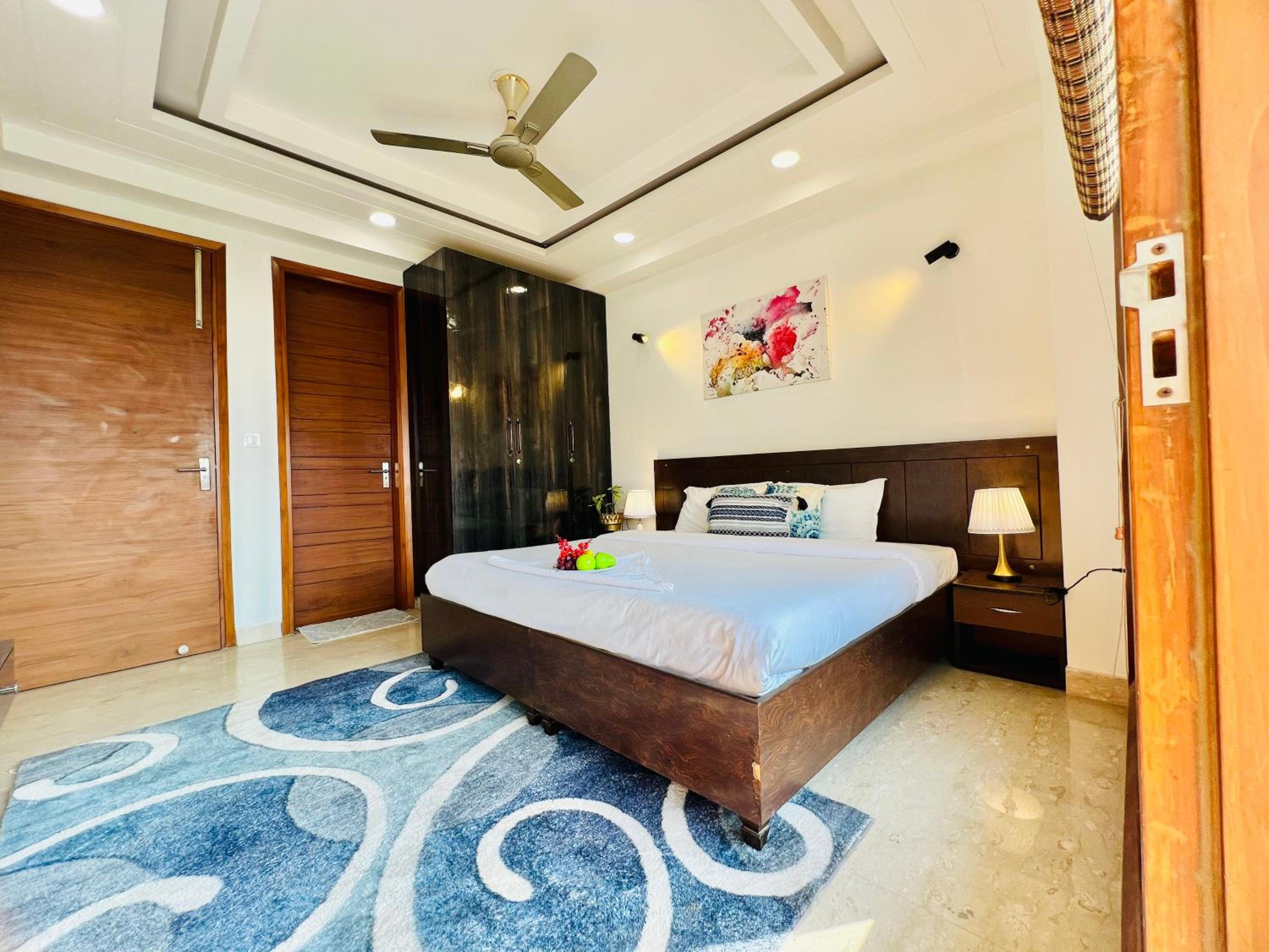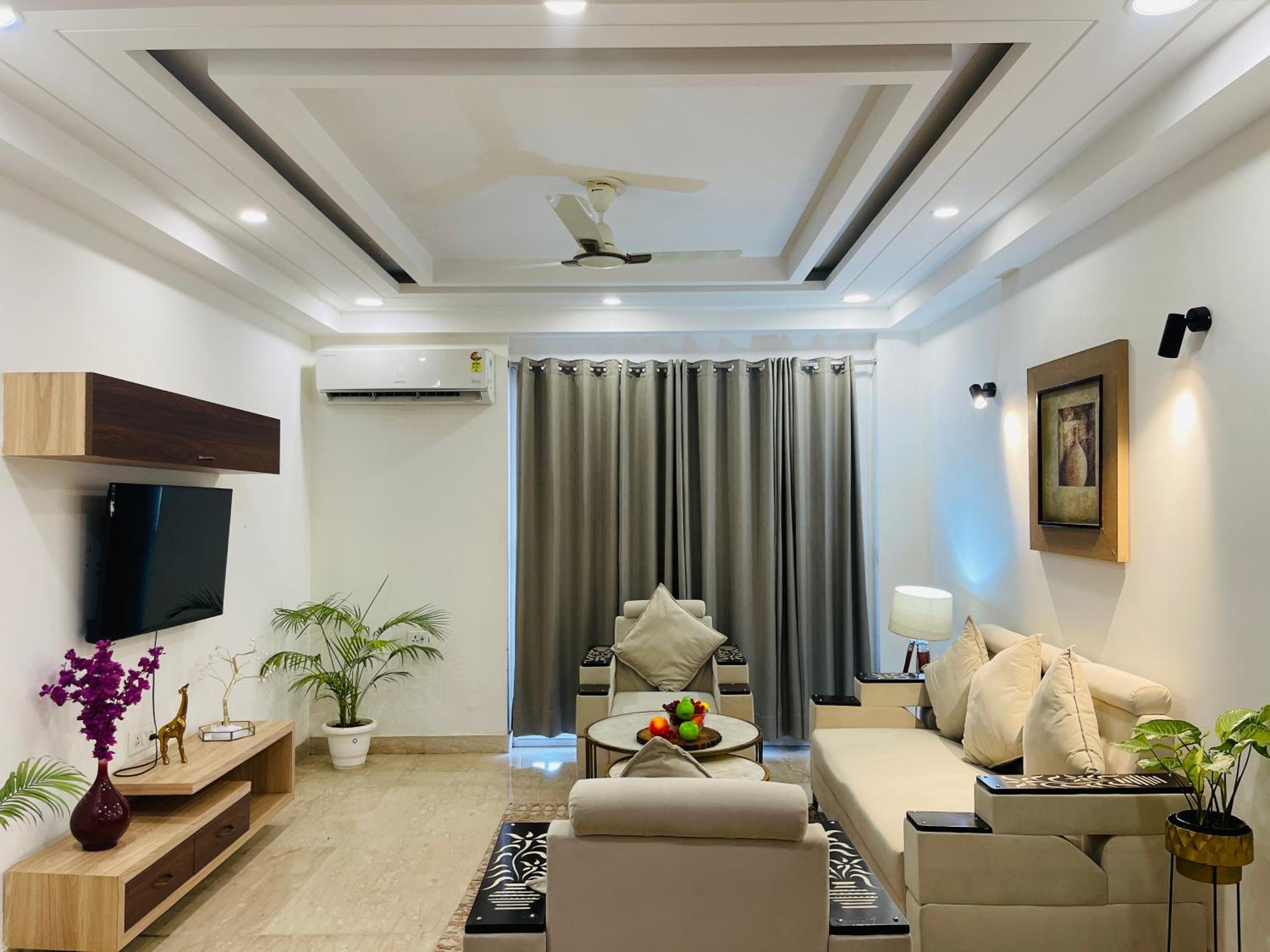 Experience comfort and style at Bedchambers Serviced Apartments in Gurgaon. The spacious 3-bedroom apartment offers a fully equipped kitchen, flat-screen TV, and a private balcony with garden views.