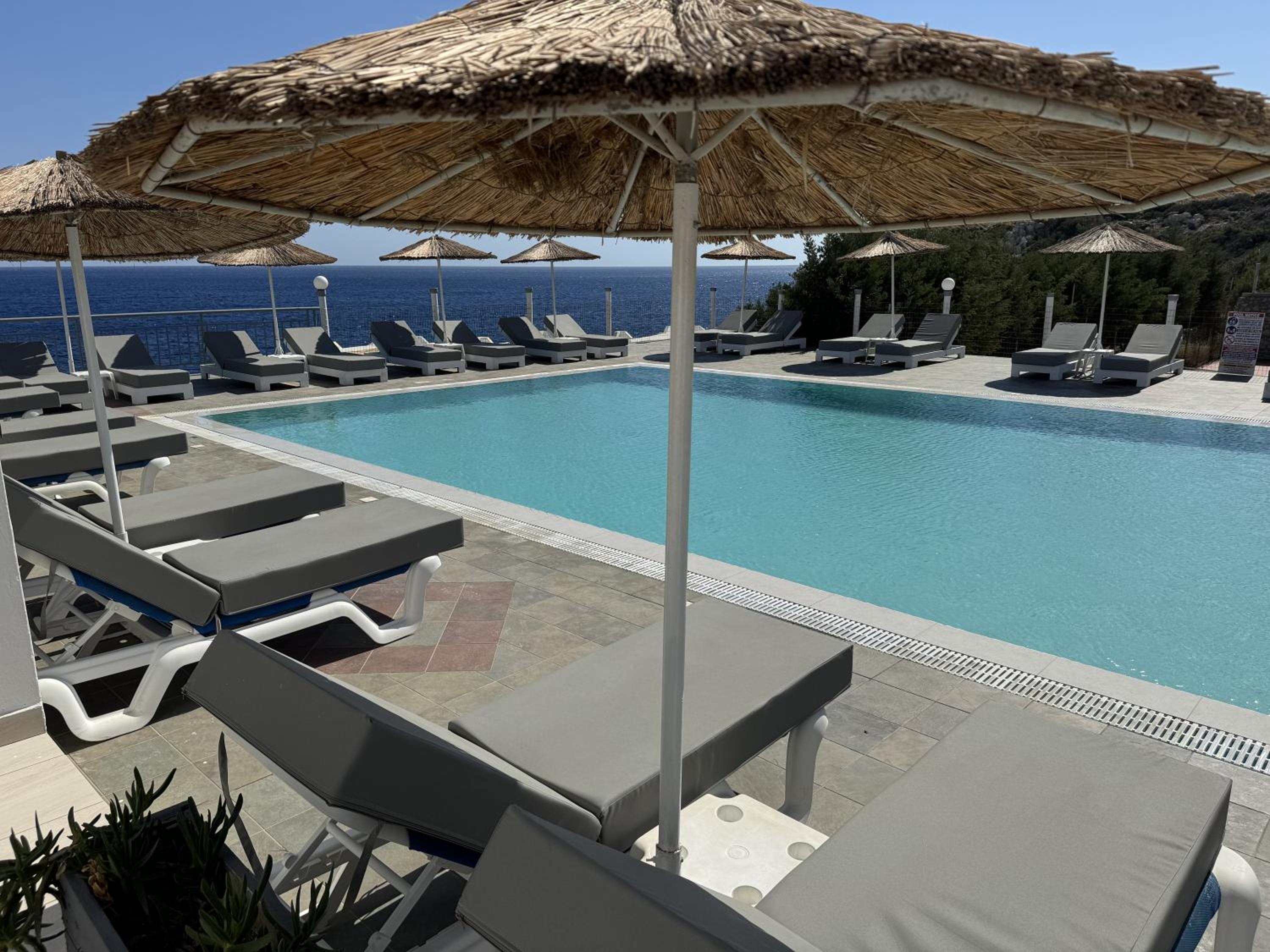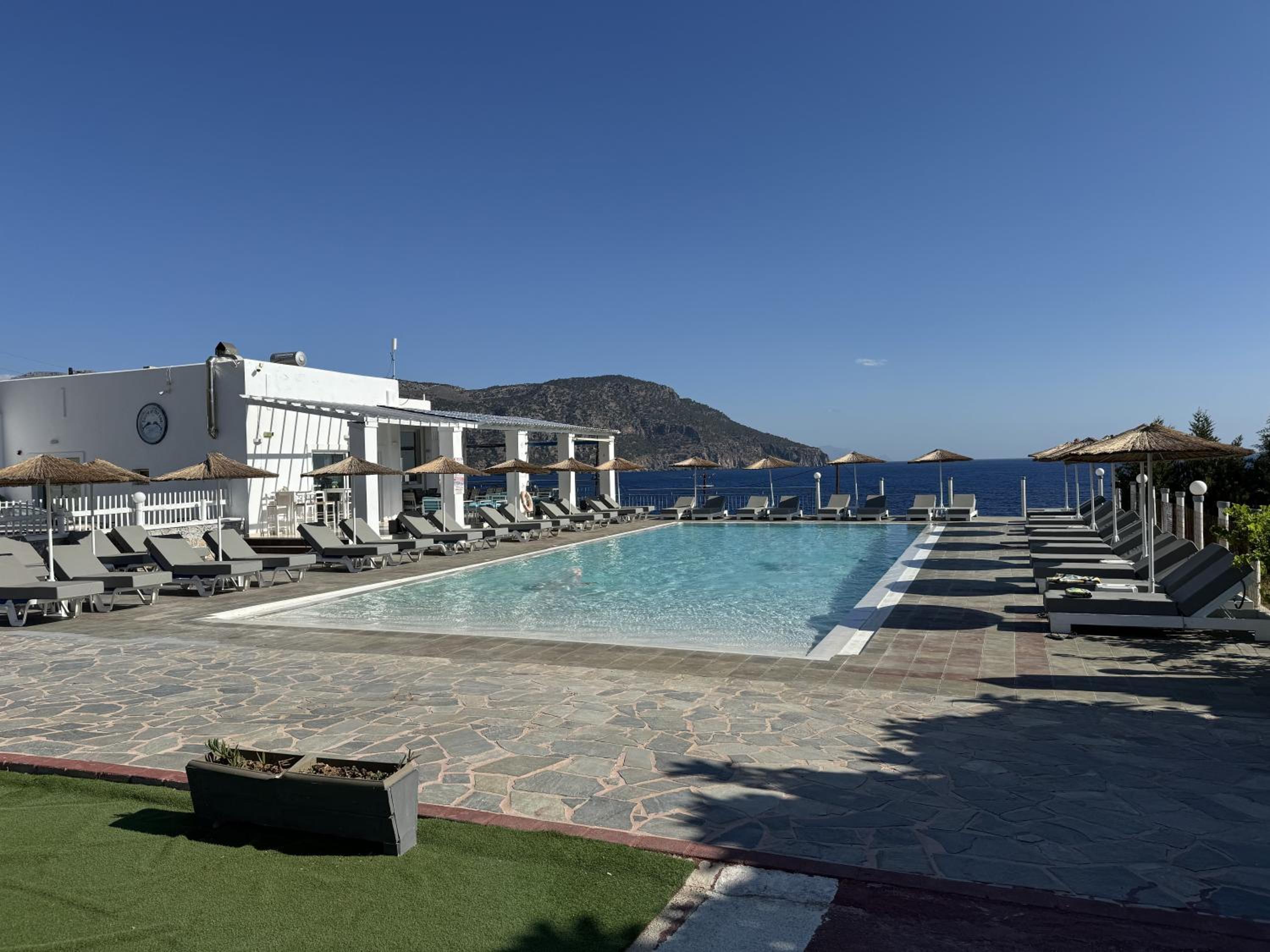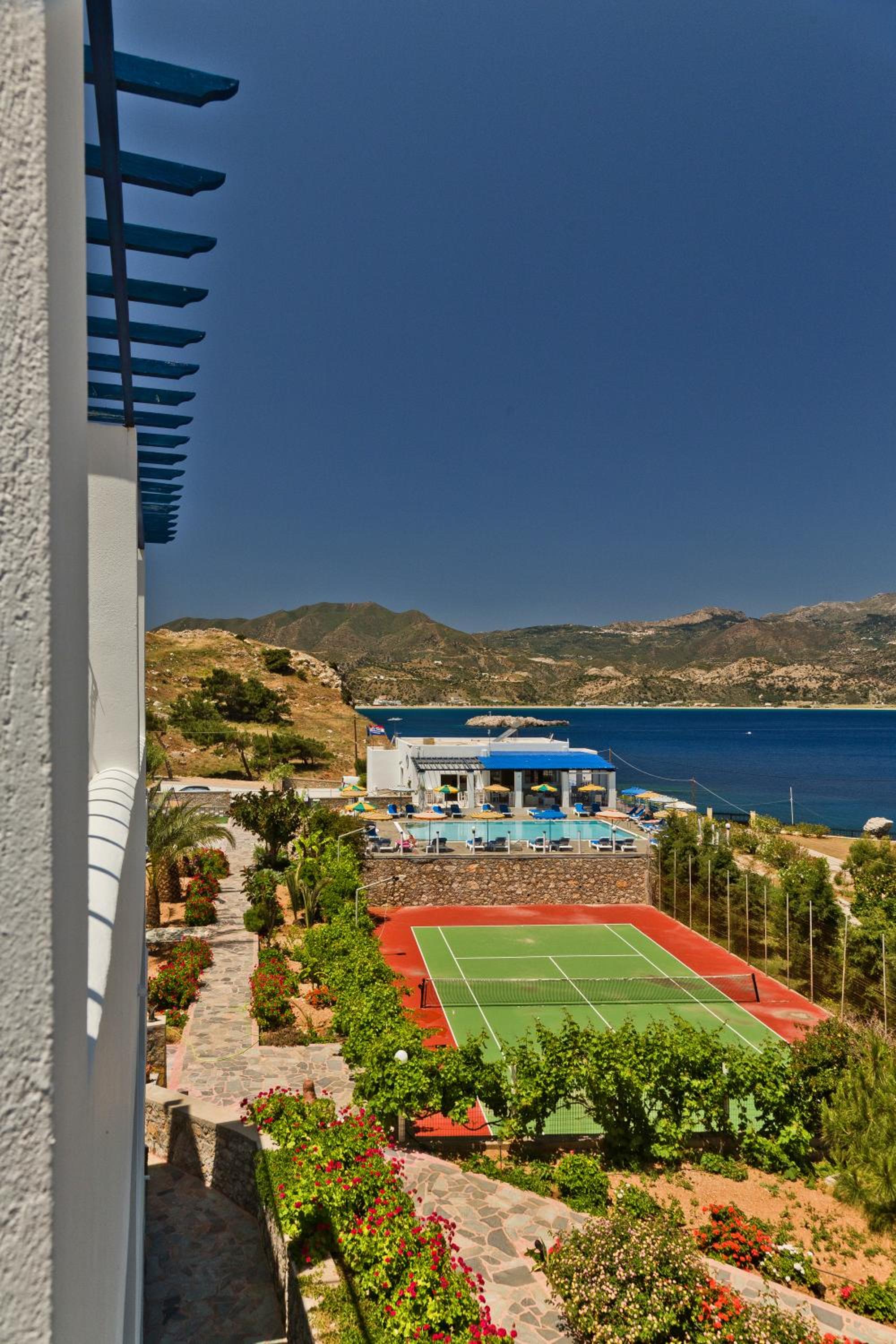 The property is located on a hill, with a direct view over dramatic sea - spectacular view. The hotel has a nice swimming pool and sunbathing area, an apartment building and some detached bungalows , a tennis court and laundry facilities. A bit run down, it has some old charm and is very ,very relaxing. We stayed there 3 days and overall, enjoyed it. You can rent a car, and the hotel serves simple daily meals (nothing fancy but if you`re hungry, you will not regret). The staff is very friendly and lovely - that was the highlight of our stay. They put us in a bigger apartment so that we could have some privacy and our own rooms, which I highly appreciated. There was a daily cleaning service and fantastic laundry facilities- just perfect after a week of sailing:)