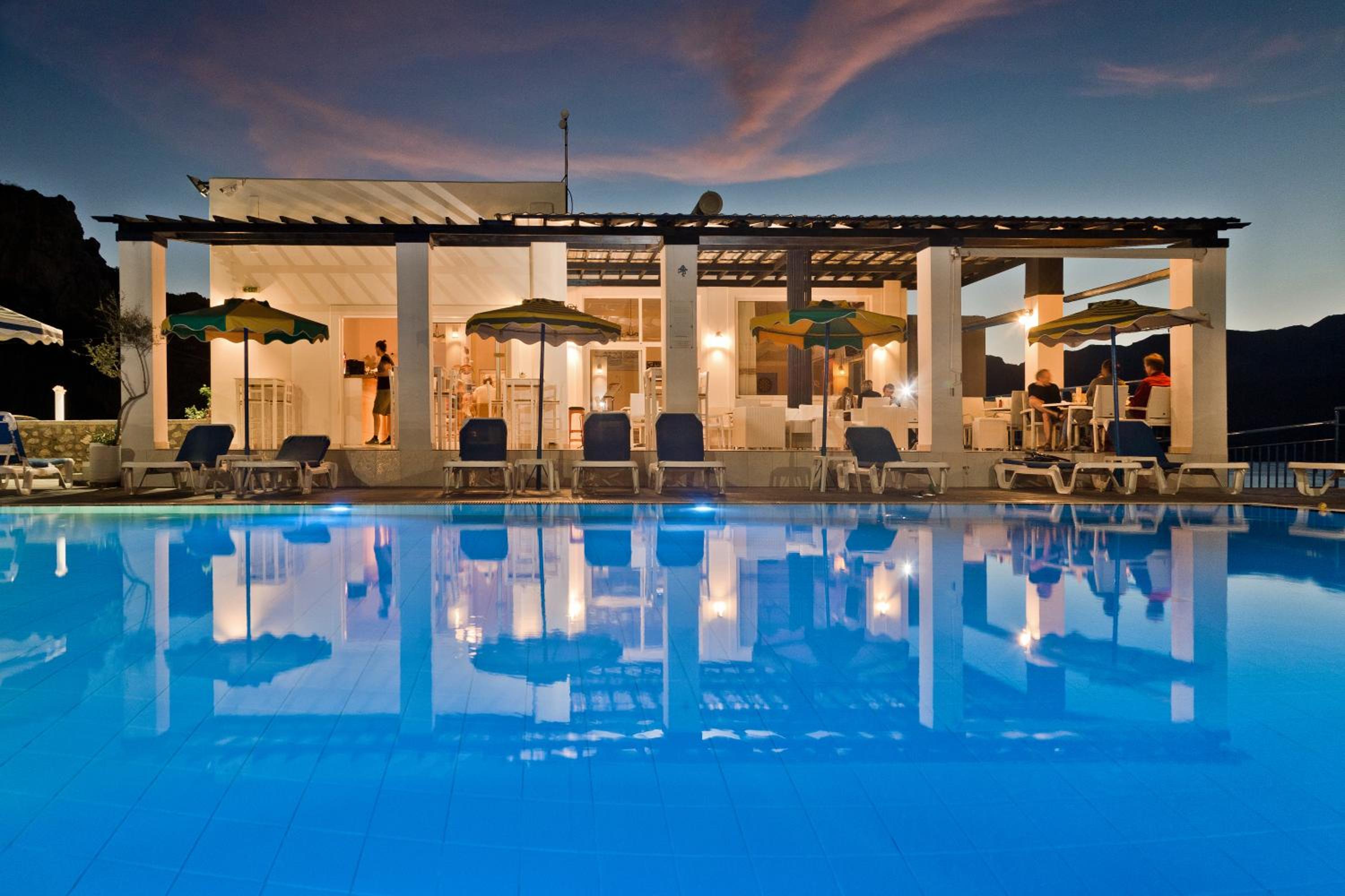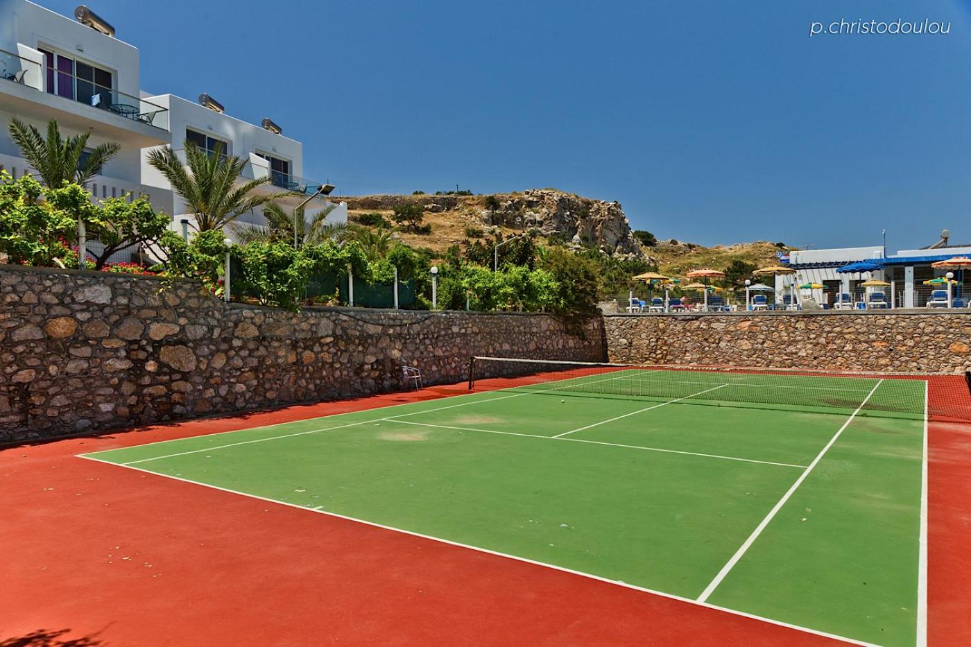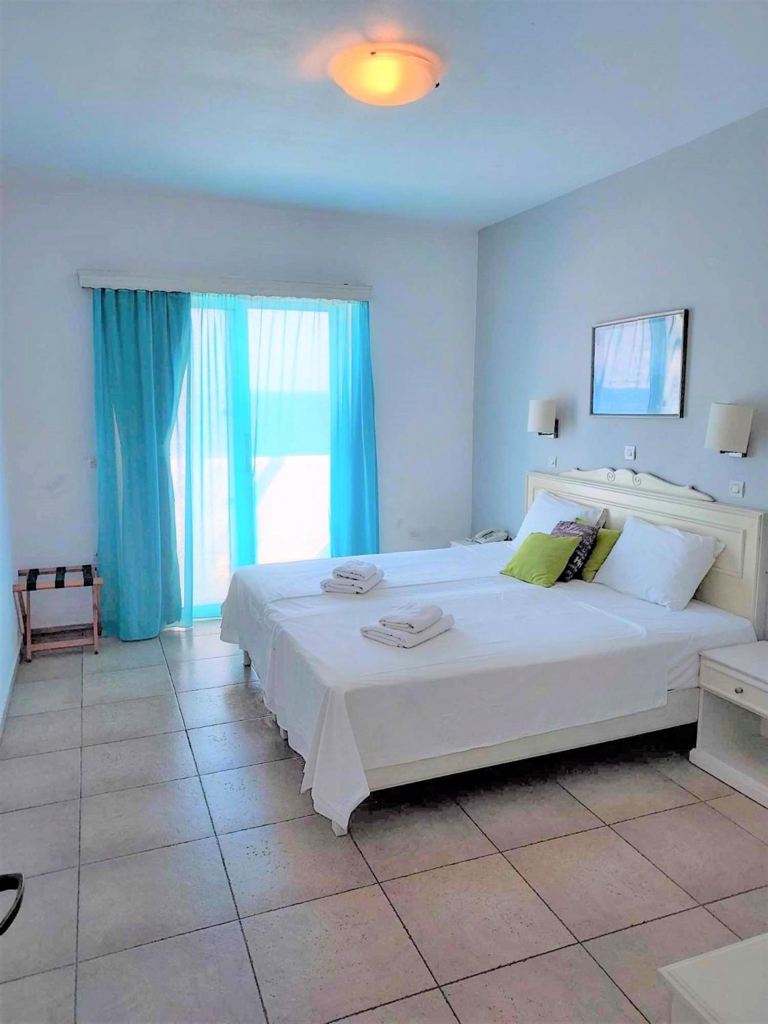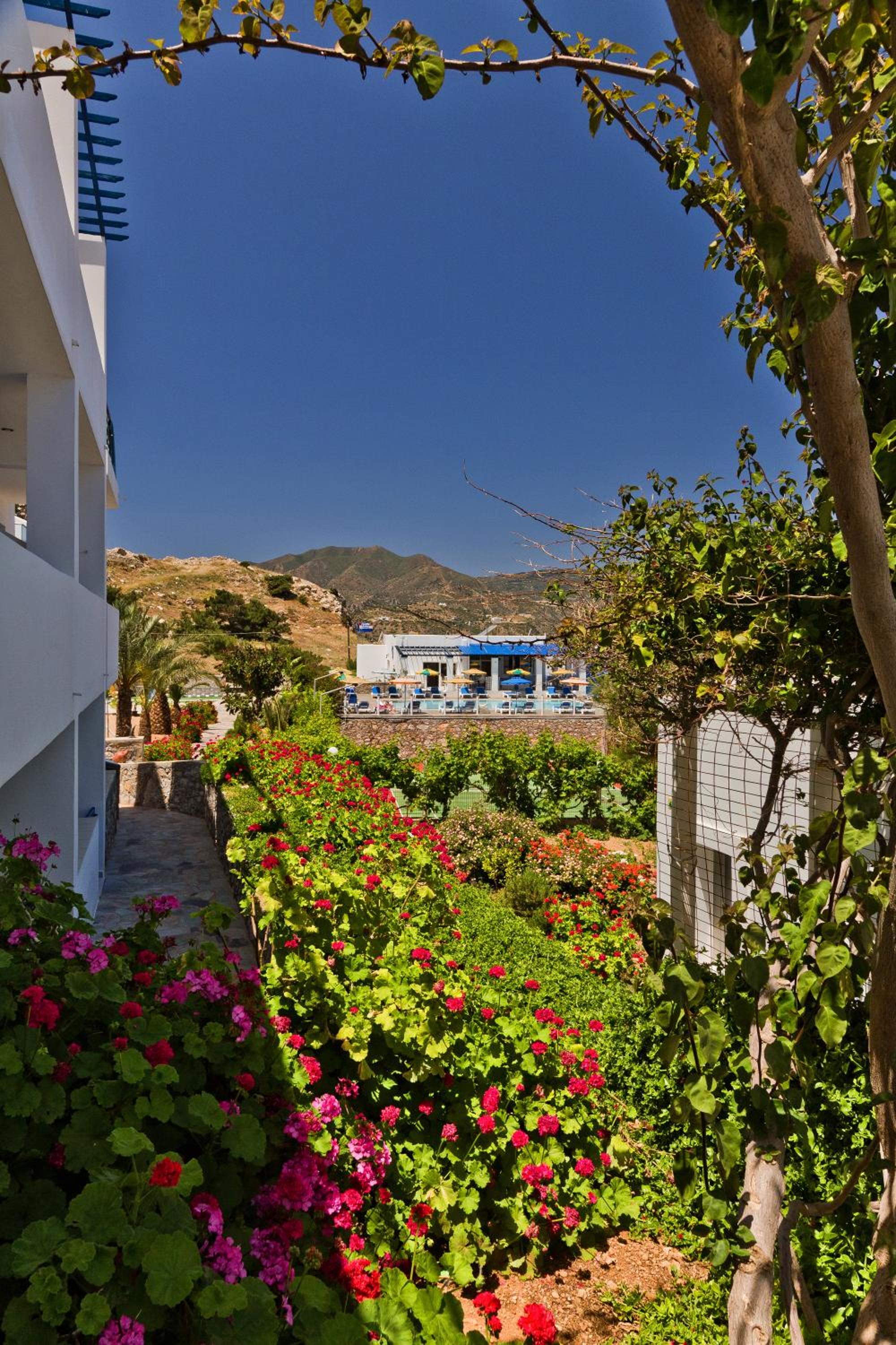 The property is located on a hill, with a direct view over dramatic sea - spectacular view. The hotel has a nice swimming pool and sunbathing area, an apartment building and some detached bungalows , a tennis court and laundry facilities. A bit run down, it has some old charm and is very ,very relaxing. We stayed there 3 days and overall, enjoyed it. You can rent a car, and the hotel serves simple daily meals (nothing fancy but if you`re hungry, you will not regret). The staff is very friendly and lovely - that was the highlight of our stay. They put us in a bigger apartment so that we could have some privacy and our own rooms, which I highly appreciated. There was a daily cleaning service and fantastic laundry facilities- just perfect after a week of sailing:)