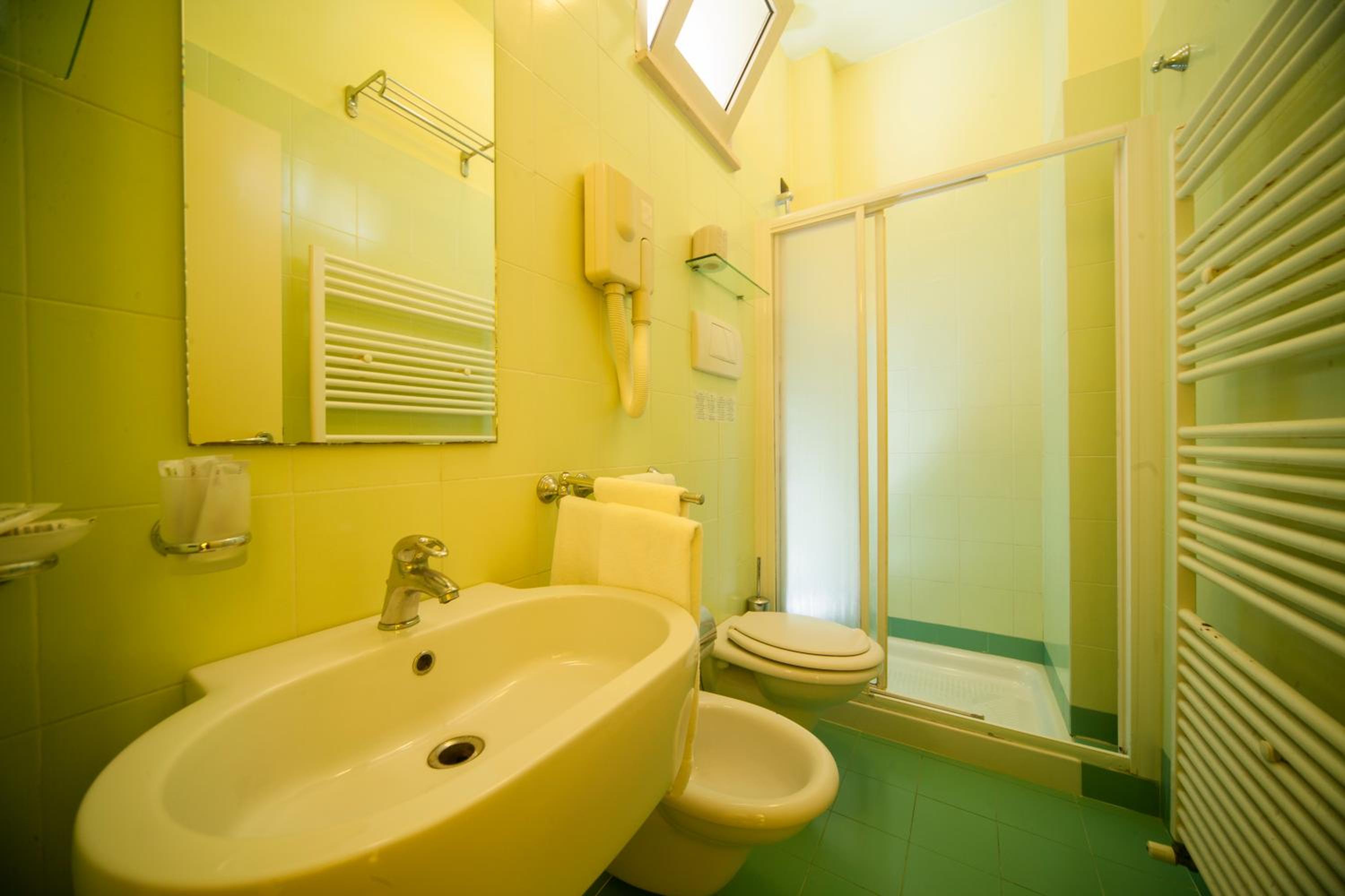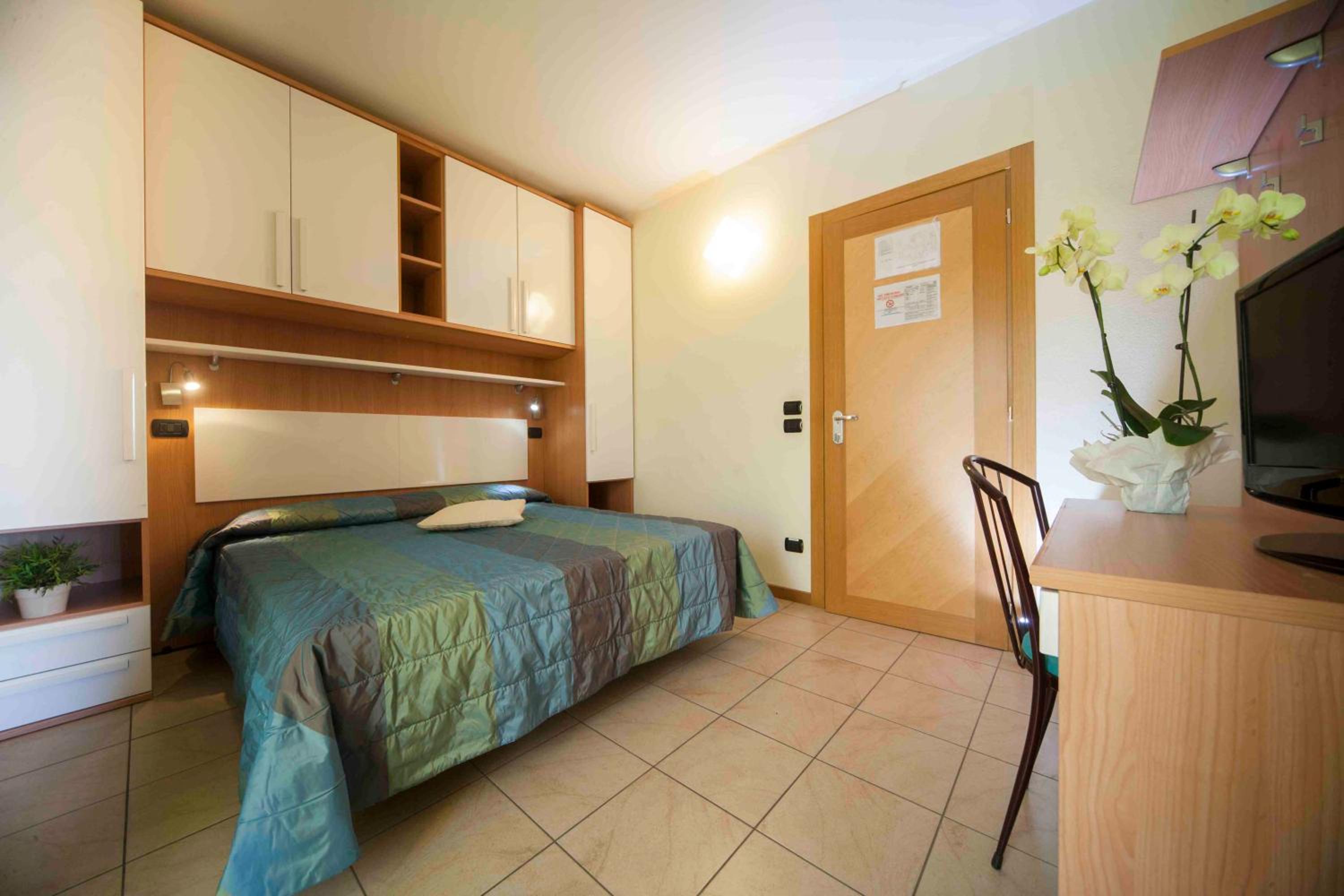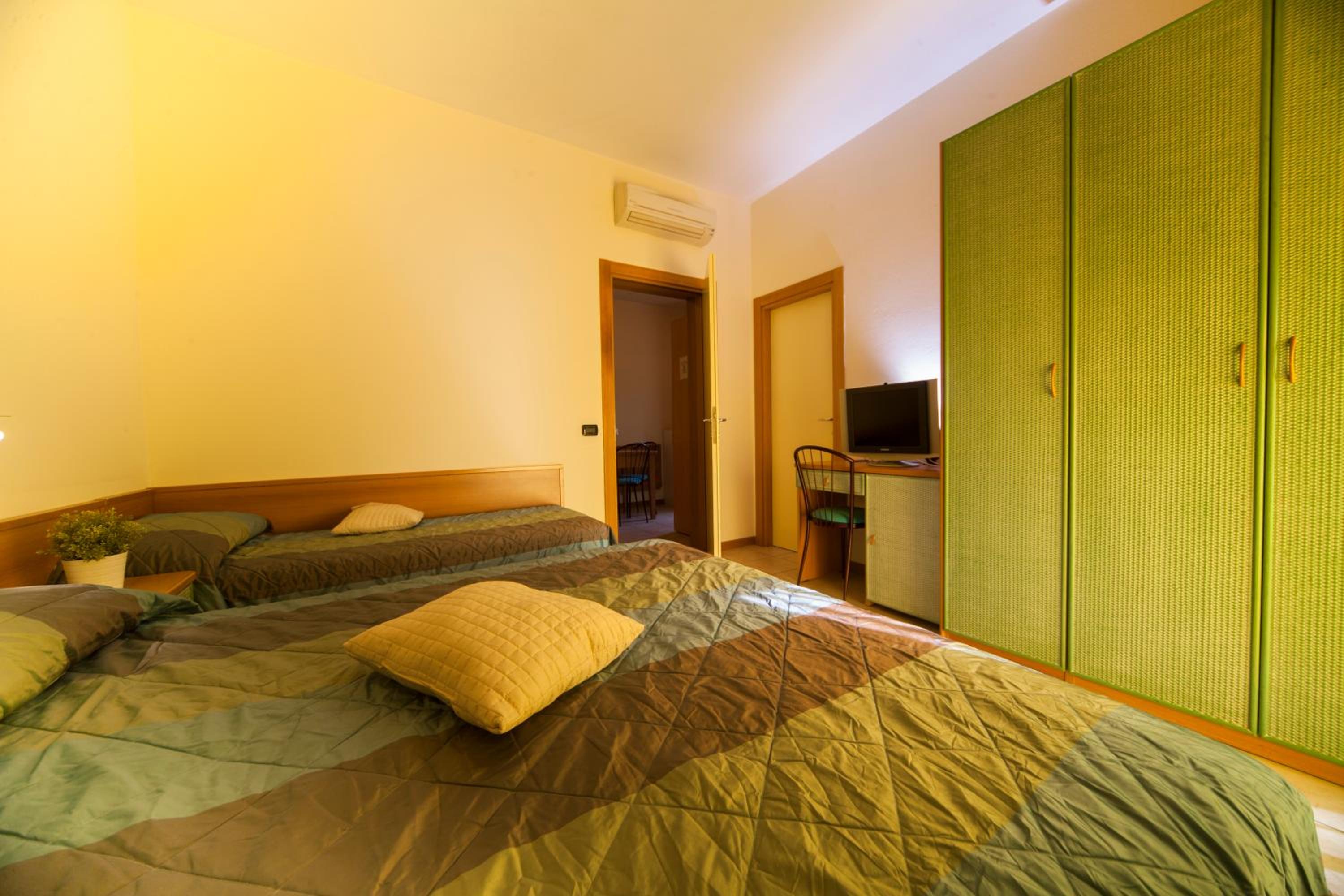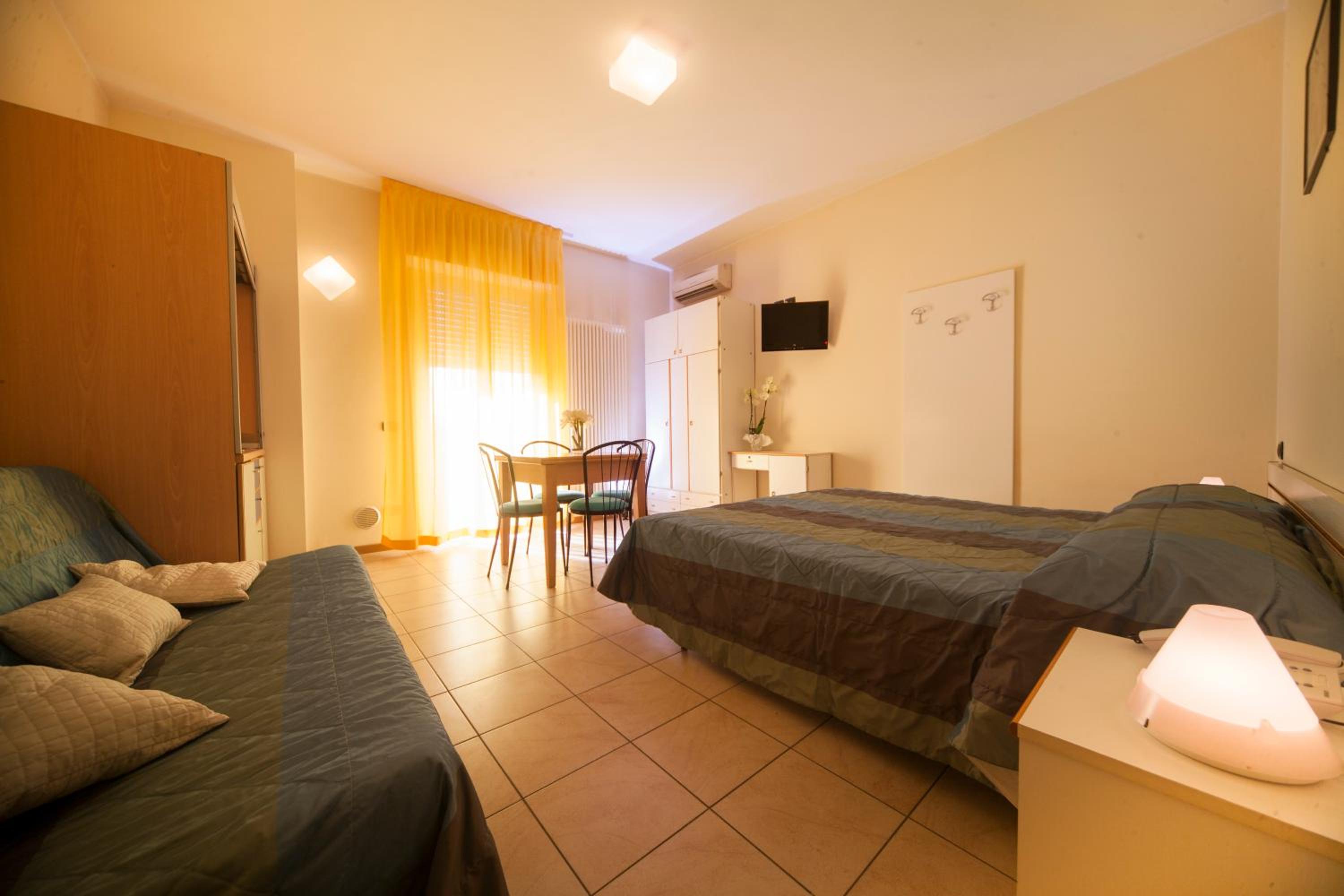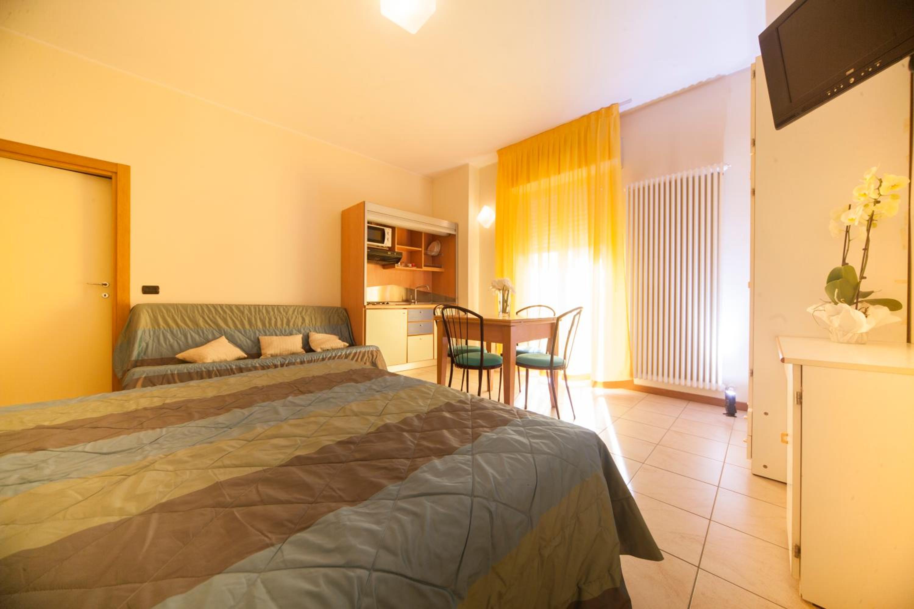 We stayed in an apartment (self catering) room. The pool area was lovely and never too busy (we visited in early July). The location was nice, near the sea and many restaurants. Room was great and had two toilets and two balconies. Good basic cooking utensils. Large fridge freezer. Staff were very polite and helpful. There was a small gym. The town (Rimini) had lots to offer.
