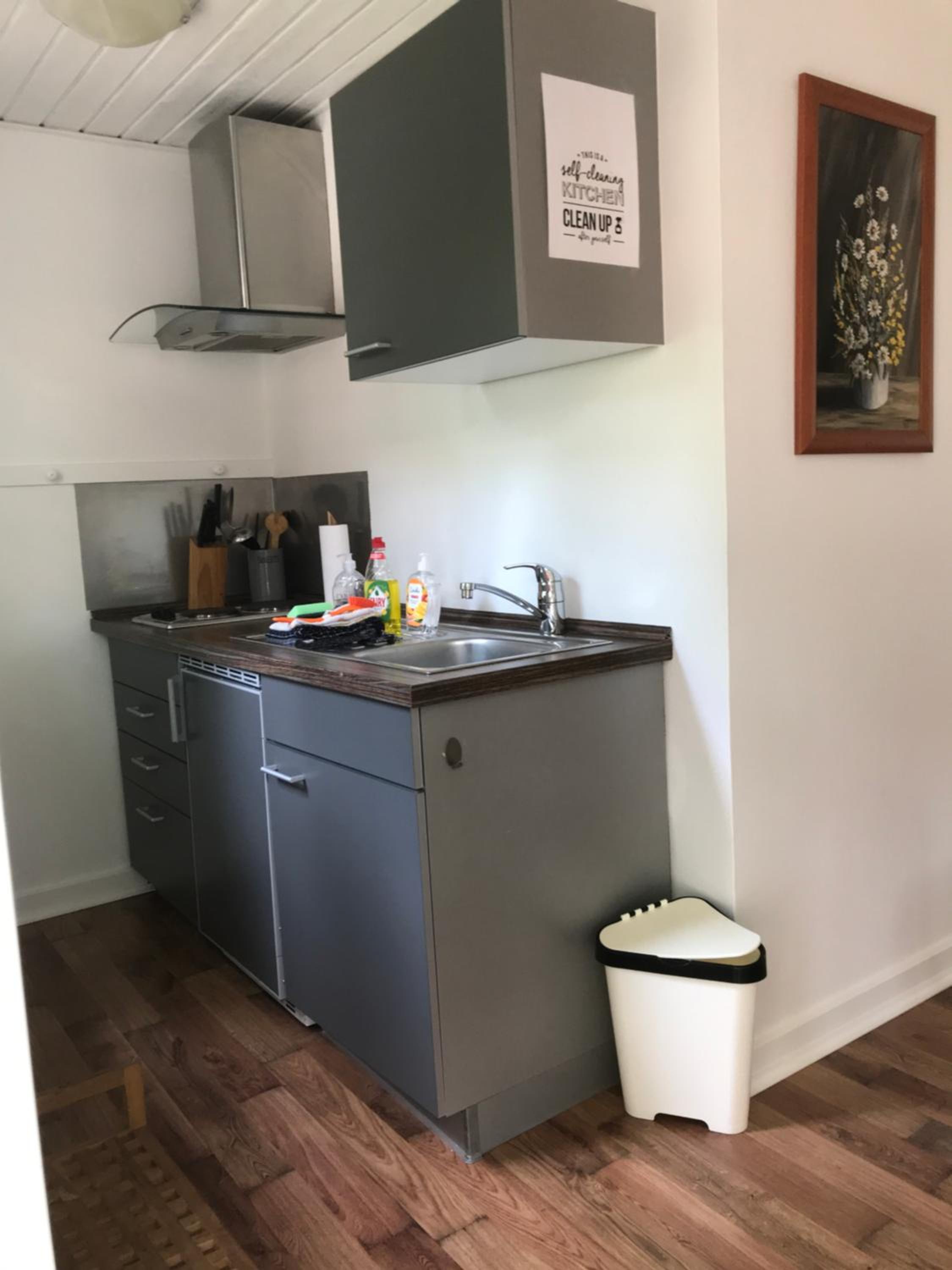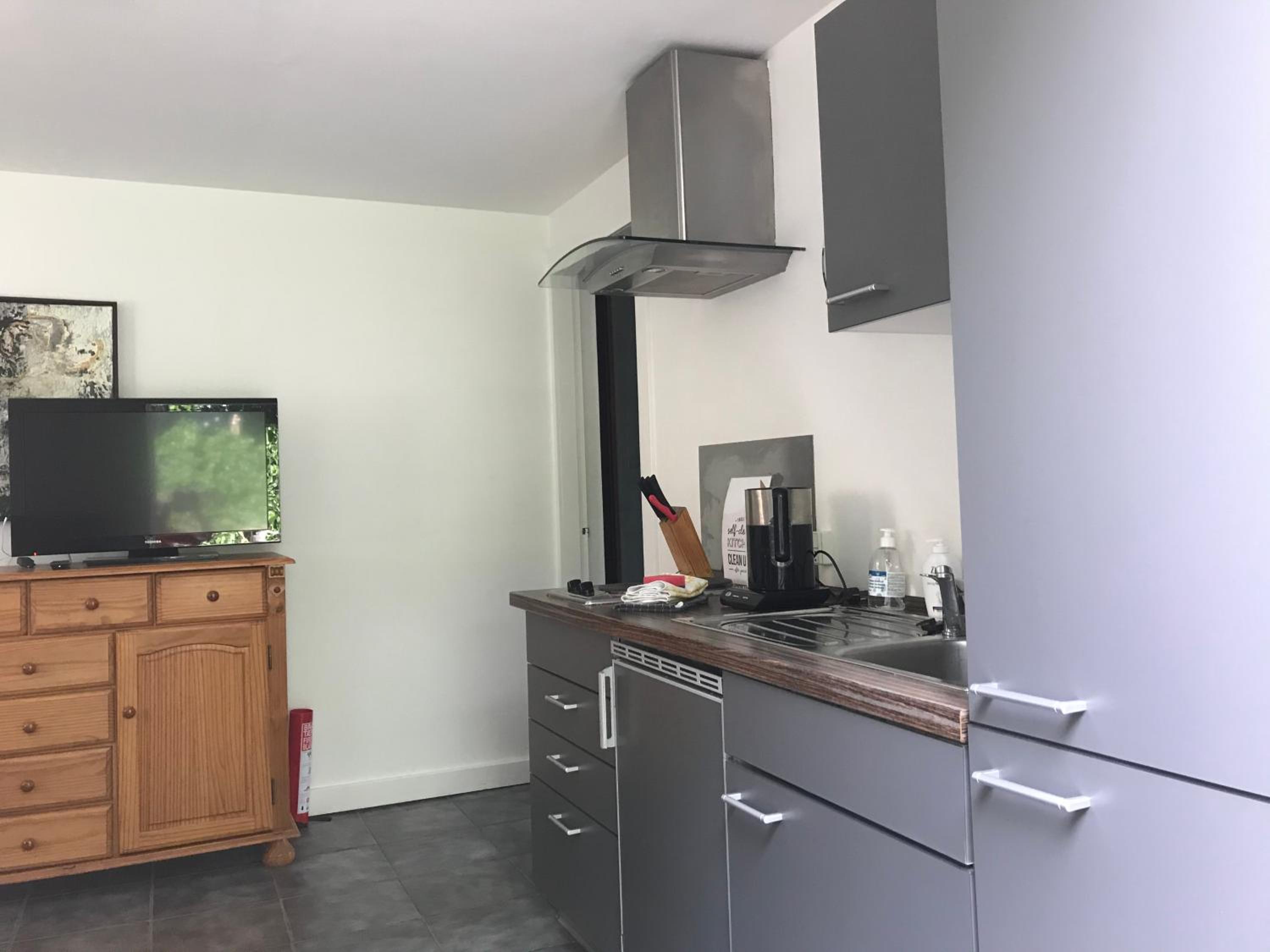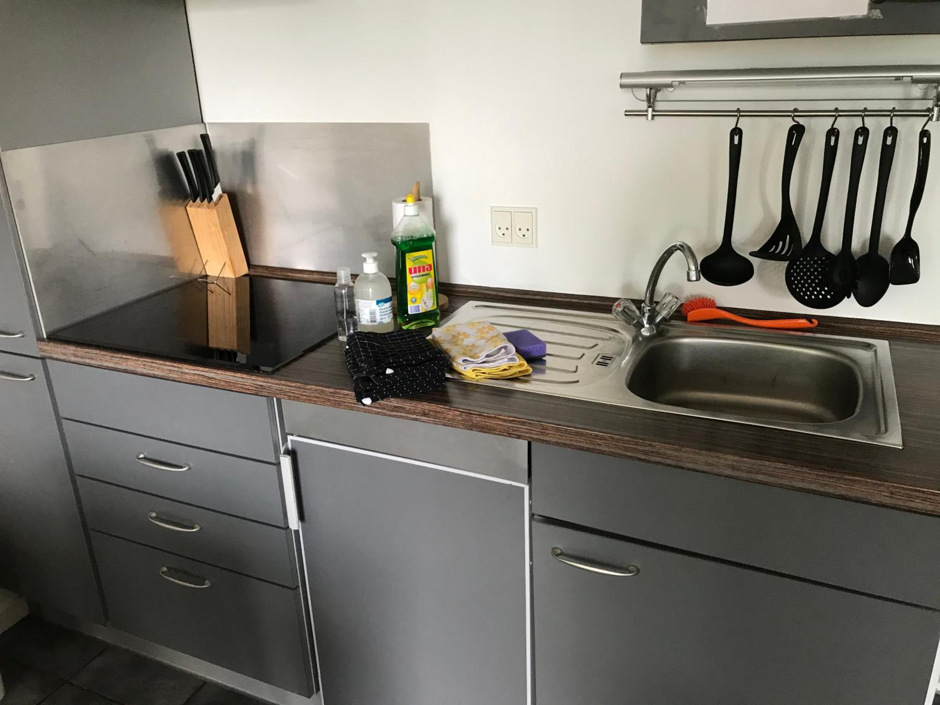 Die Küche war sehr sauber, und Töpfe, Pfannen und Geschirr waren alle vorhanden.