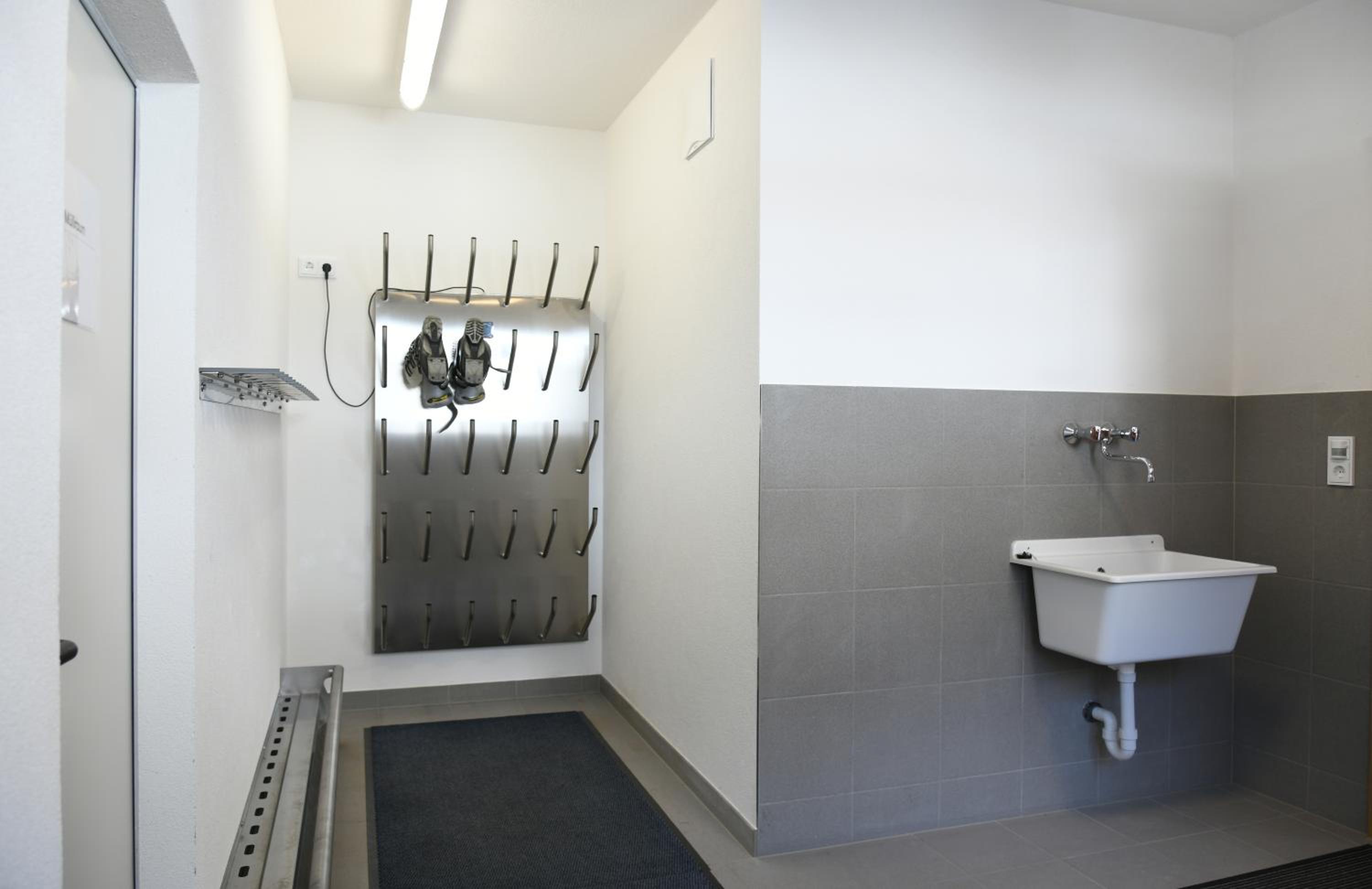 Aparte ruimte bij ingang gebouw voor je skies en schoenen. Prima ligging in het dorp.