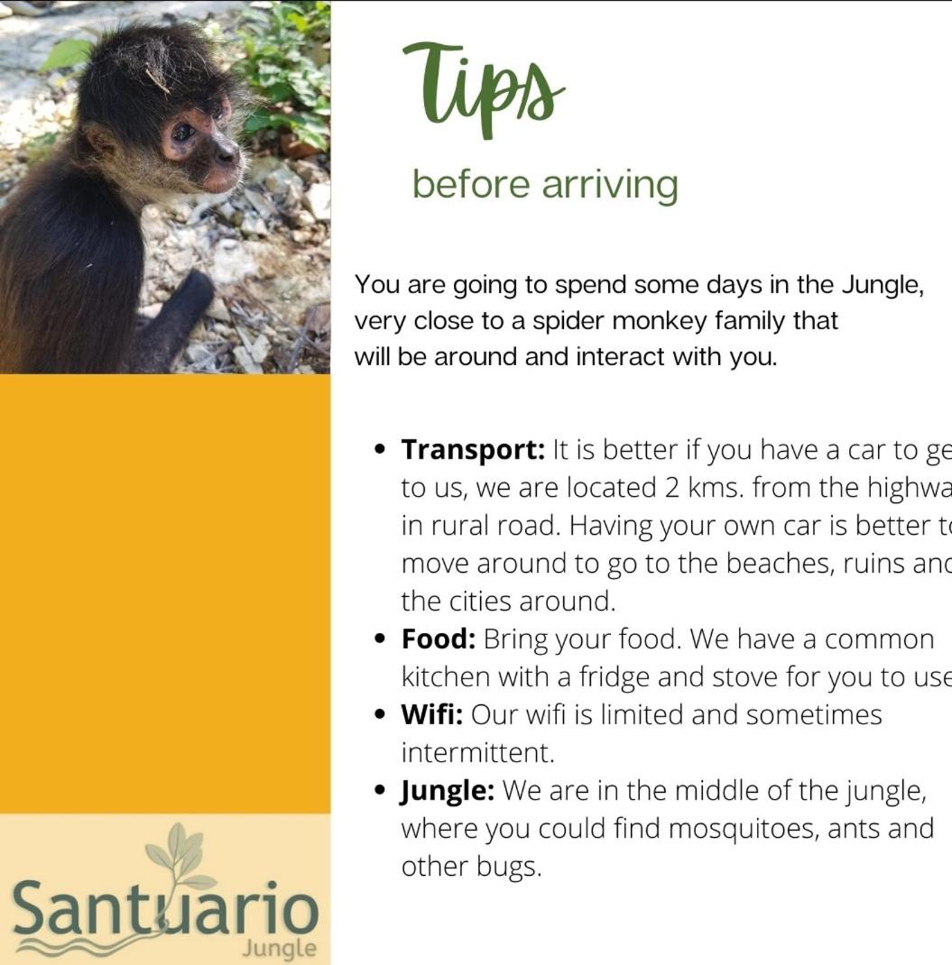It can be tricky to finde the place, you need a car og other transportation. On the main road from Playa del Carmen, about 3-4km before Akumal, there are small signs for different "eco lodges", but not for this one. Follow the dirt road, and you will see signs for Santuario Jungle also. It's about 1-1,5km from the main road. If you miss the dirt road, just follow the main road a bit further towards Akumal and turn back at the nest "Retorno", pass the gas station on your right and do the next "Retorno" towards Akumal again, then drive about 1km and take the dirt road on your right.